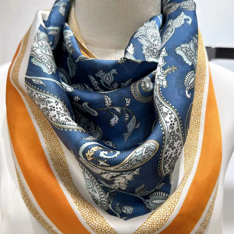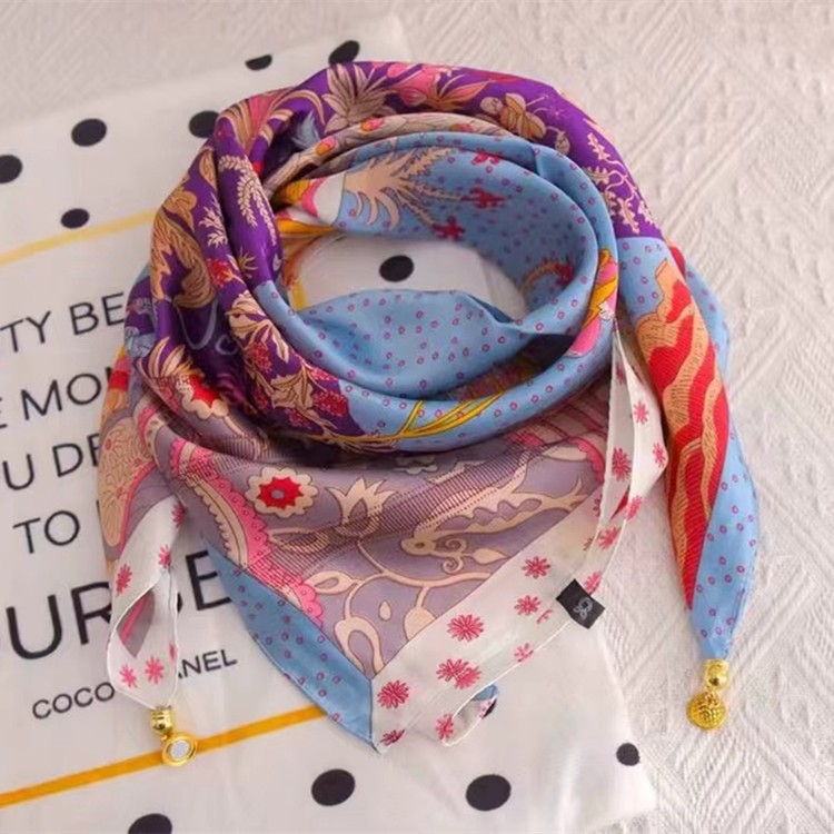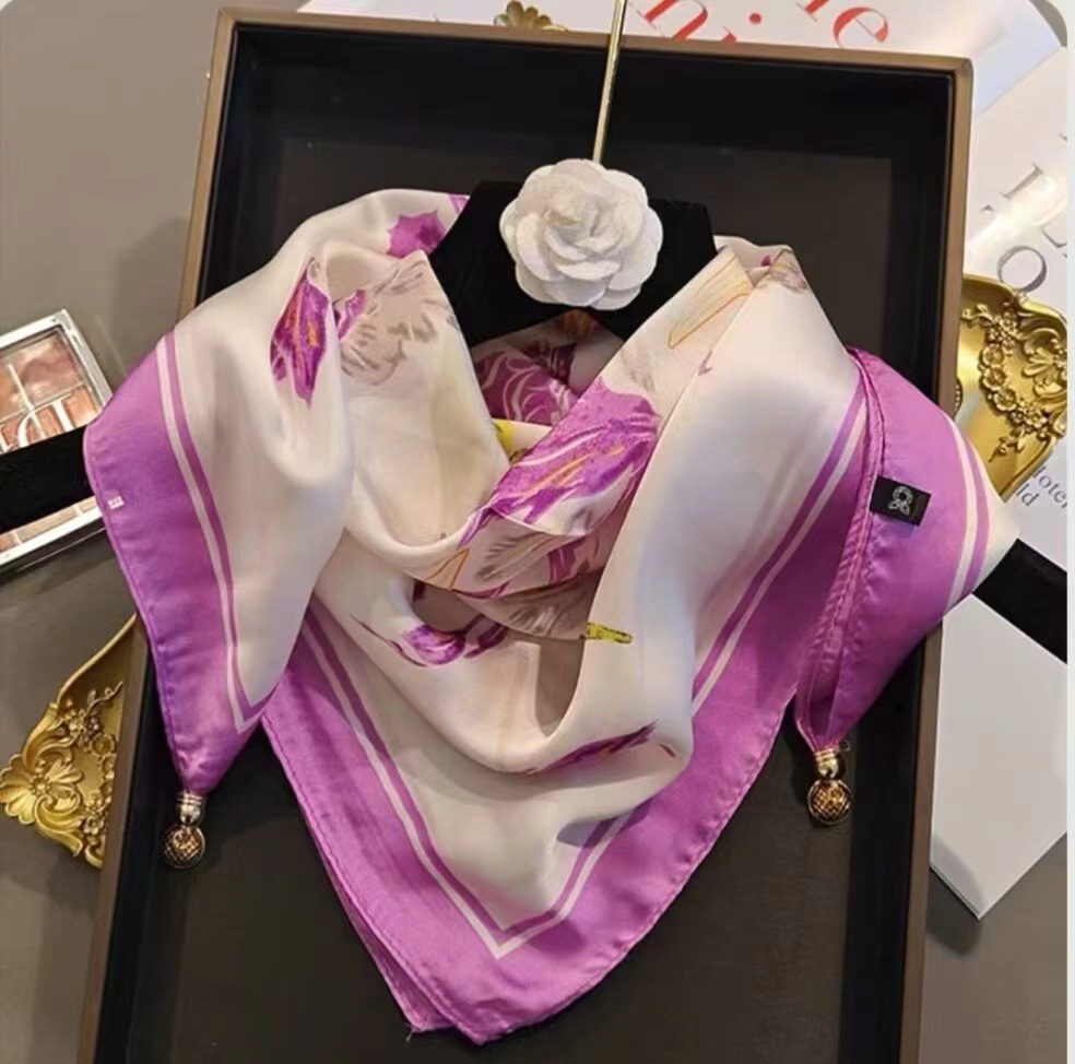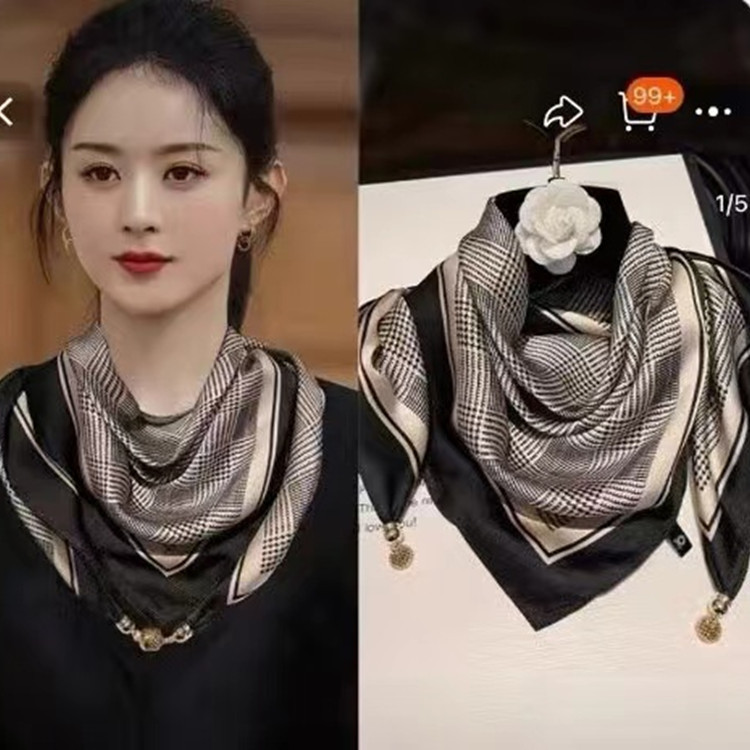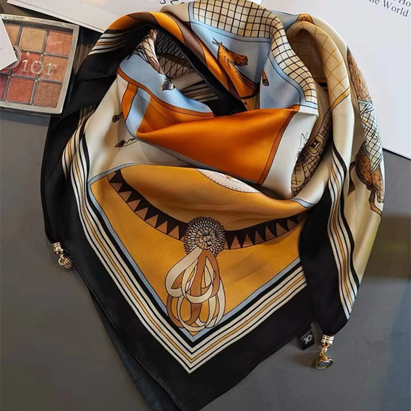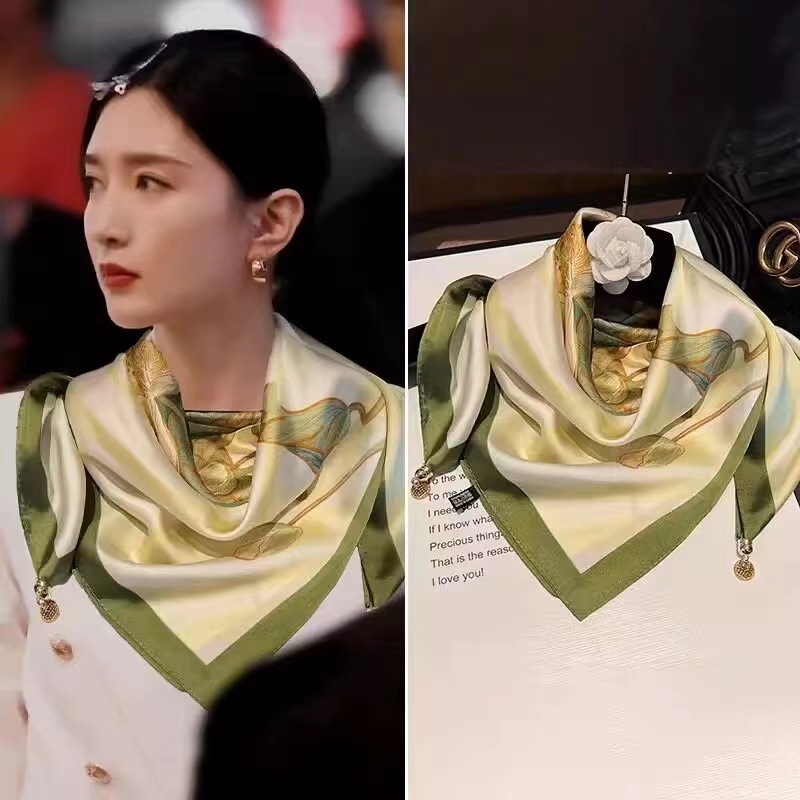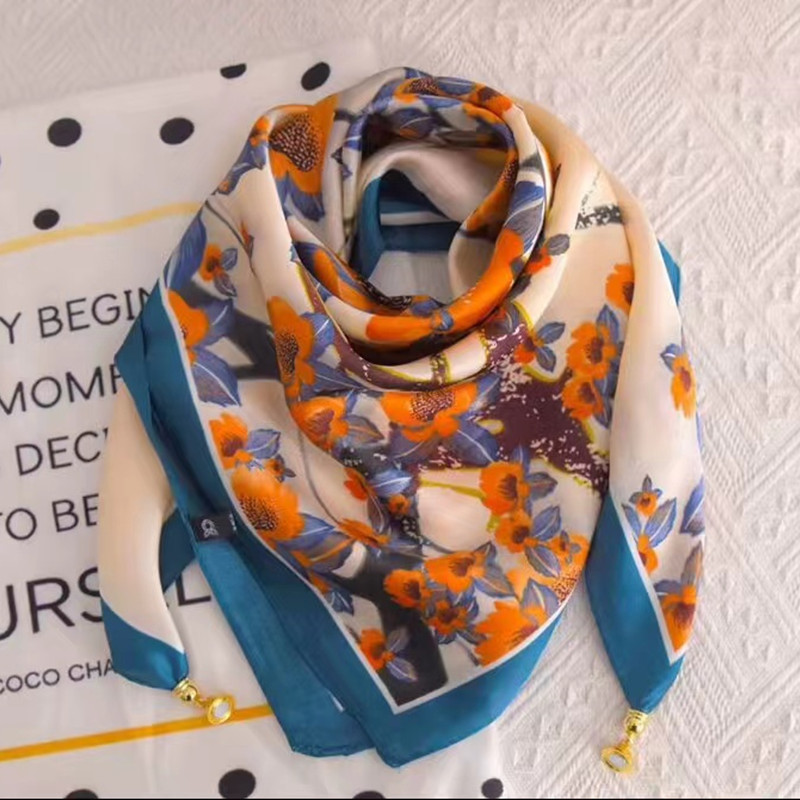 2025 신형 자석 버클 실크 스카프 인기 여성용 사각 스카프 메탈 볼 자석 버클 인조 실크 프린트 얇은 스카프