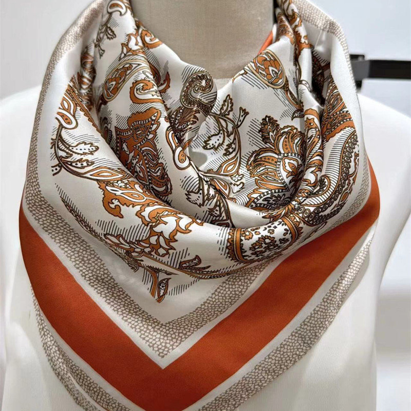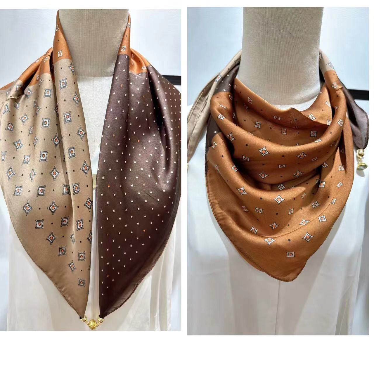 2025 신형 자석 버클 실크 스카프 인기 여성용 사각 스카프 메탈 볼 자석 버클 인조 실크 프린트 얇은 스카프스토어 가기