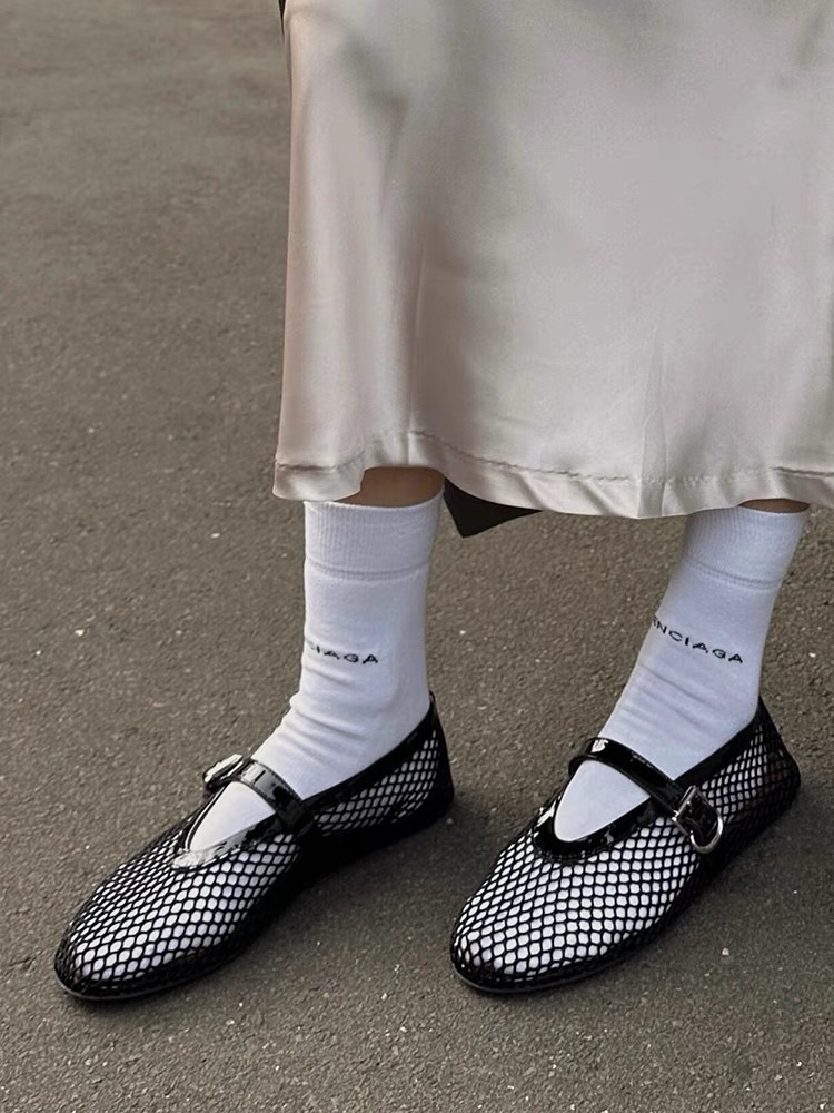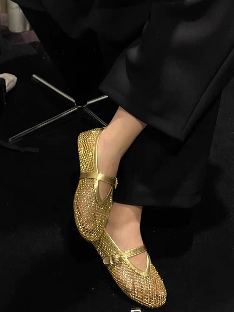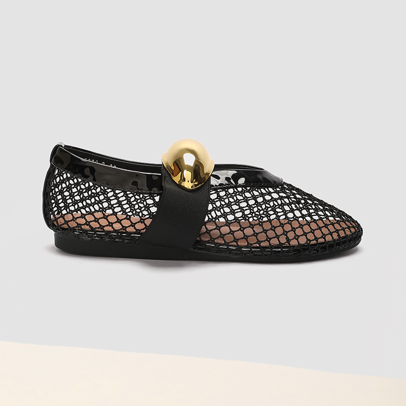 Cowhide 둥근 발가락 틈새 물고기 메쉬 중공 발레 신발 여성의 새로운 유행 간단한 플랫 벨트 버클 신발스토어 가기