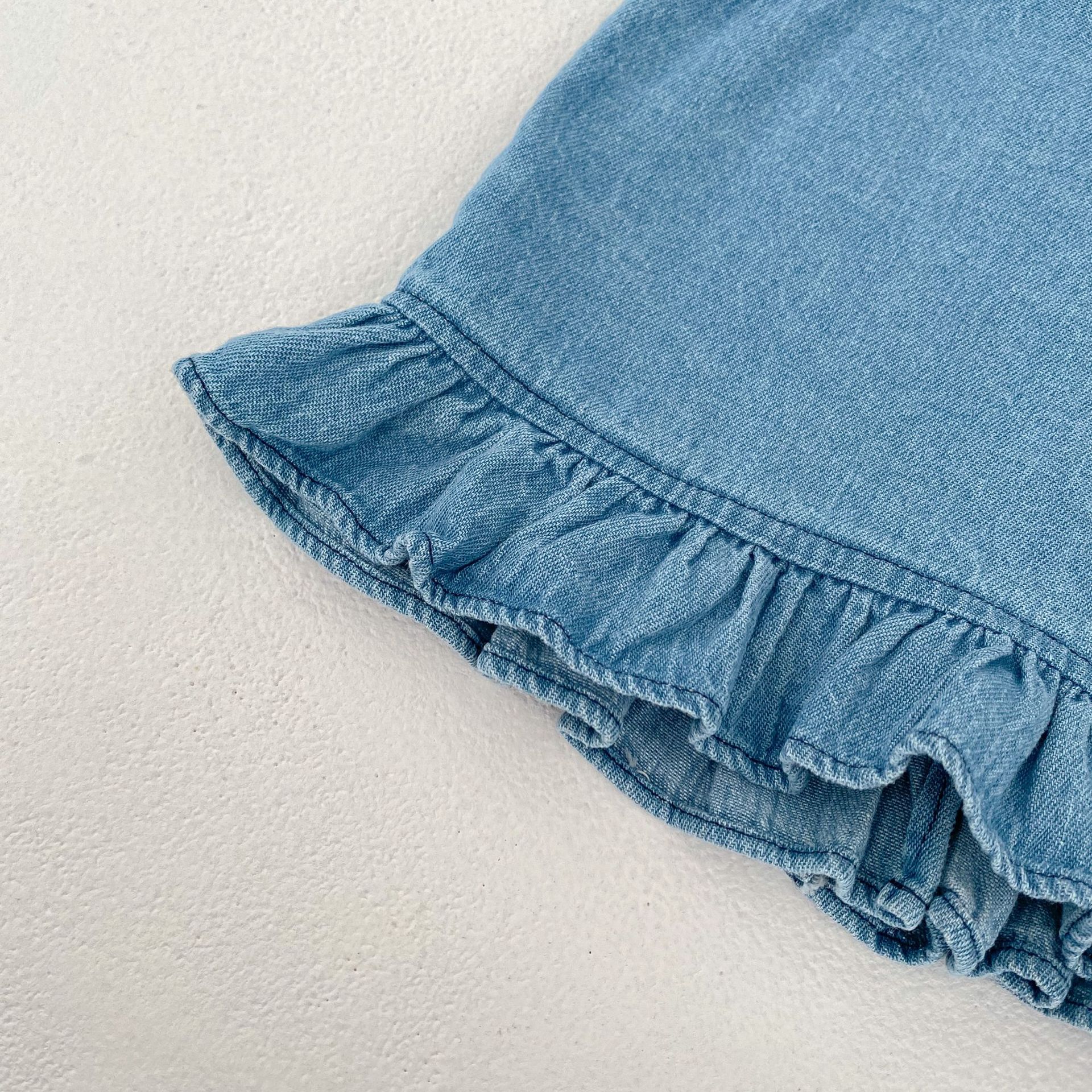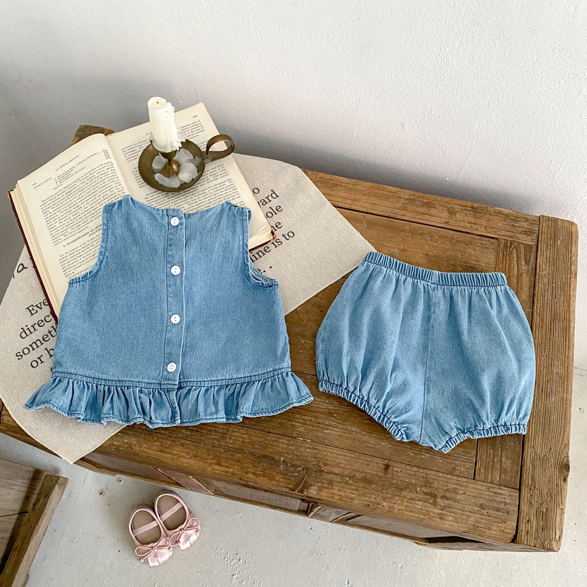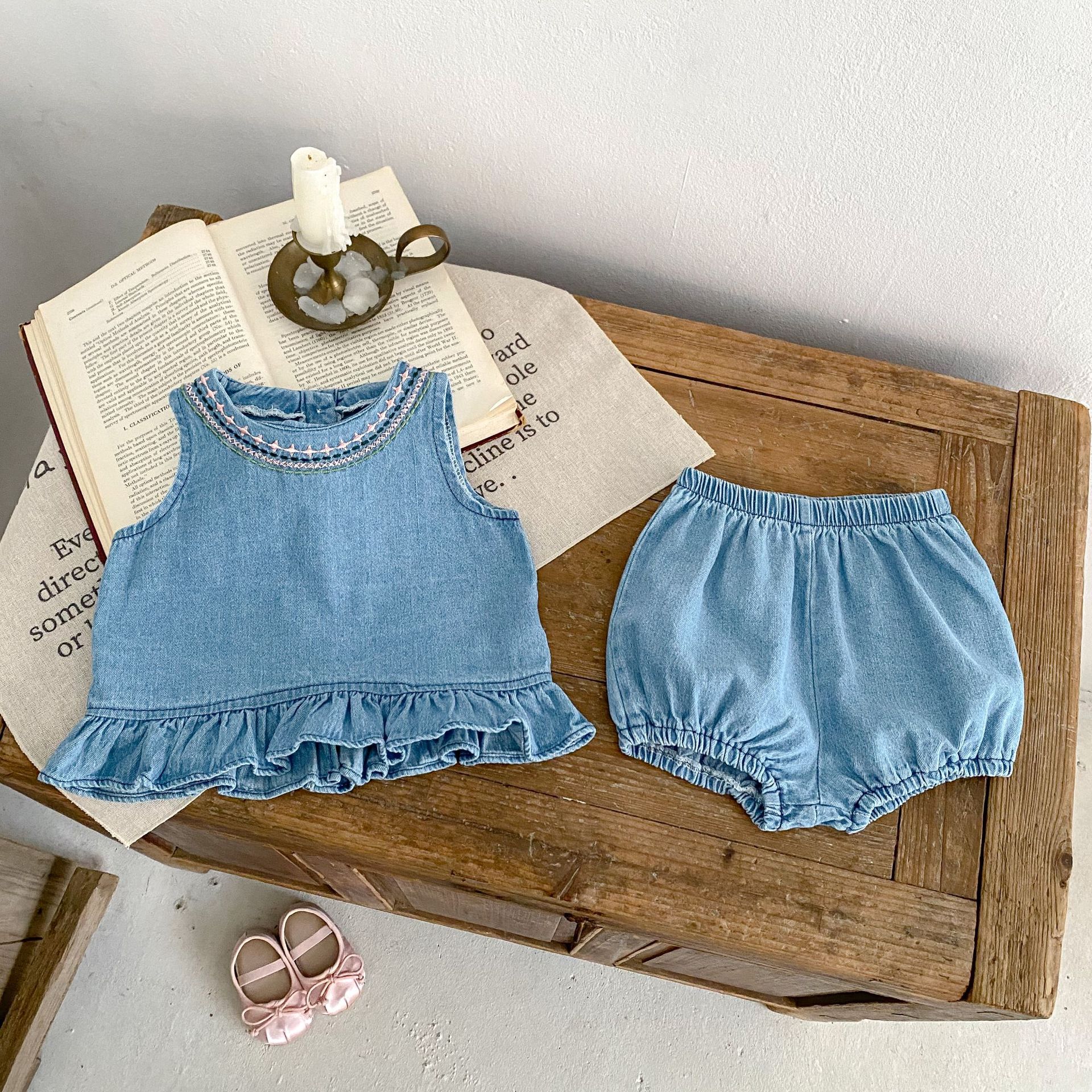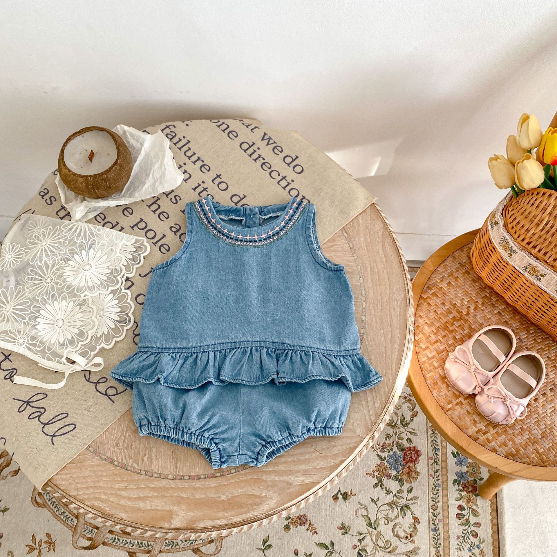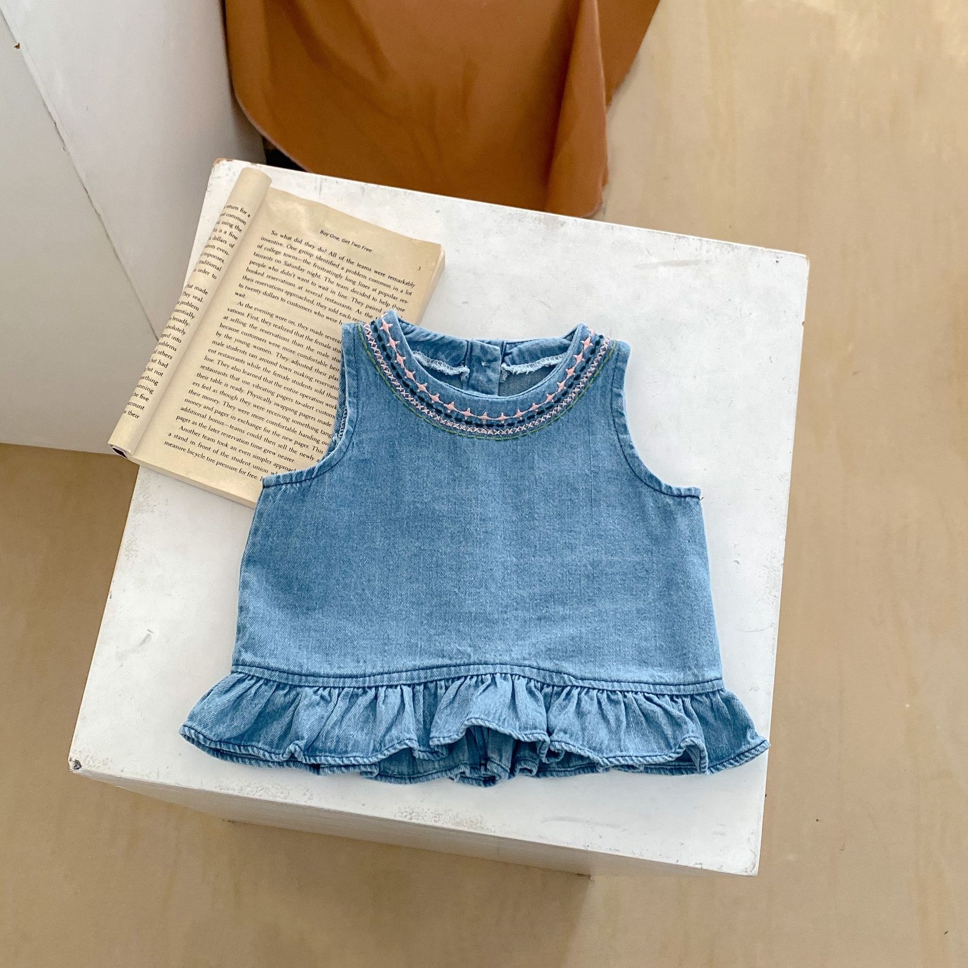 2025 여름 인기 아동 의류 유아 및 어린이를위한 수 놓은 부드러운 데님 아기 소녀 면화 달콤한 민소매 양복