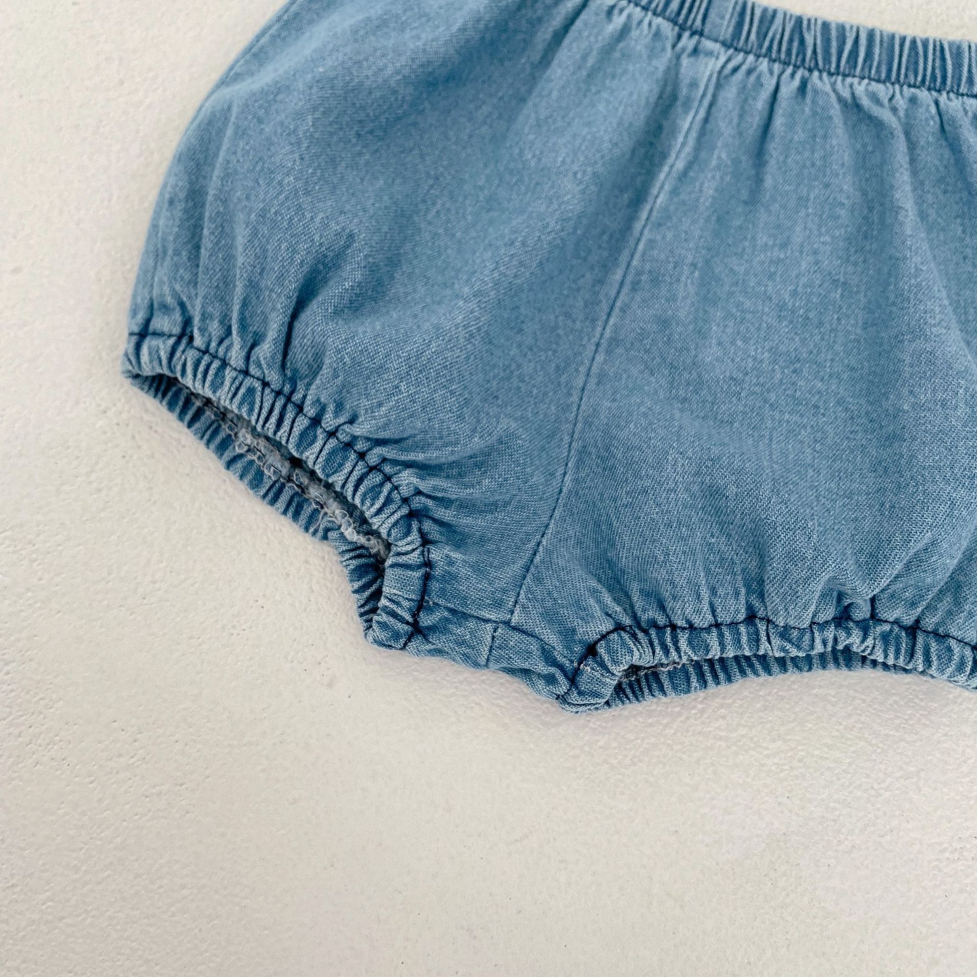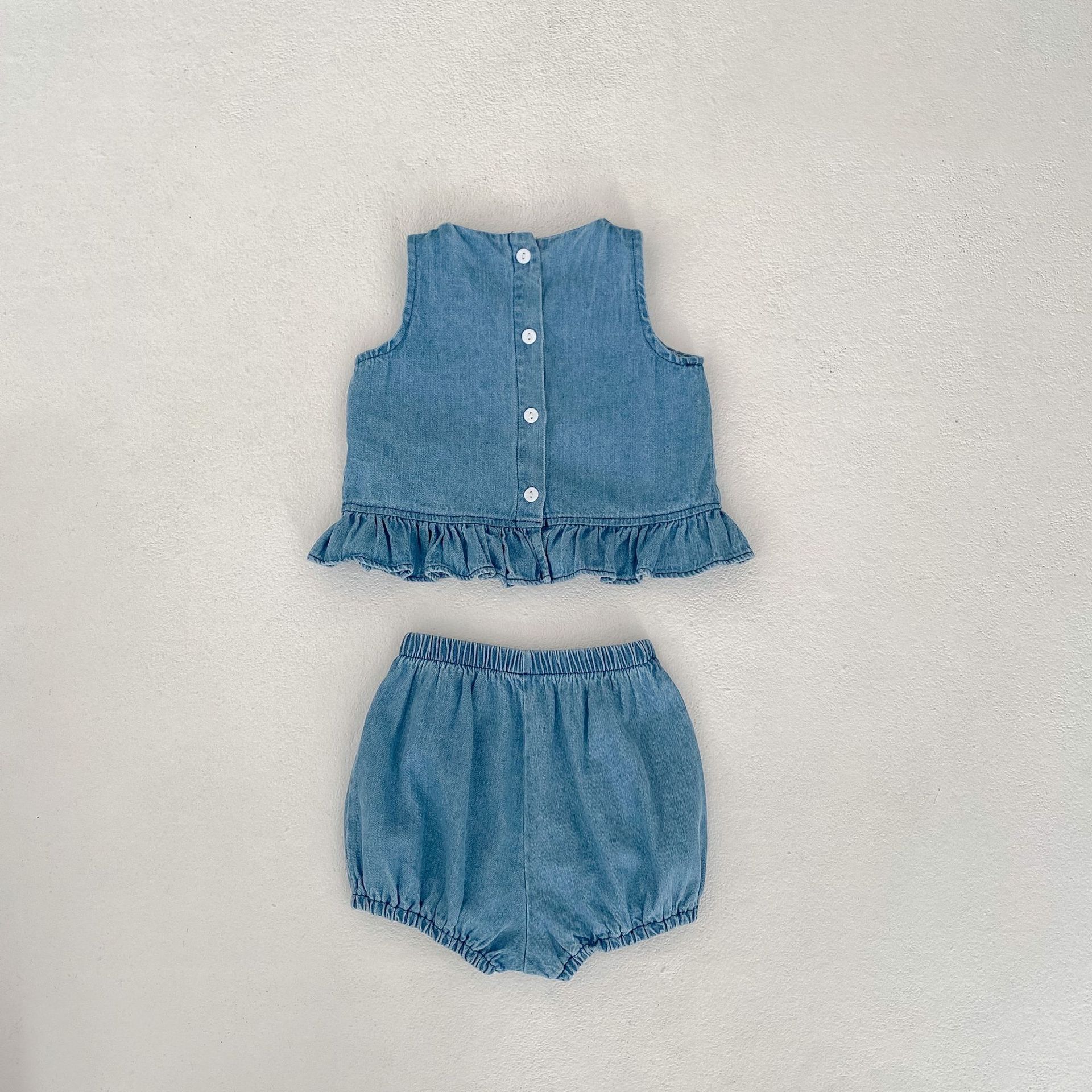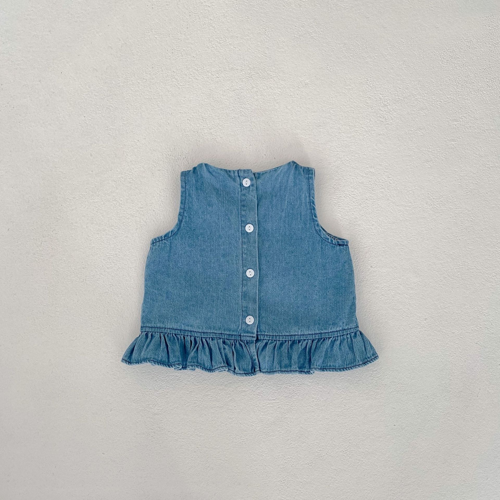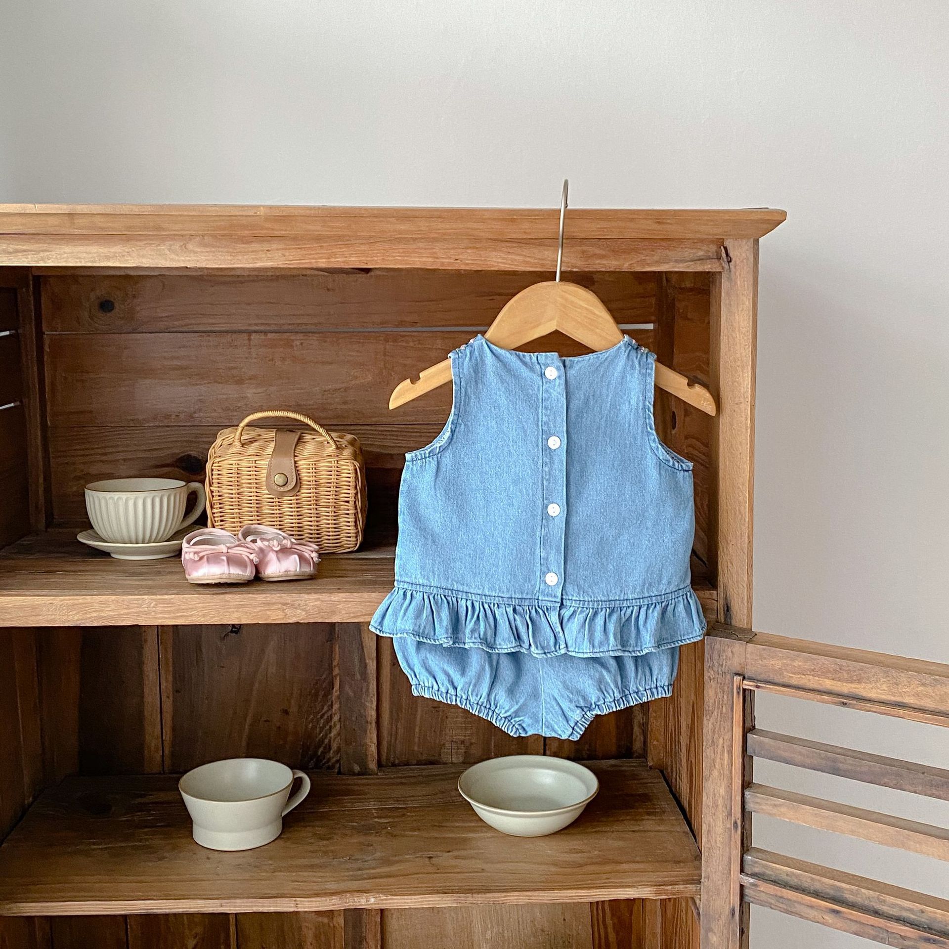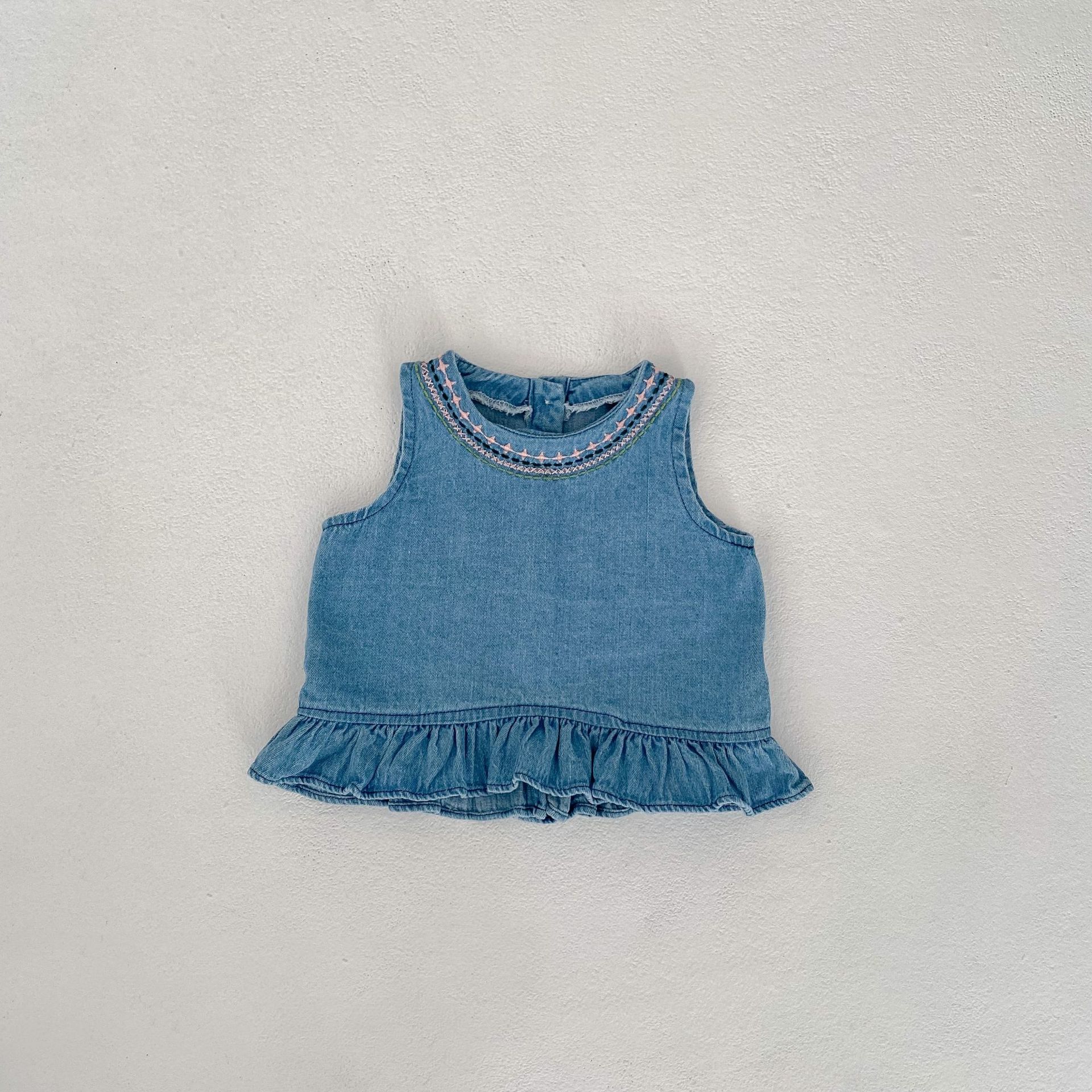 2025 여름 인기 아동 의류 유아 및 어린이를위한 수 놓은 부드러운 데님 아기 소녀 면화 달콤한 민소매 양복