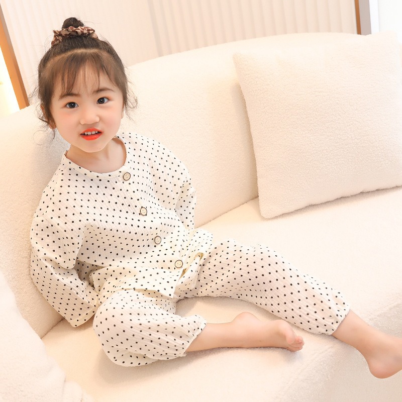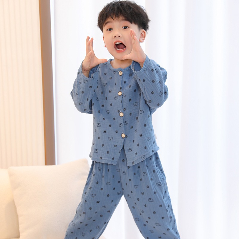 클래스 A 순면 어린이 얇은 홈 의류 자른 소매 더블 레이어 코튼 거즈 어린이 파자마 홈 의류 블루머스 세트