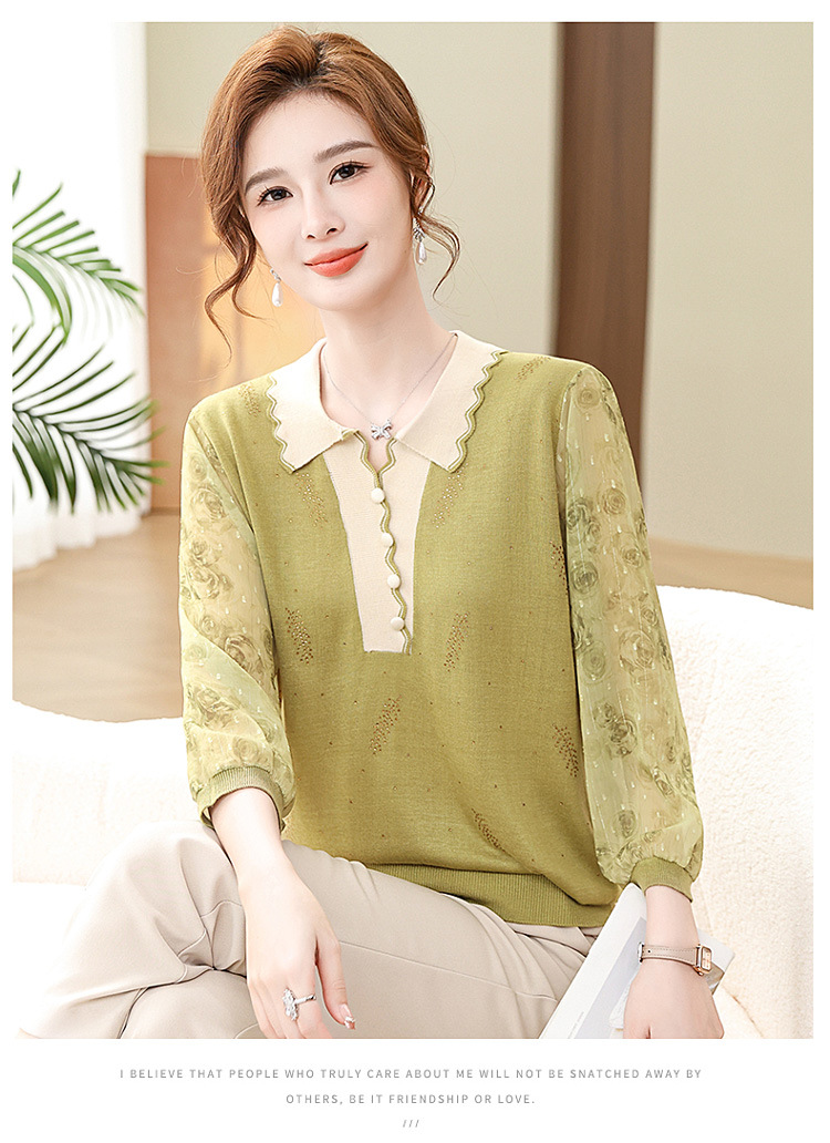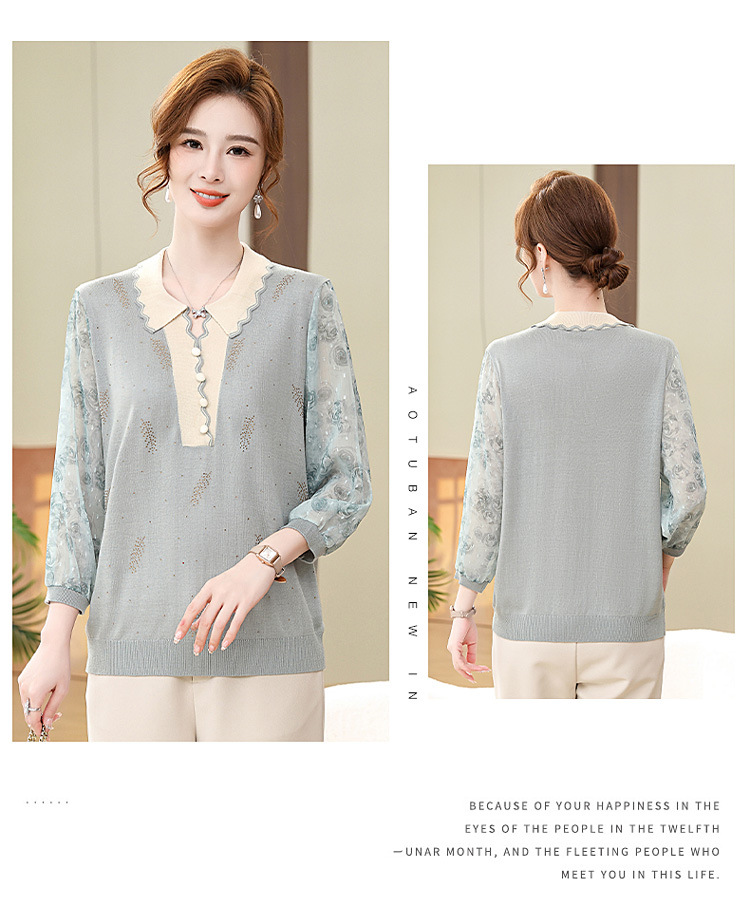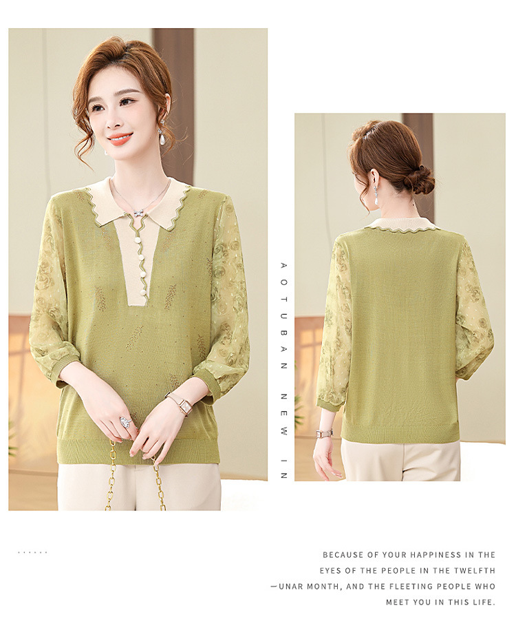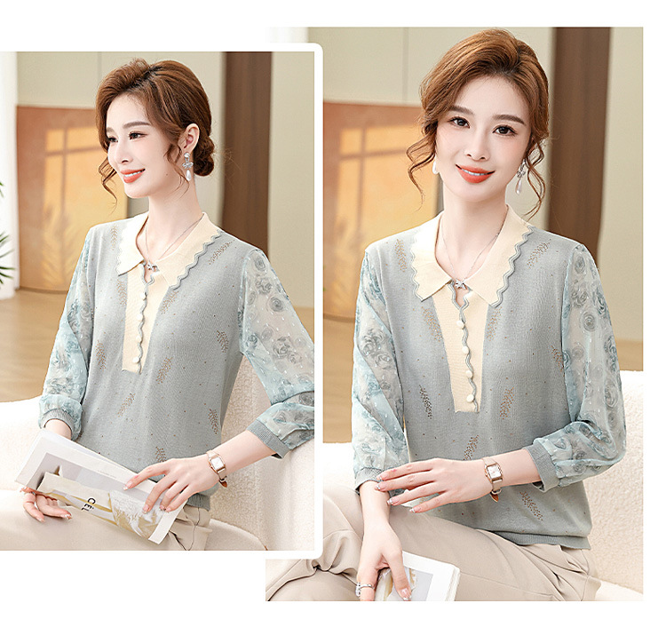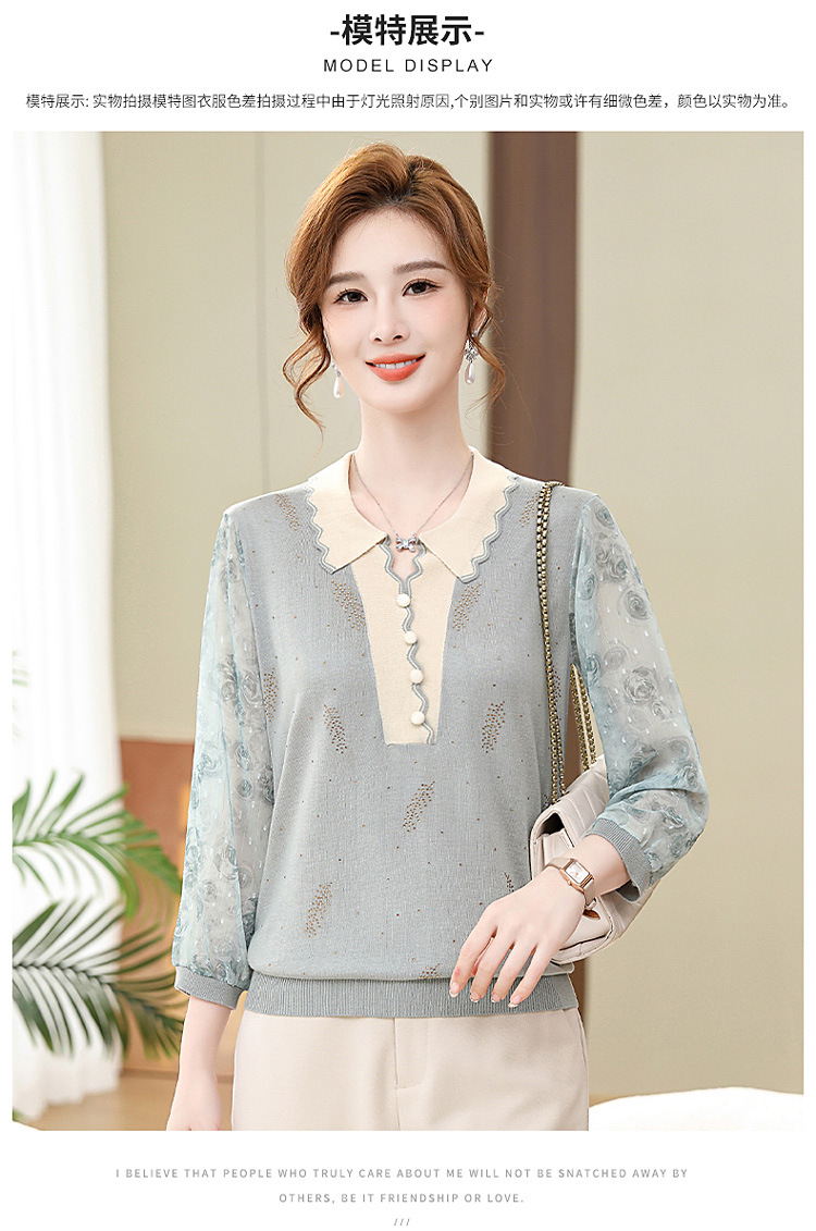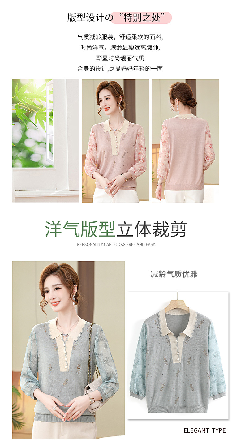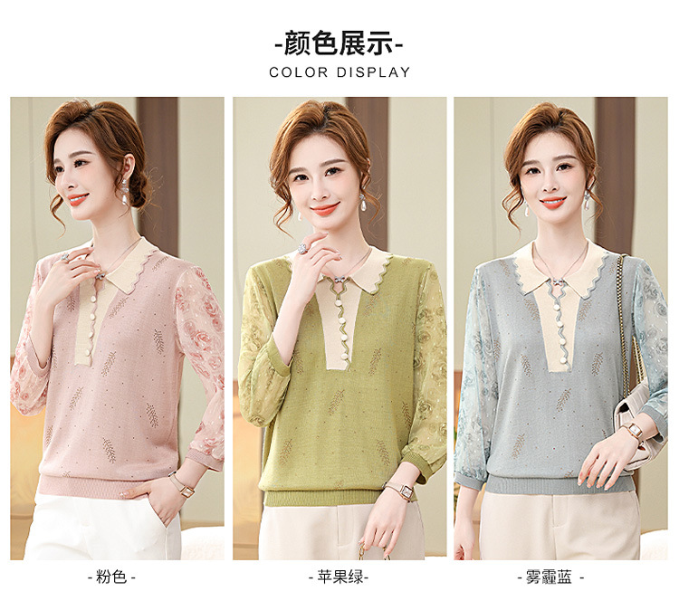 중년 엄마는 봄 새 옷깃 탑 중년 및 노인 여성 여름 니트웨어 3/4 소매 기질 작은 셔츠를 입습니다.스토어 가기