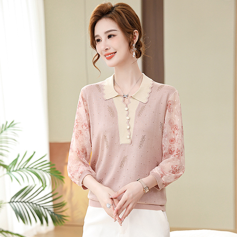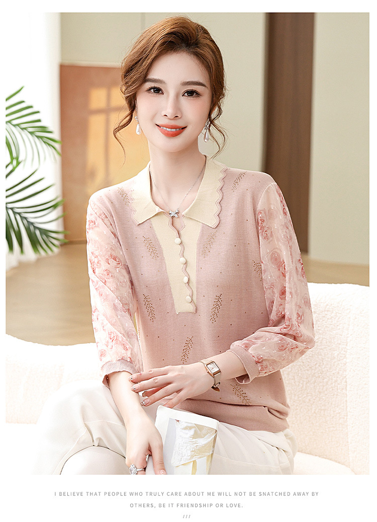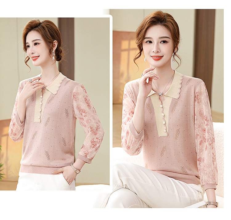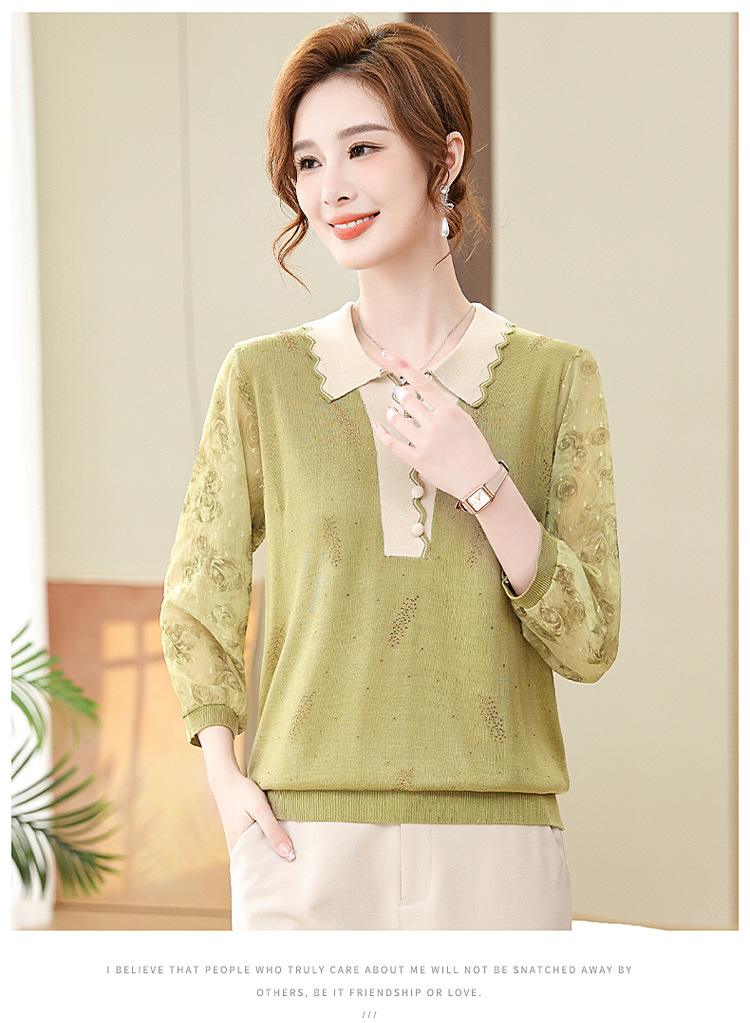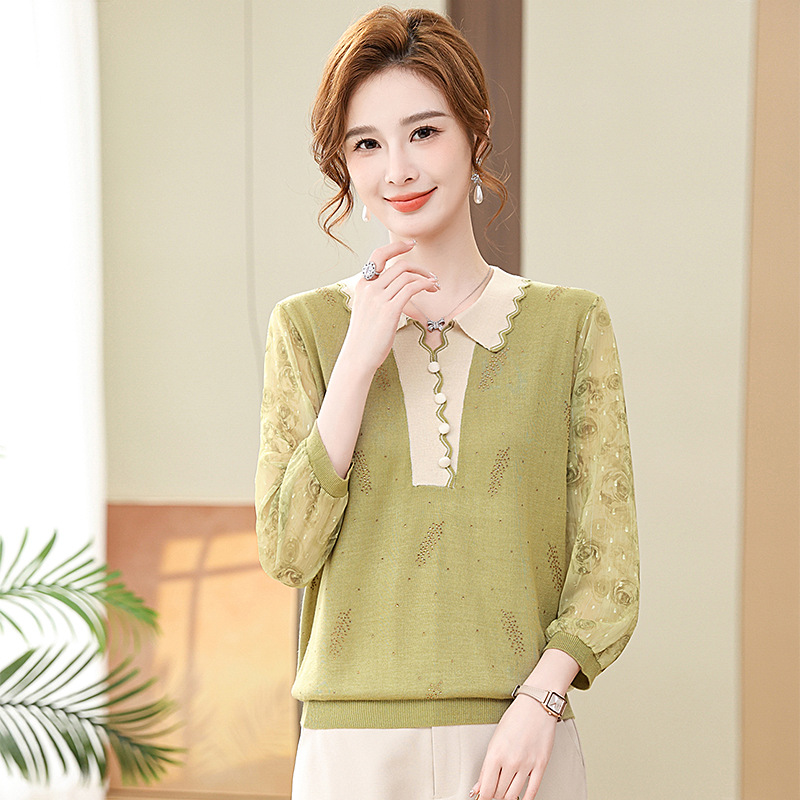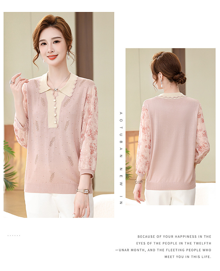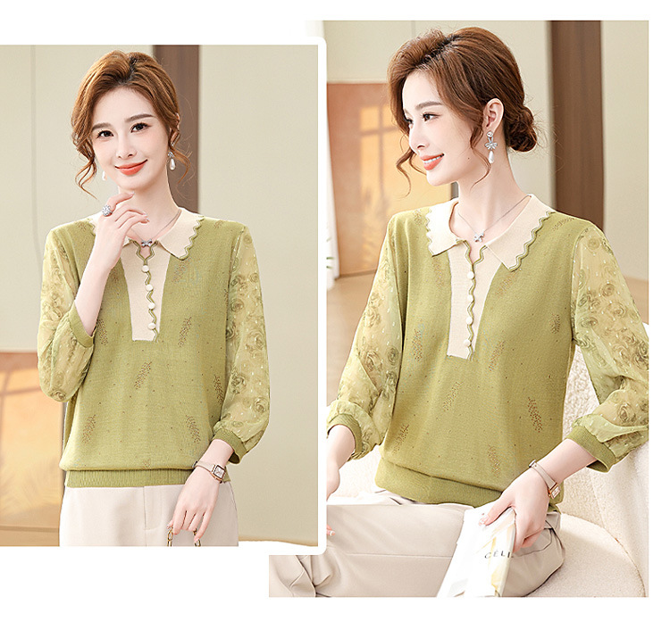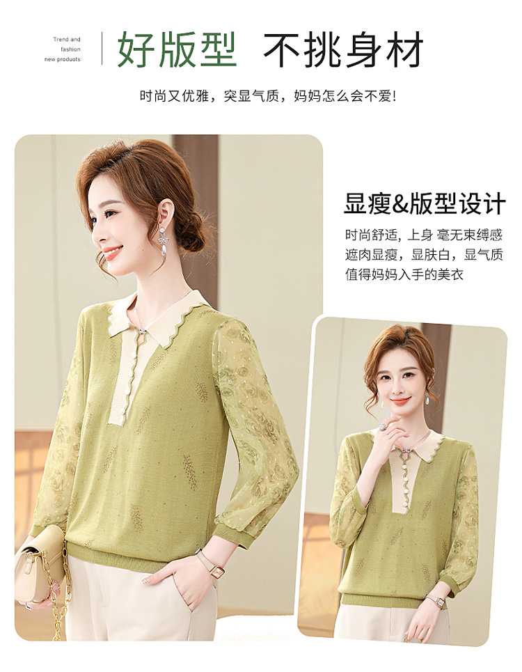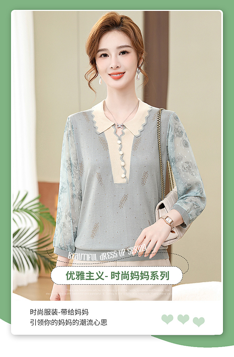 중년 엄마는 봄 새 옷깃 탑 중년 및 노인 여성 여름 니트웨어 3/4 소매 기질 작은 셔츠를 입습니다.스토어 가기