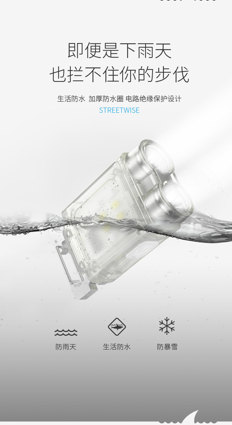 照明模式:强光-弱光-爆闪 LED侧灯:白光LED+红光LED+蓝光LED