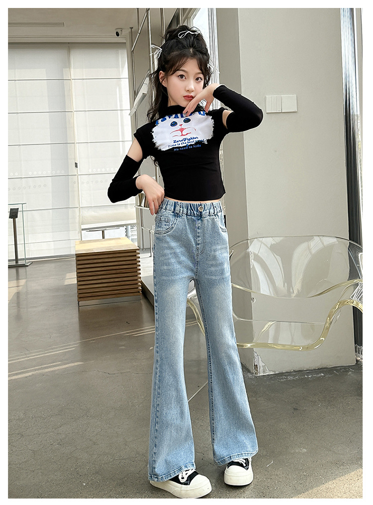 소녀 데님 메쉬 플레어 팬츠 봄 2024 새 소녀 유행 바지 어린이 스트레치 플레어 팬츠스토어 가기
