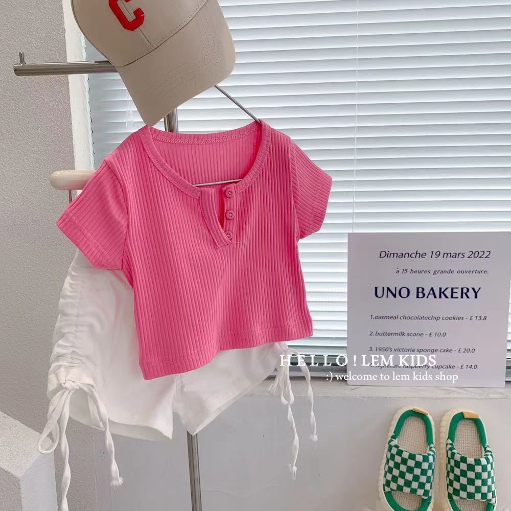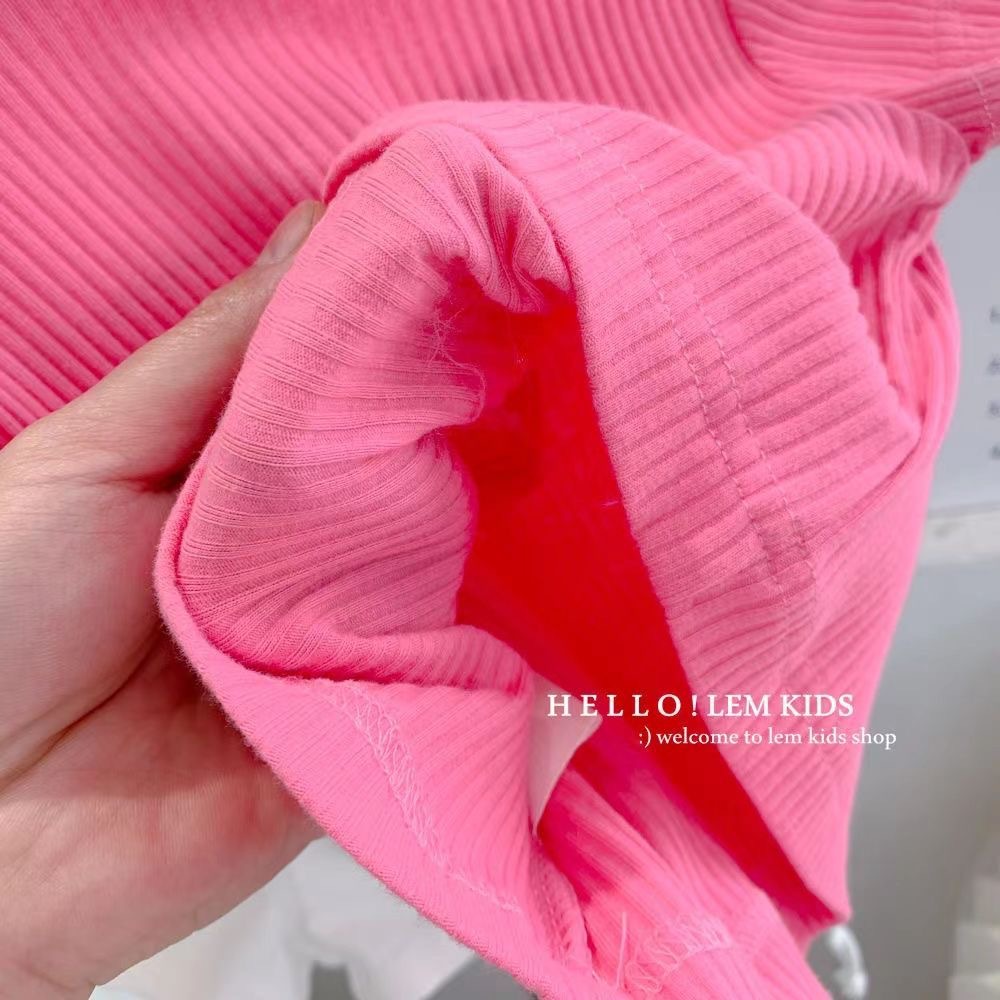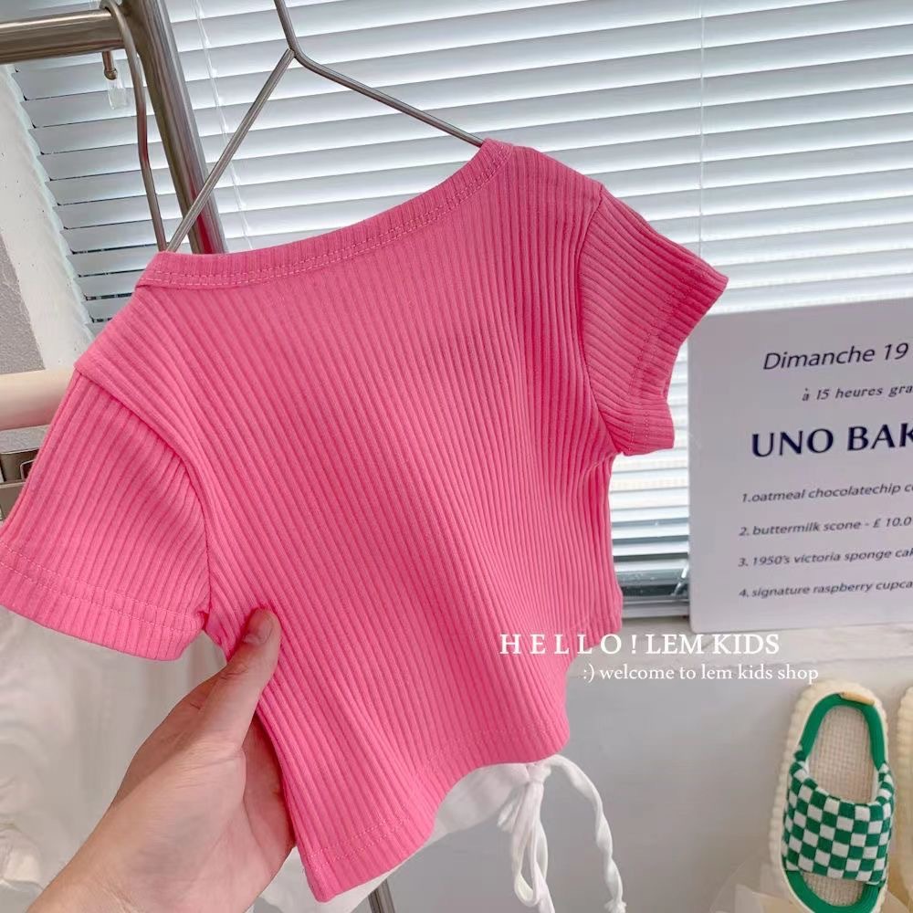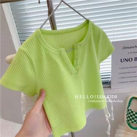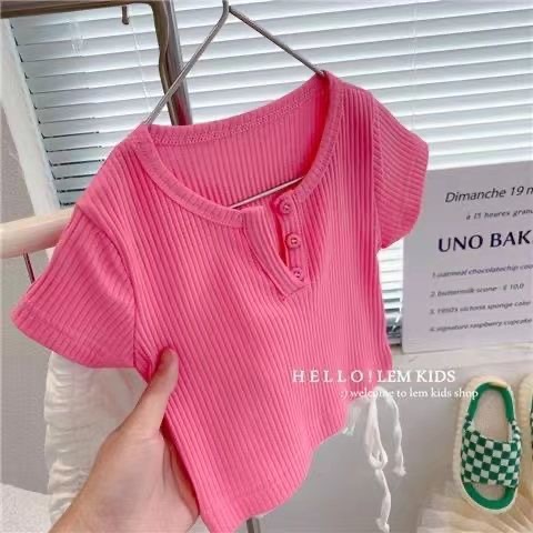 소녀의 여름 새로운 반팔 티셔츠 소녀의 유행 올 매치 단색 셔츠 어린이 캔디 컬러 반팔 T