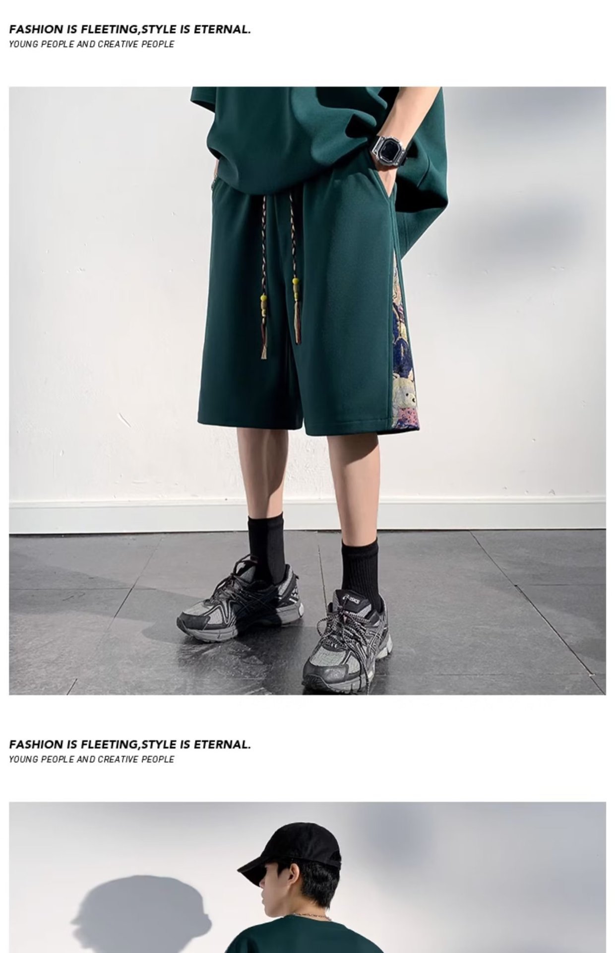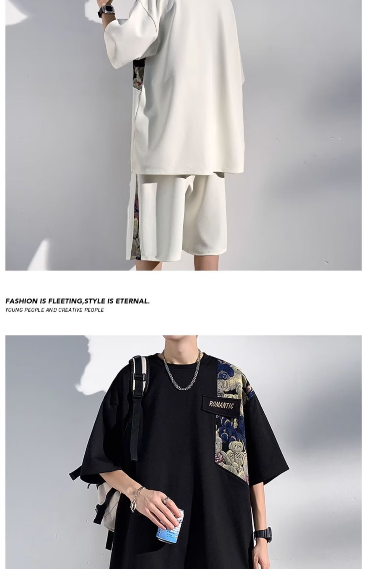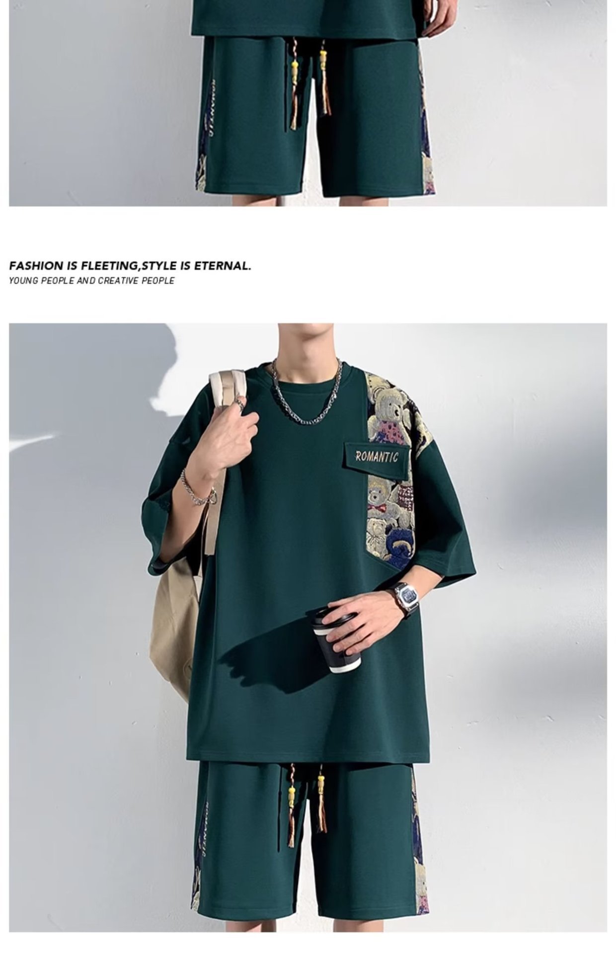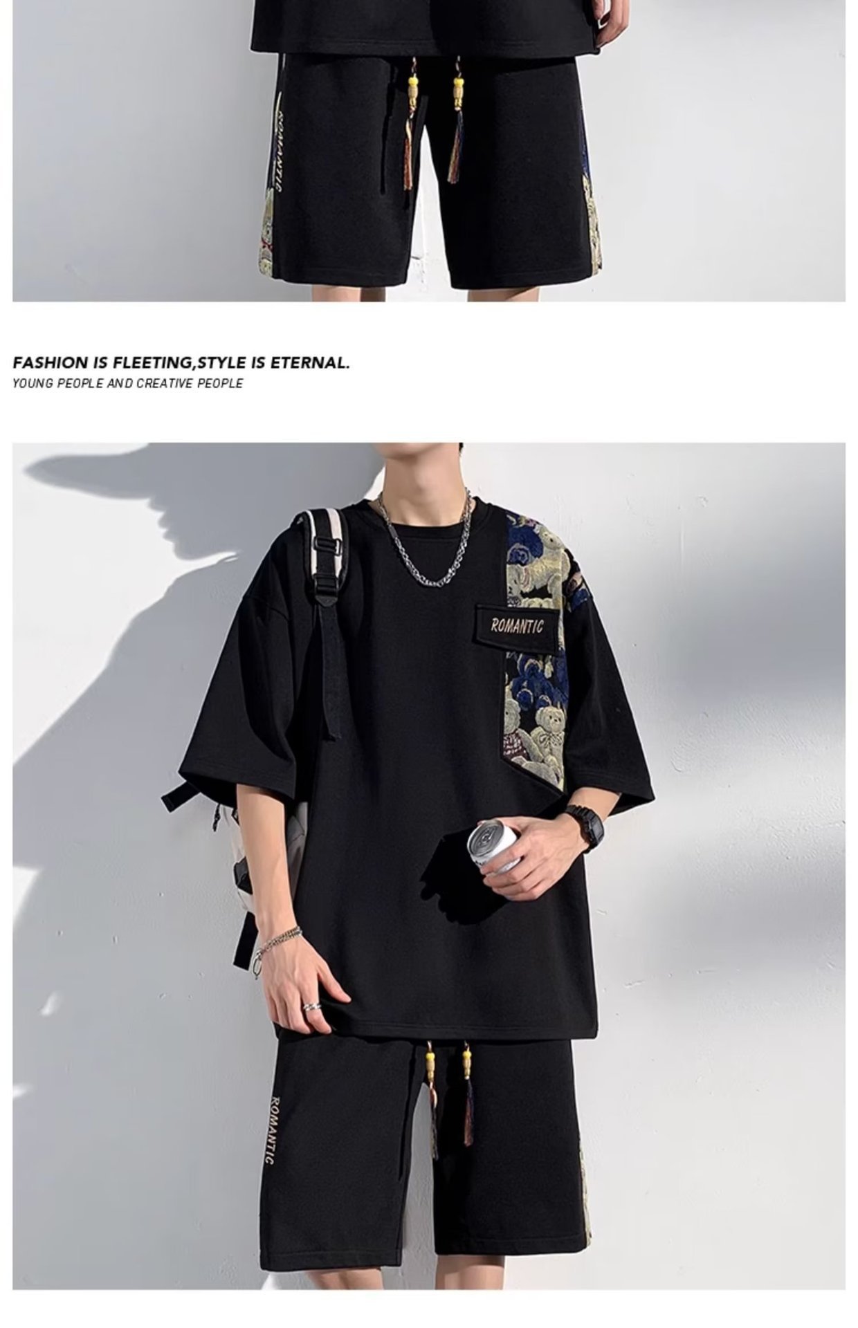 전국 패션 곰 세트 남성 여름 패션 브랜드 스티칭 중국 스타일 투피스 느슨한 캐주얼 플러스 사이즈 짧은 소매 반바지