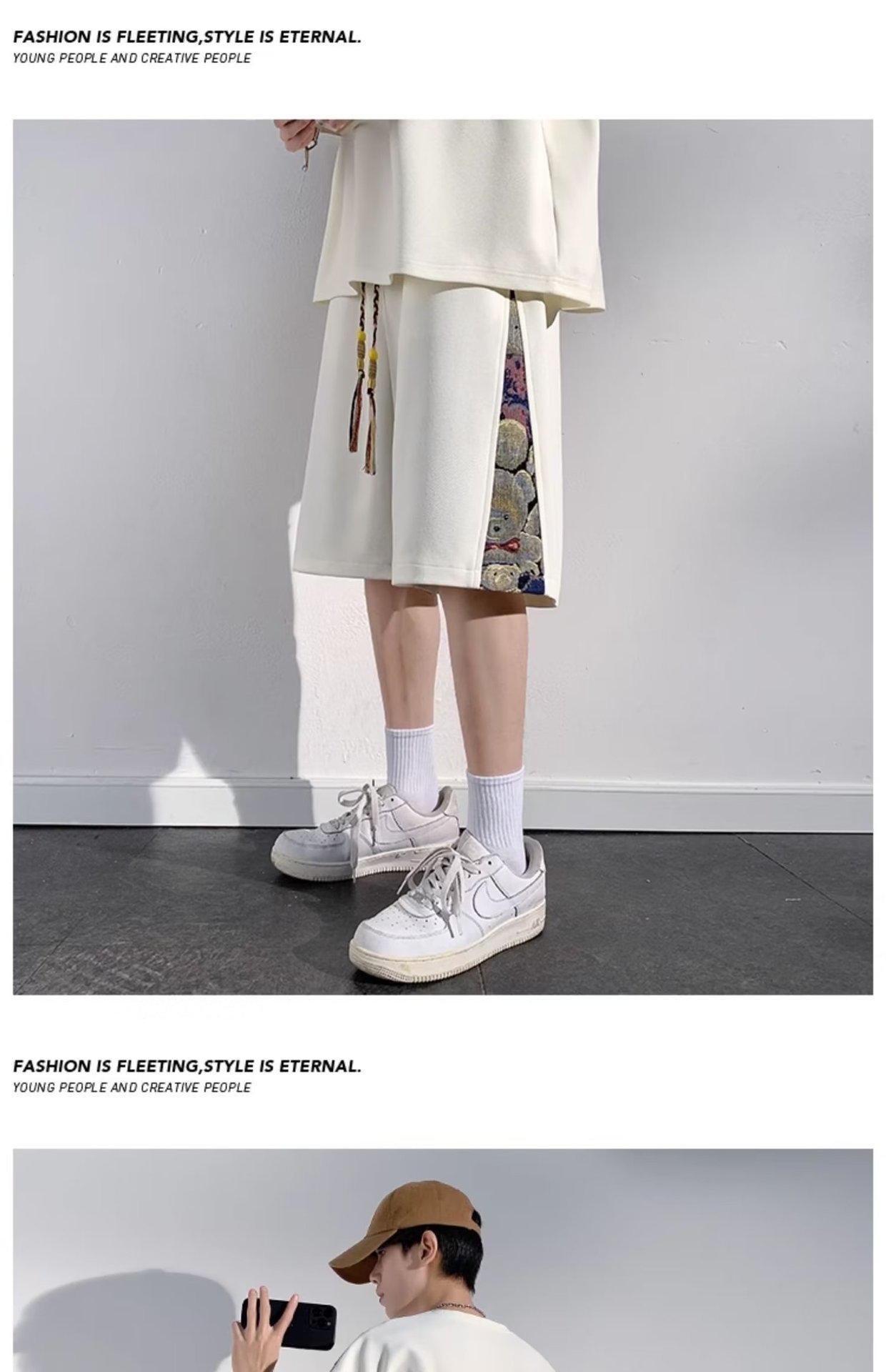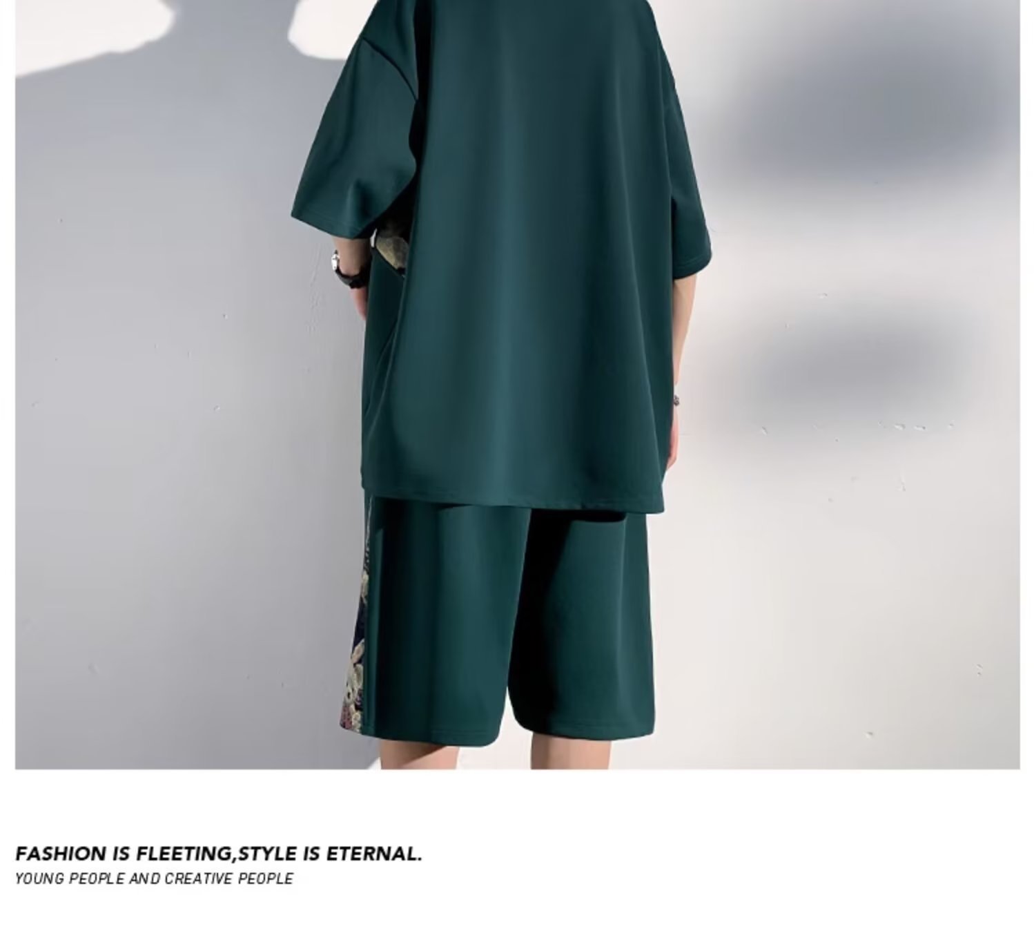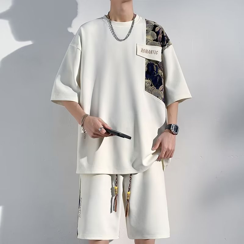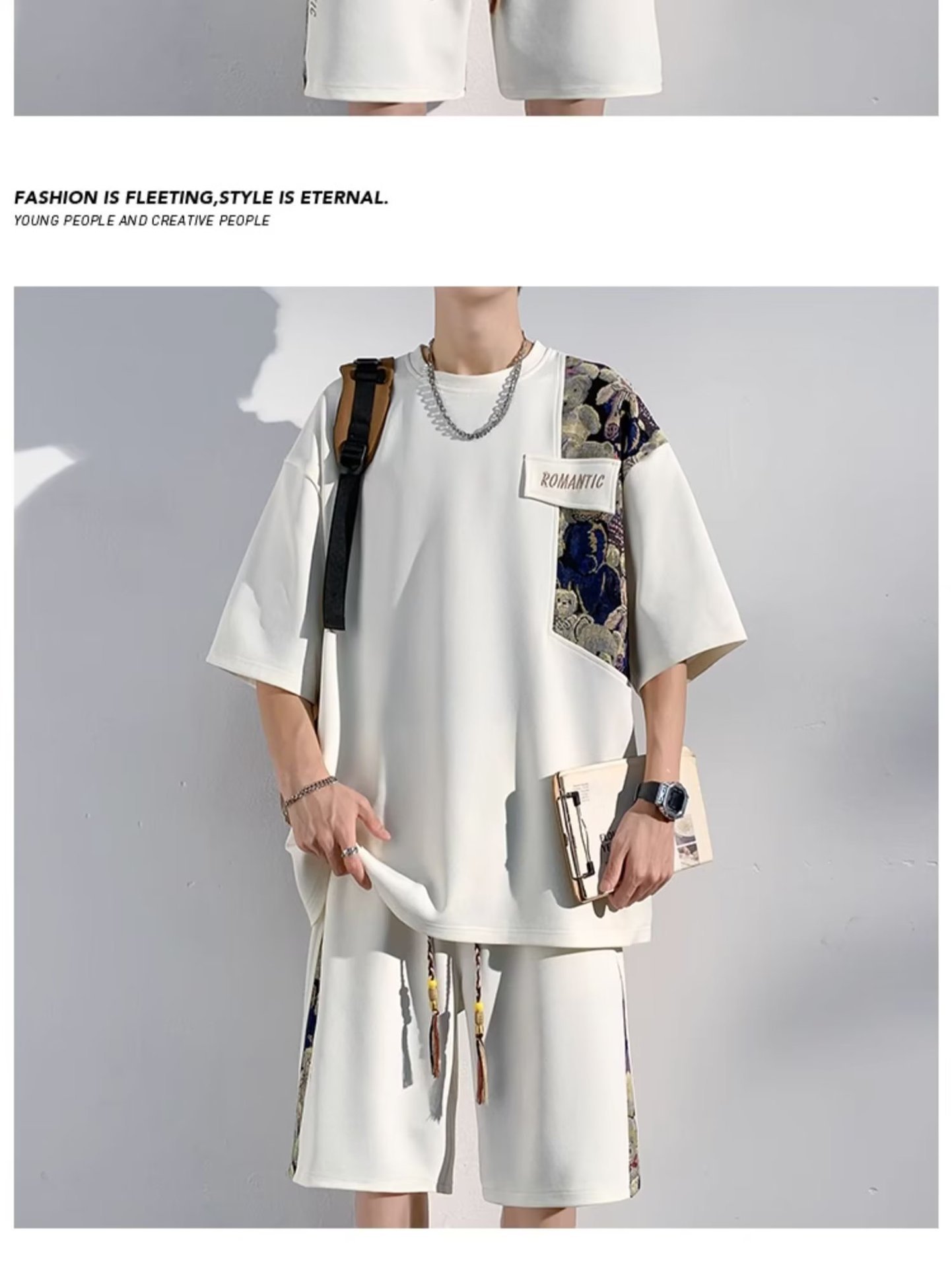 전국 패션 곰 세트 남성 여름 패션 브랜드 스티칭 중국 스타일 투피스 느슨한 캐주얼 플러스 사이즈 짧은 소매 반바지