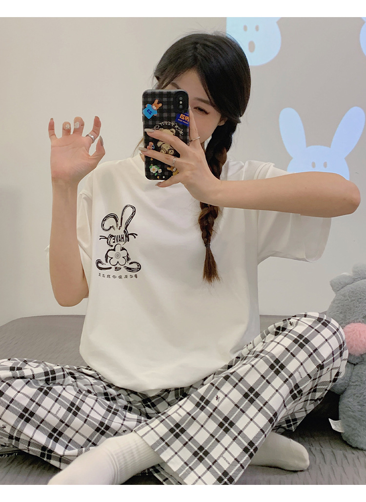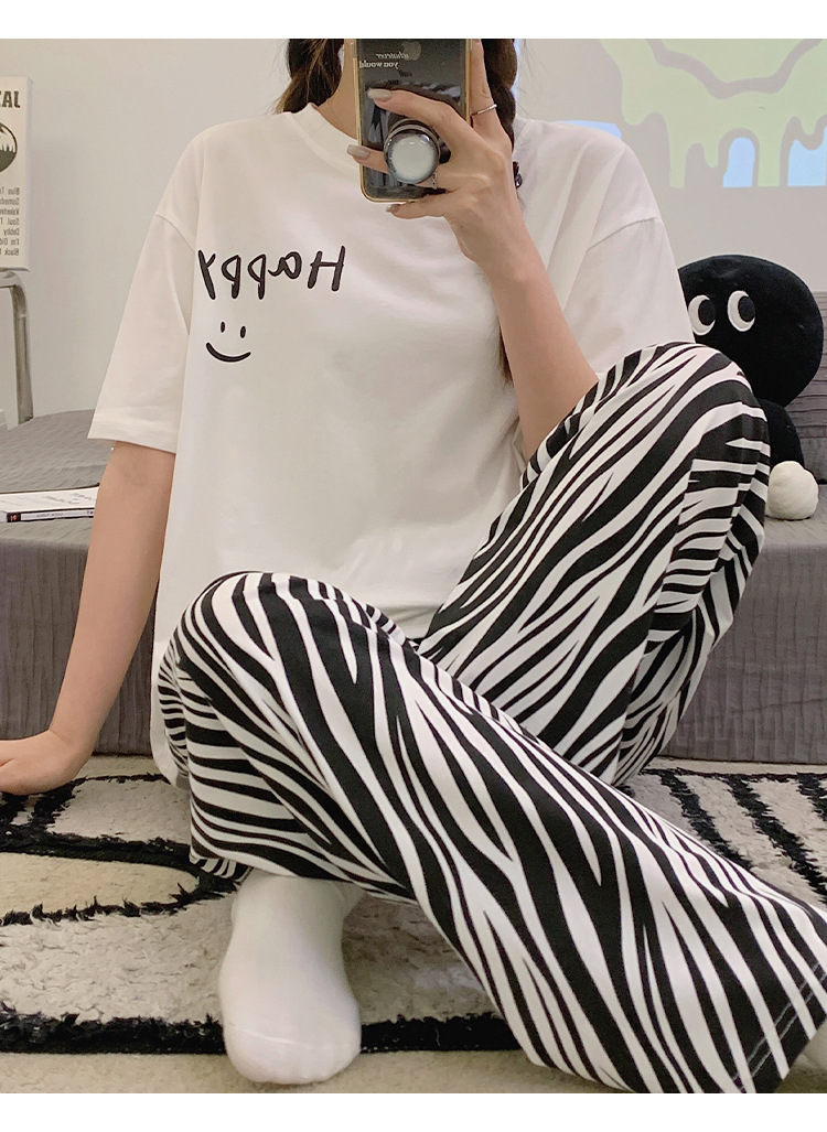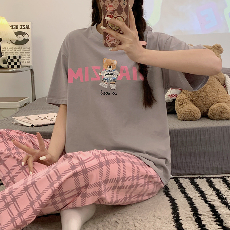 여자 잠옷 여자 봄 여름 반팔 바지 면화 얇은 만화 중학생 18 세 고등학생 가정복 세트