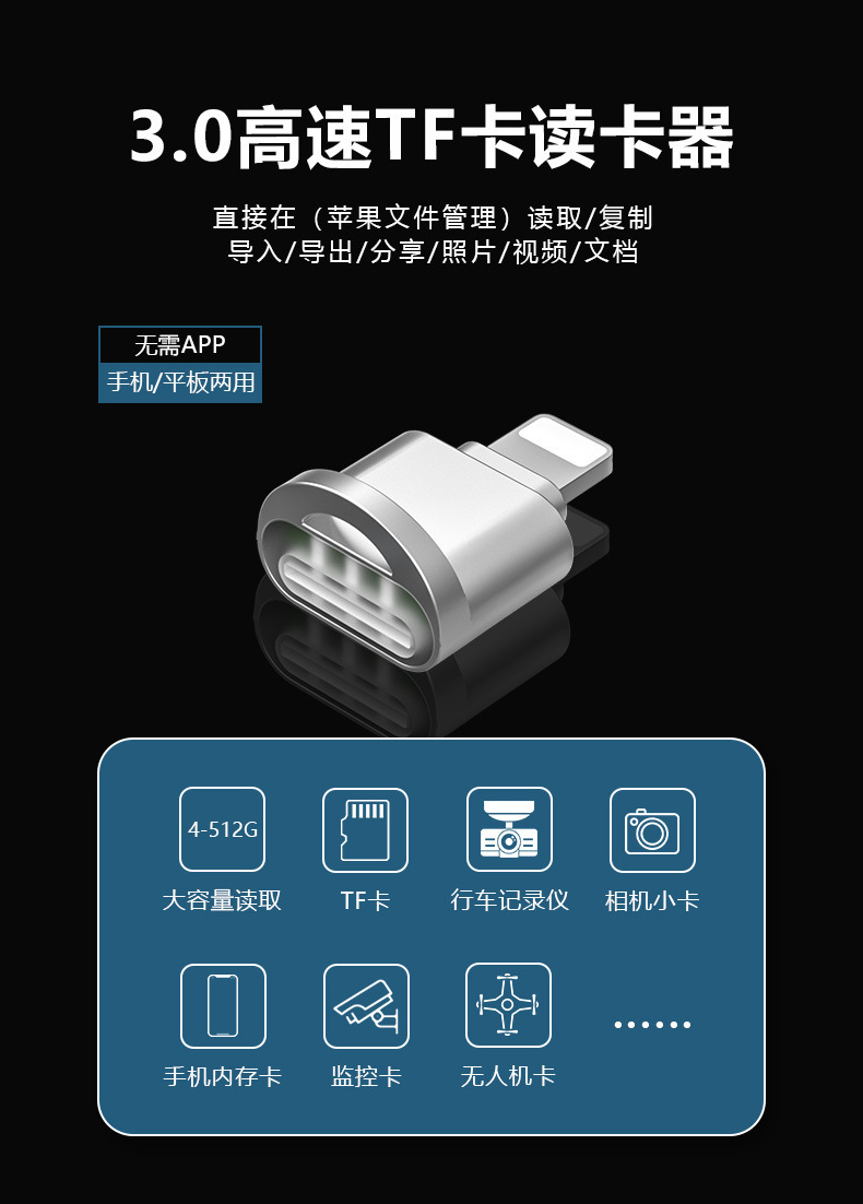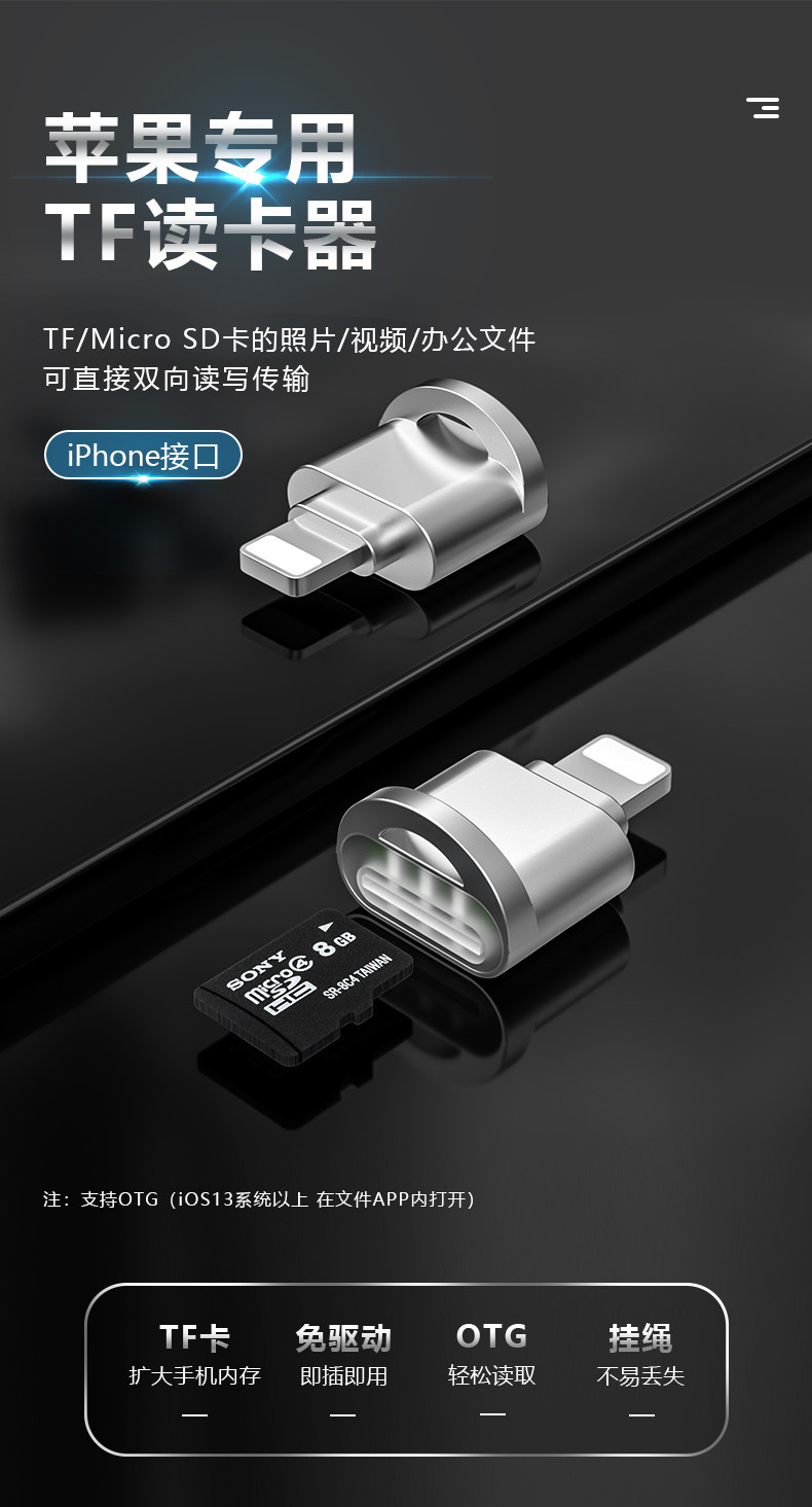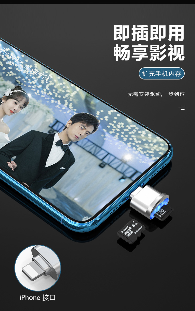 휴대폰 TF 카드 리더기는 애플 아이폰, 화웨이 태블릿 메모리 카드, OTG 데이터 변환기, 다양한 기기와 호환됩니다.스토어 가기