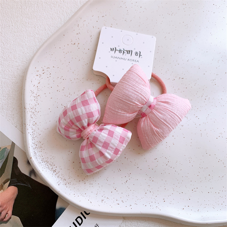 봄 새로운 어린이 패브릭 면화로 채워진 체크 무늬 활 헤어 밴드 소녀 헤어 타이 고무 밴드 쌍 헤어 로프 헤어 액세서리