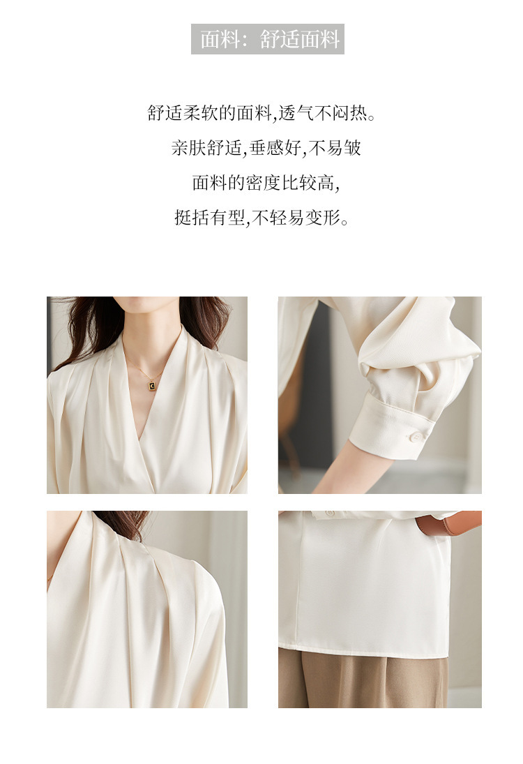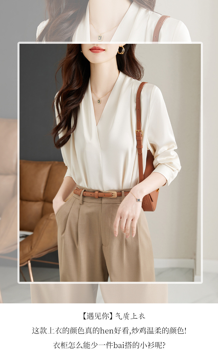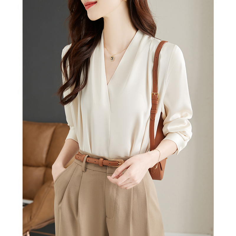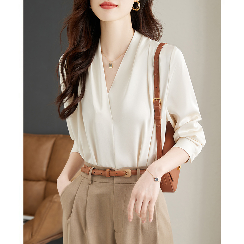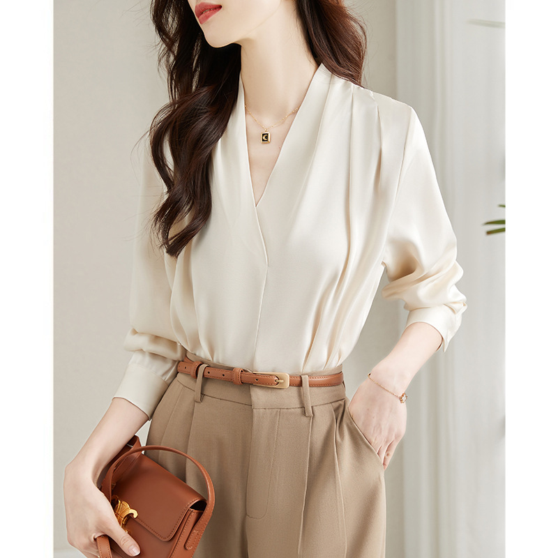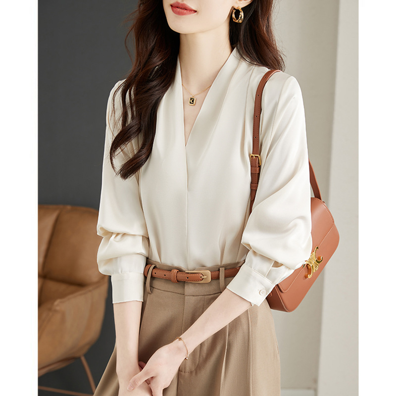 여성을위한 우아한 V 넥 긴팔 쉬폰 셔츠 2024 이른 봄 새로운 디자인 감각 연령 감소 최고의 프랑스 스타일 작은 셔츠스토어 가기