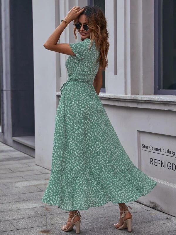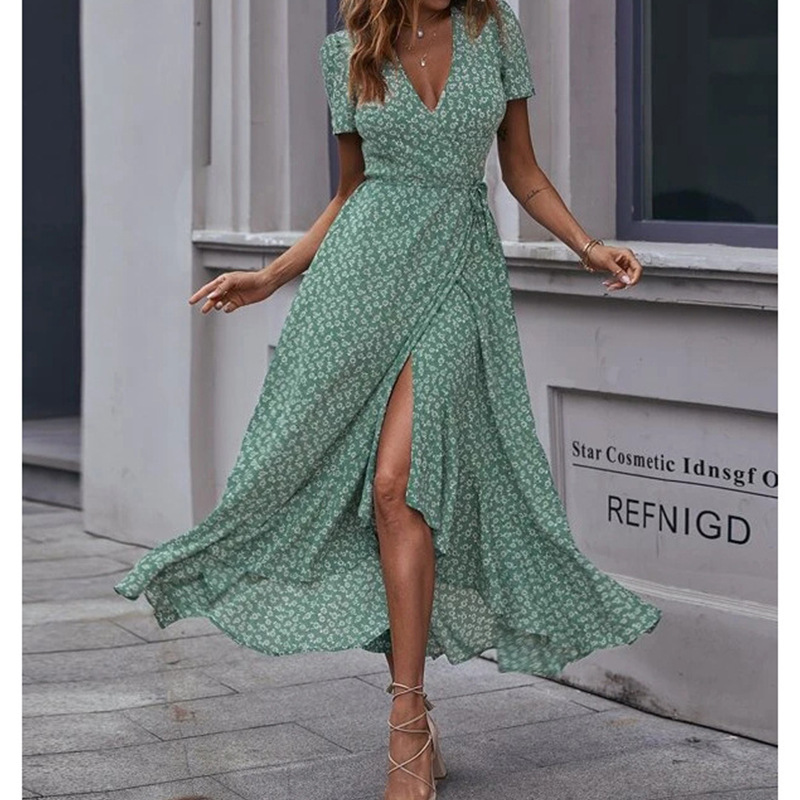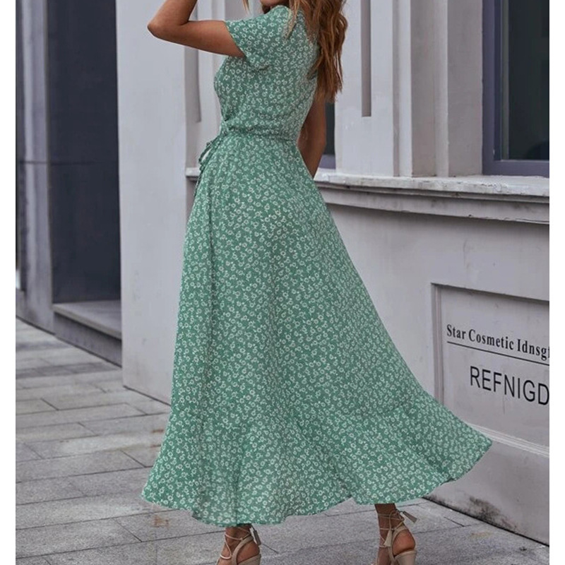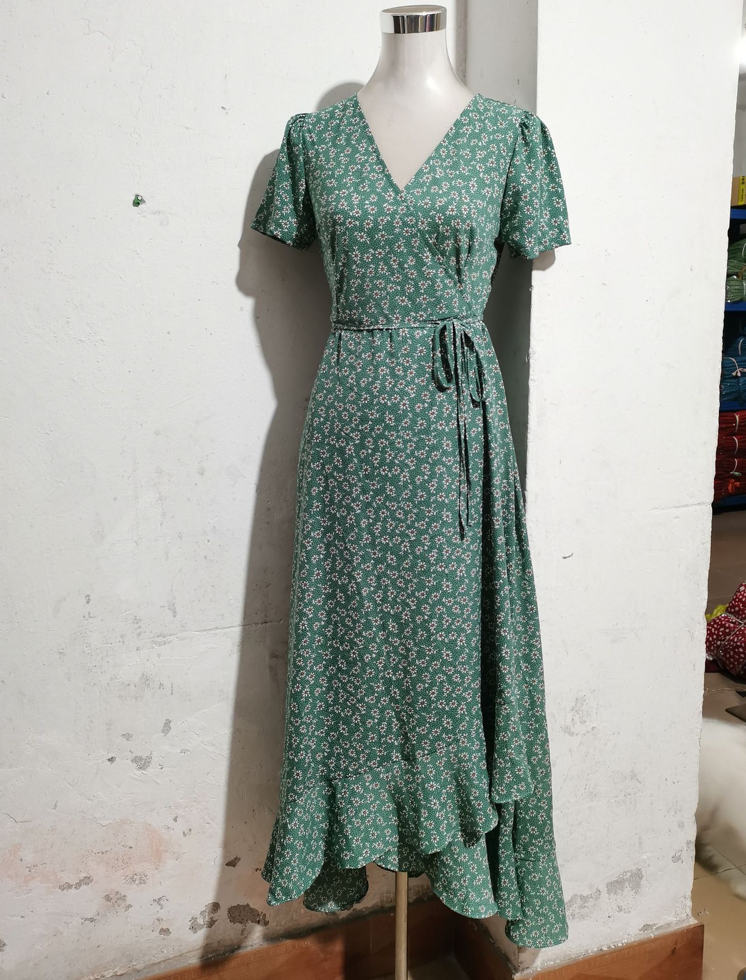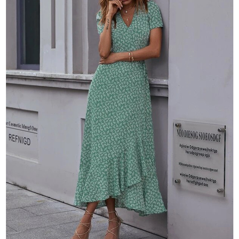 독립 역 아마존 국경 작은 꽃 V넥 카디건 레이스 업 짧은 소매 보헤미안 스윙 휴가 원피스