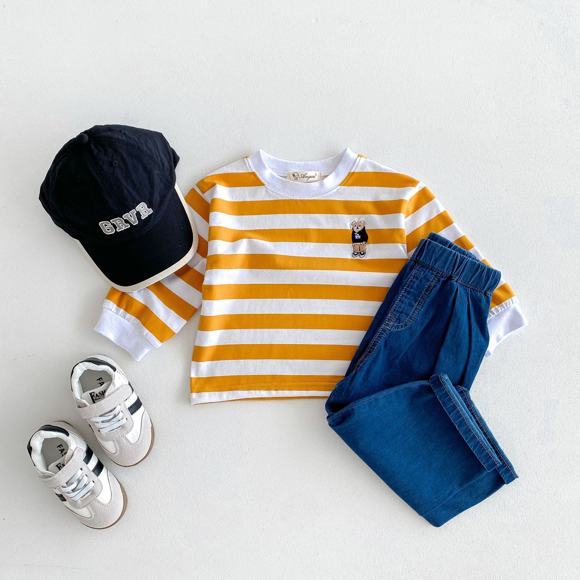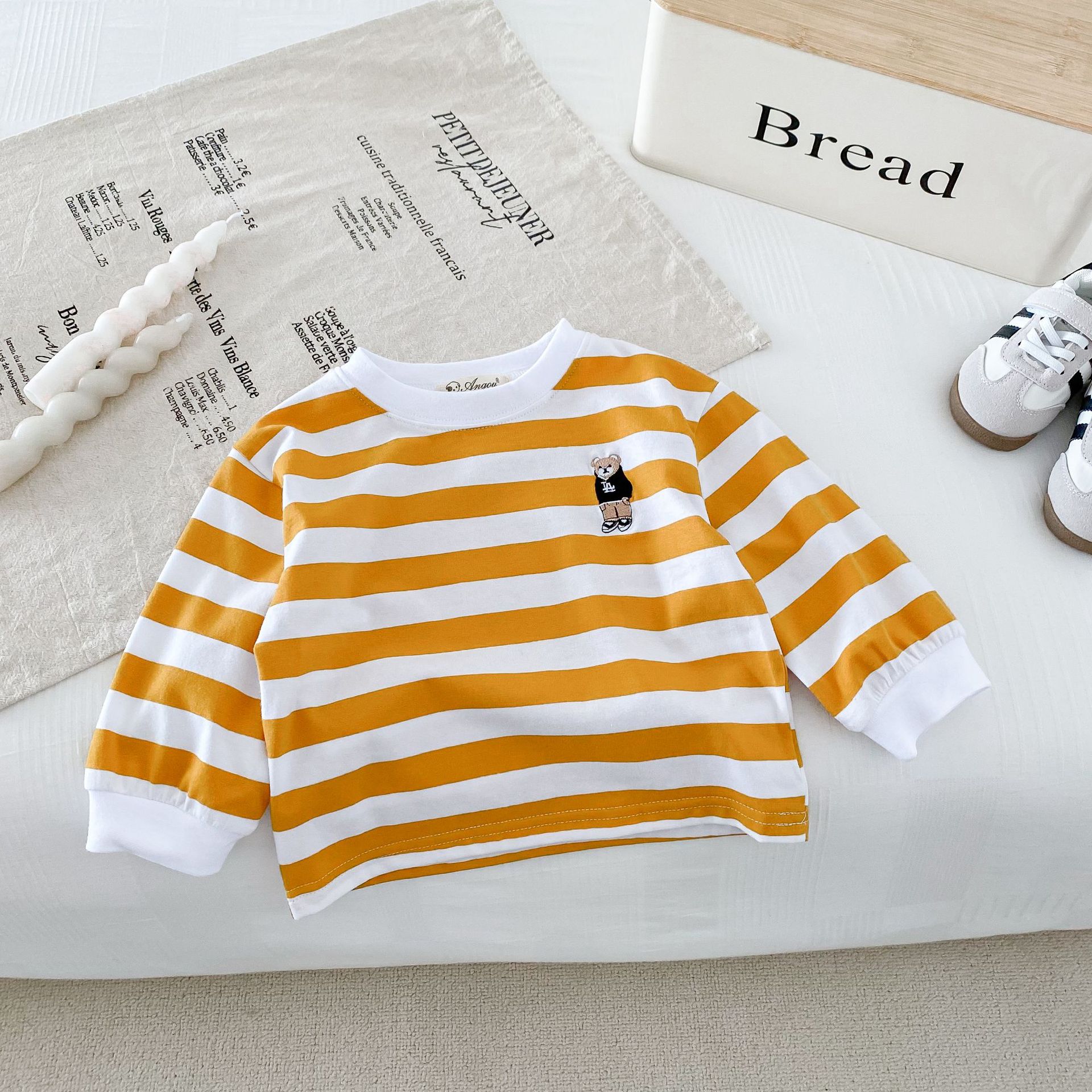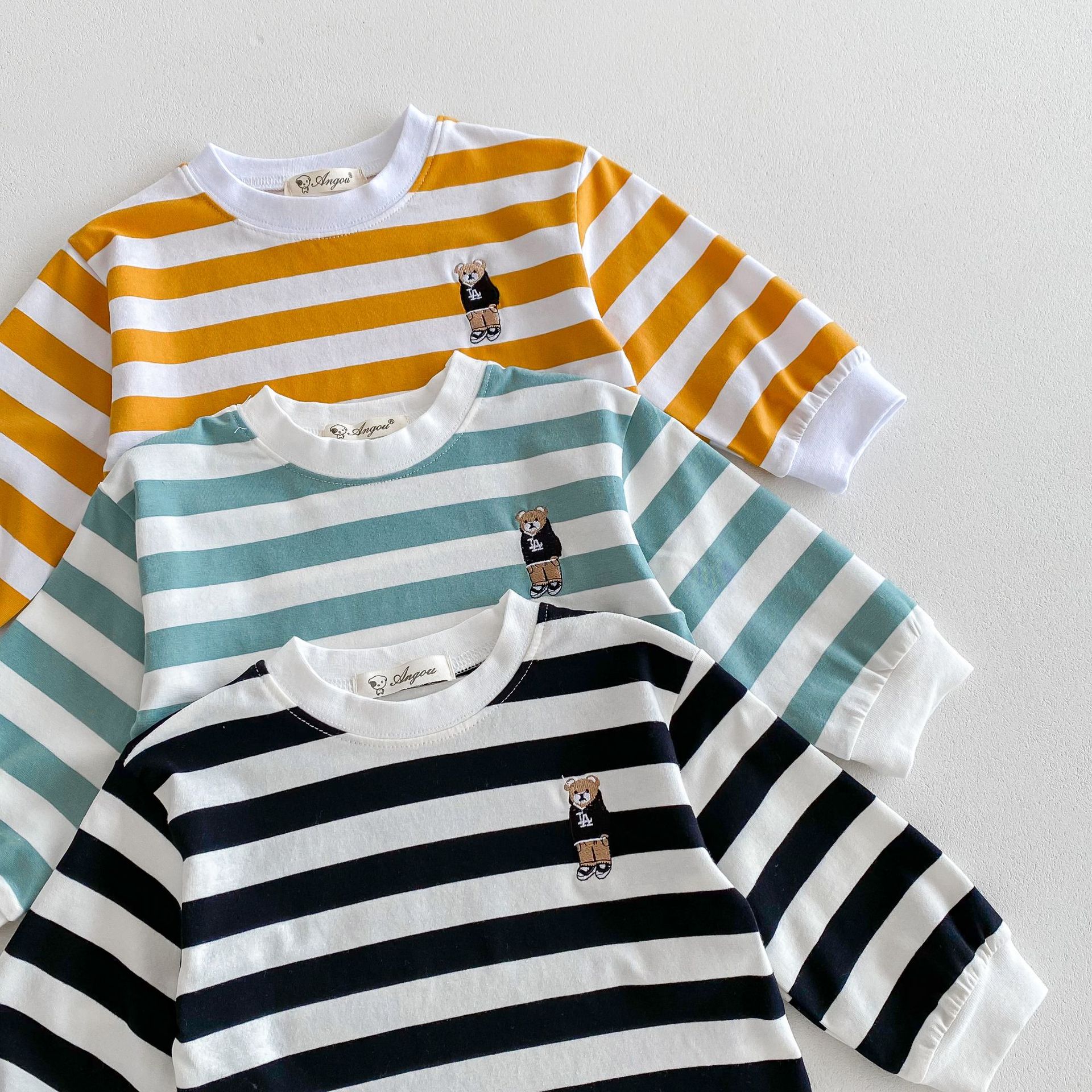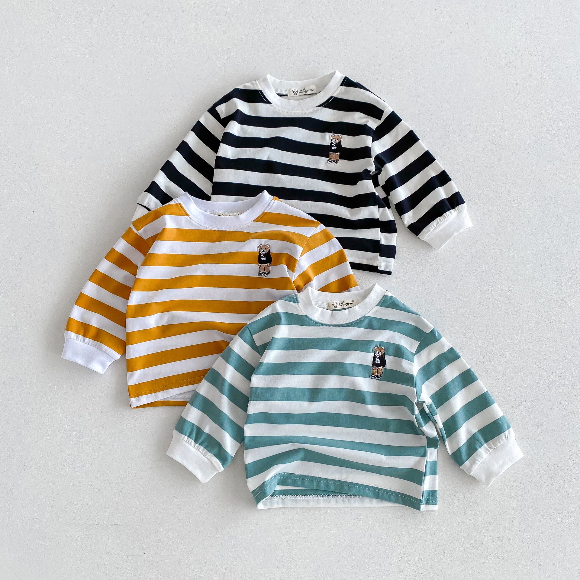 2024 봄 새로운 1-8 세 소년 소녀 한국식 어린이 줄무늬 스웨터 자수 곰 긴팔 탑