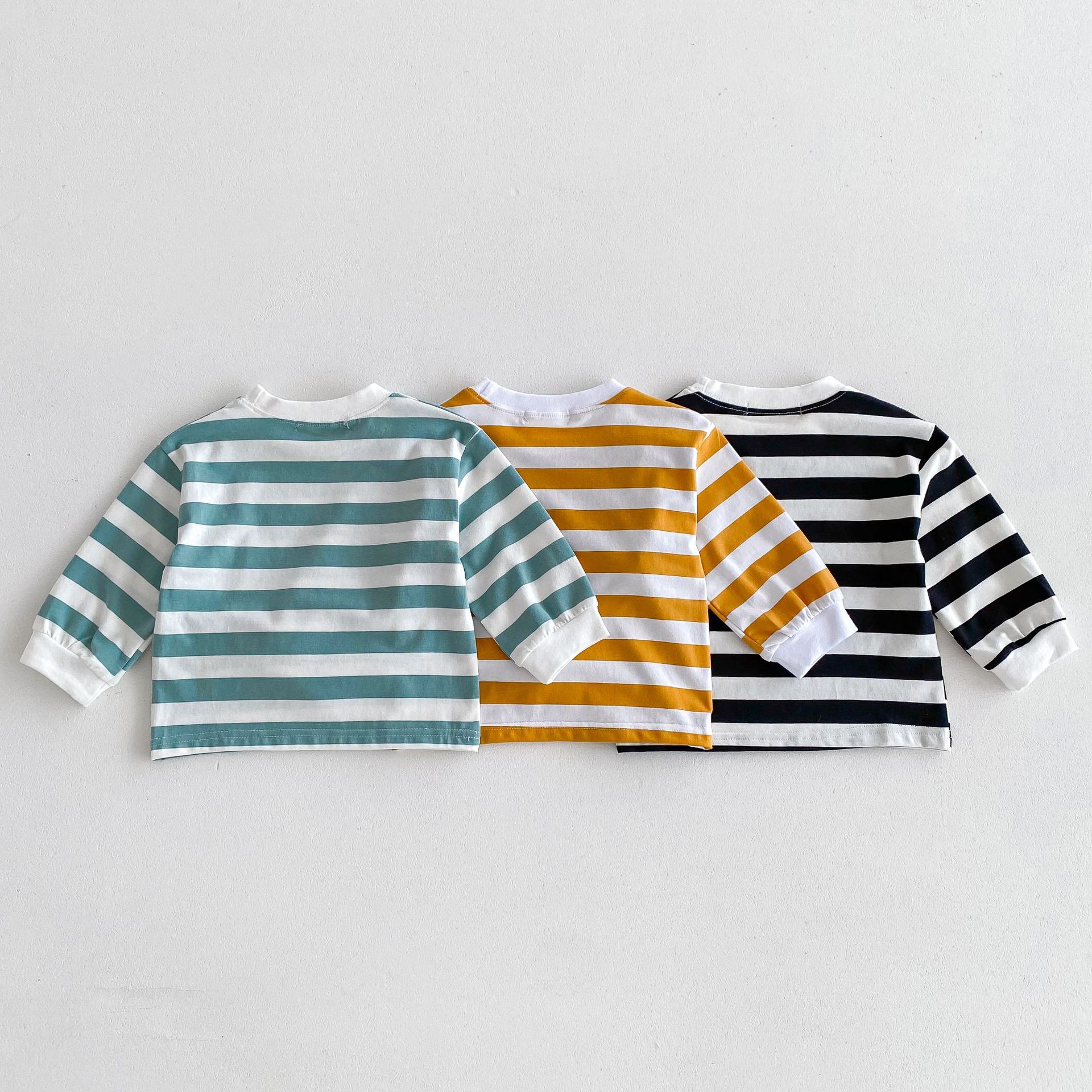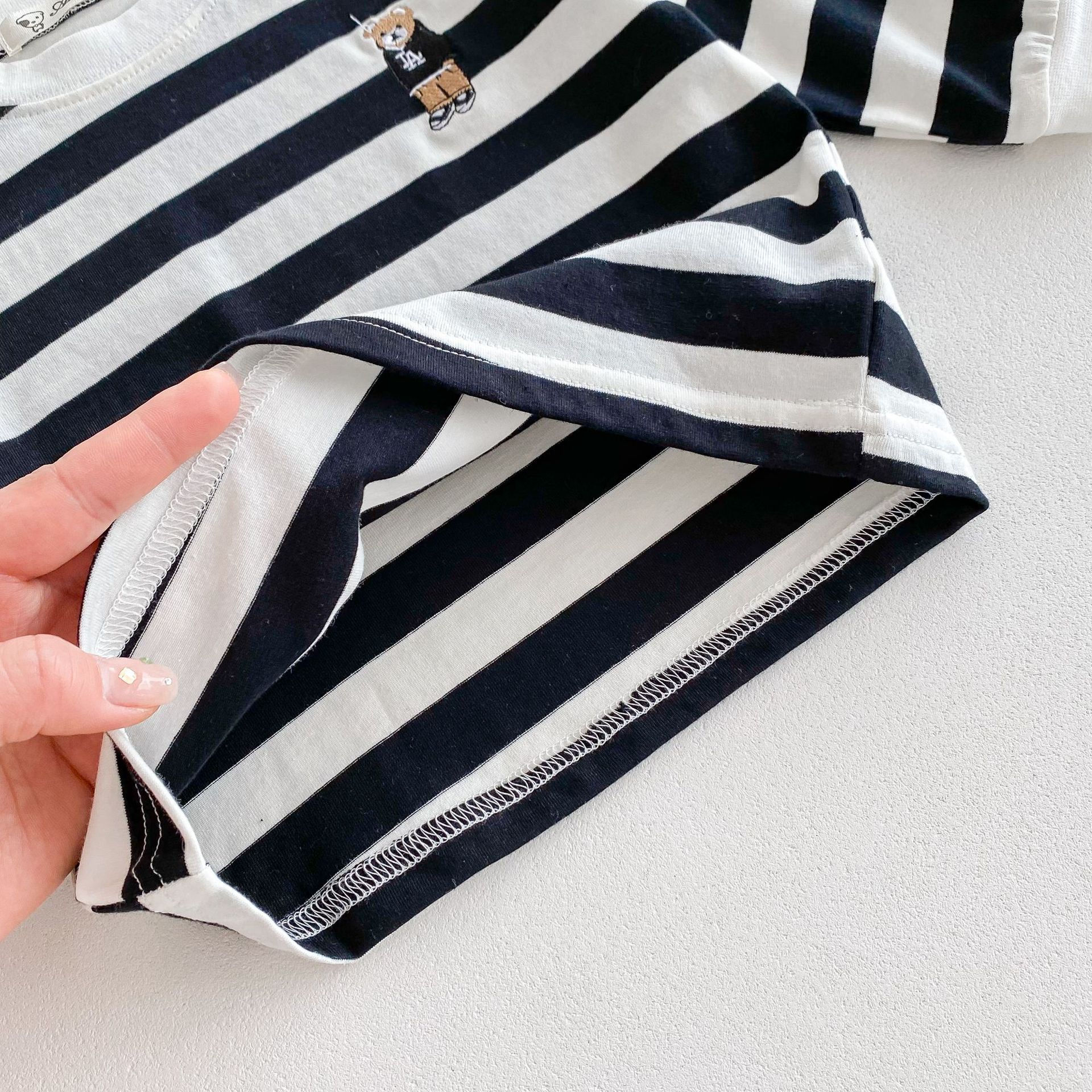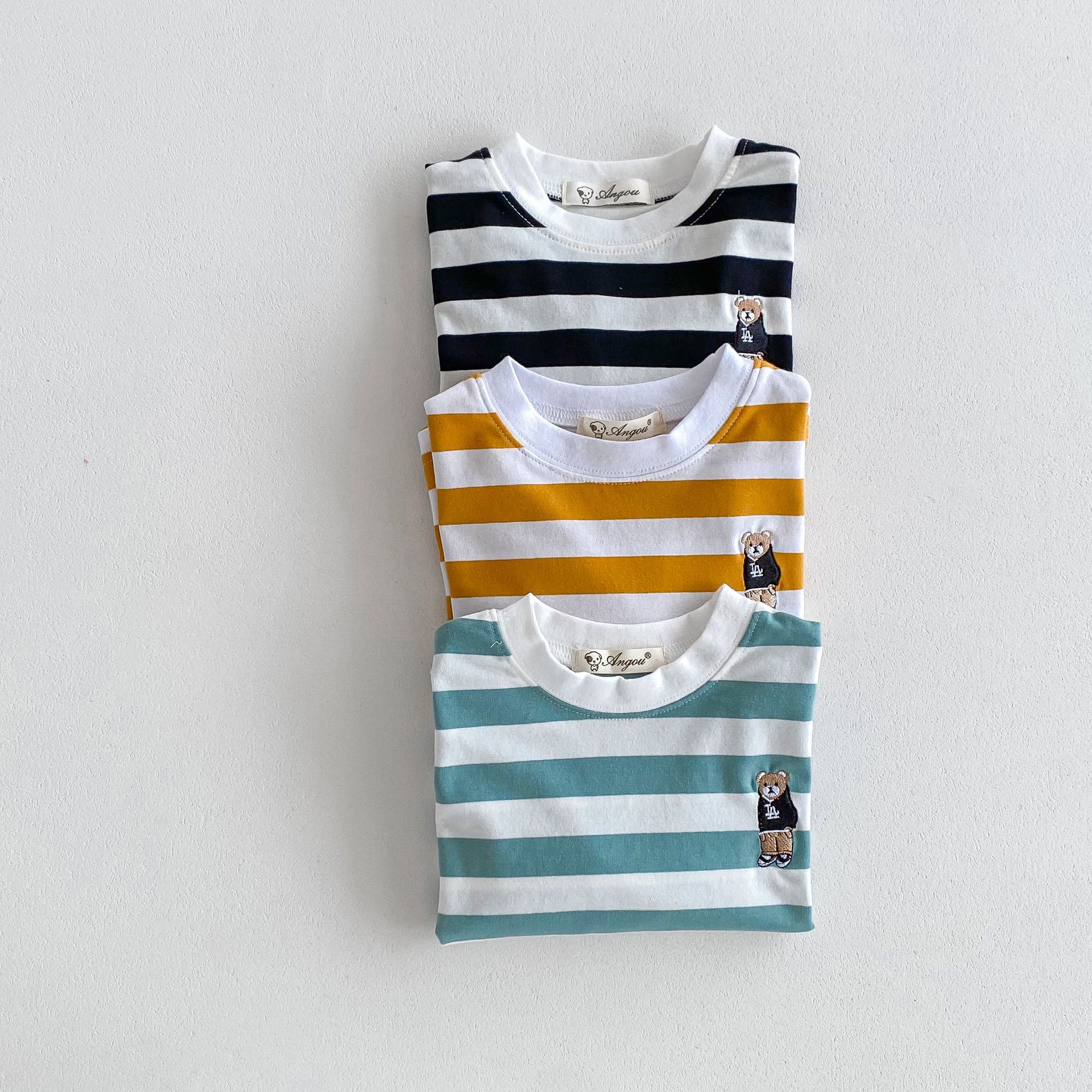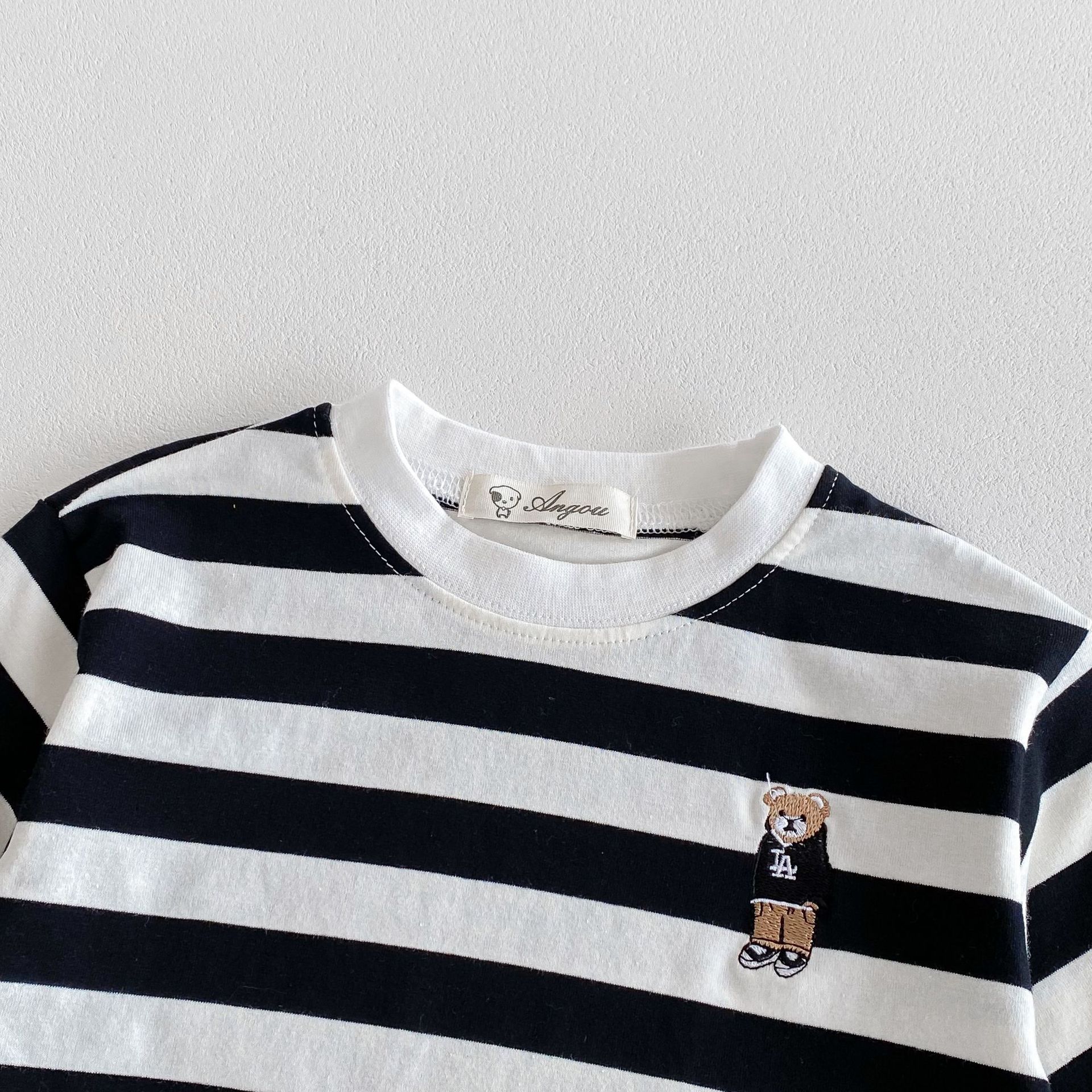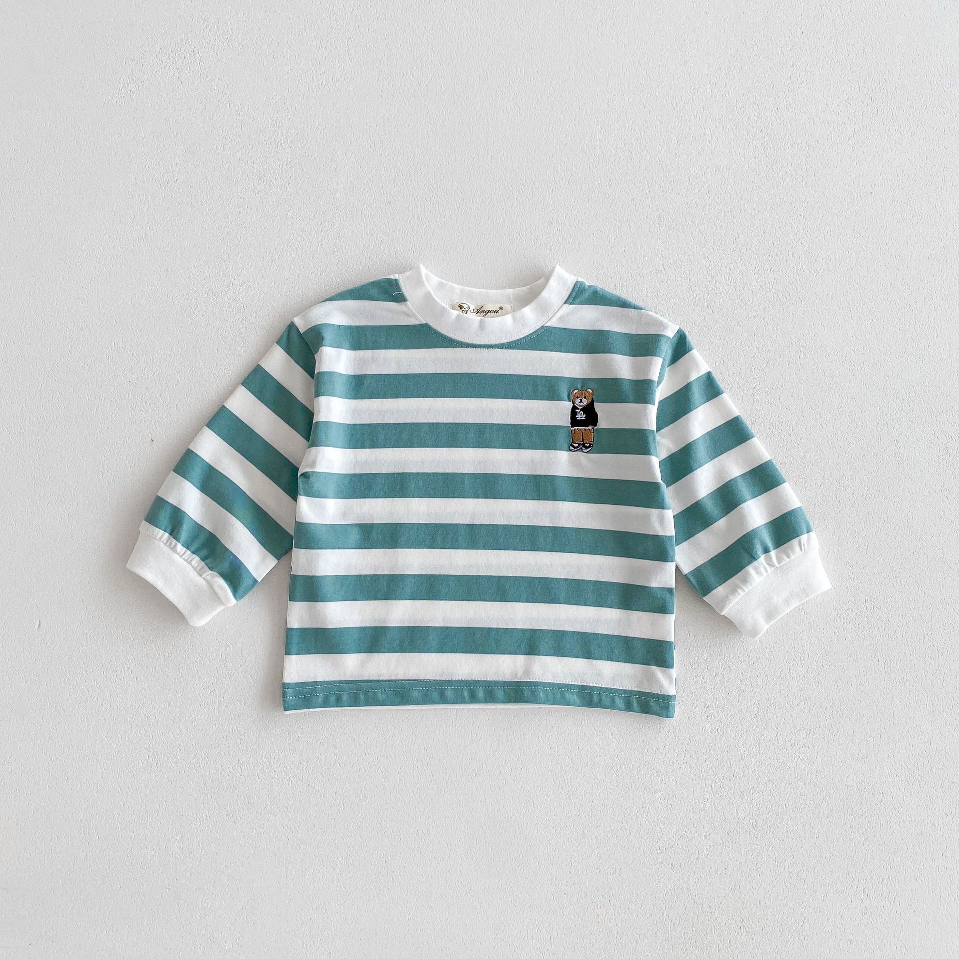 2024 봄 새로운 1-8 세 소년 소녀 한국식 어린이 줄무늬 스웨터 자수 곰 긴팔 탑