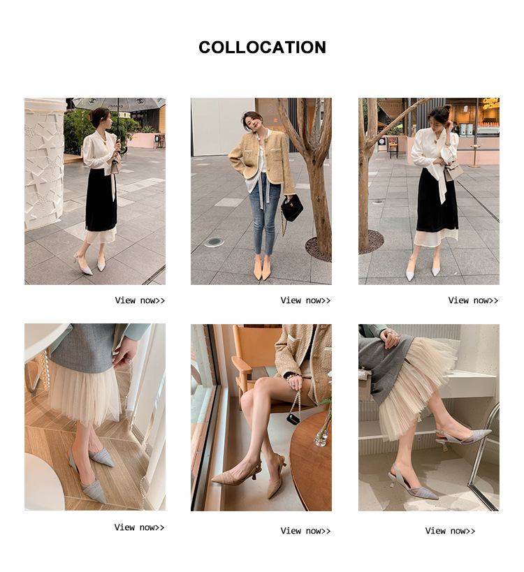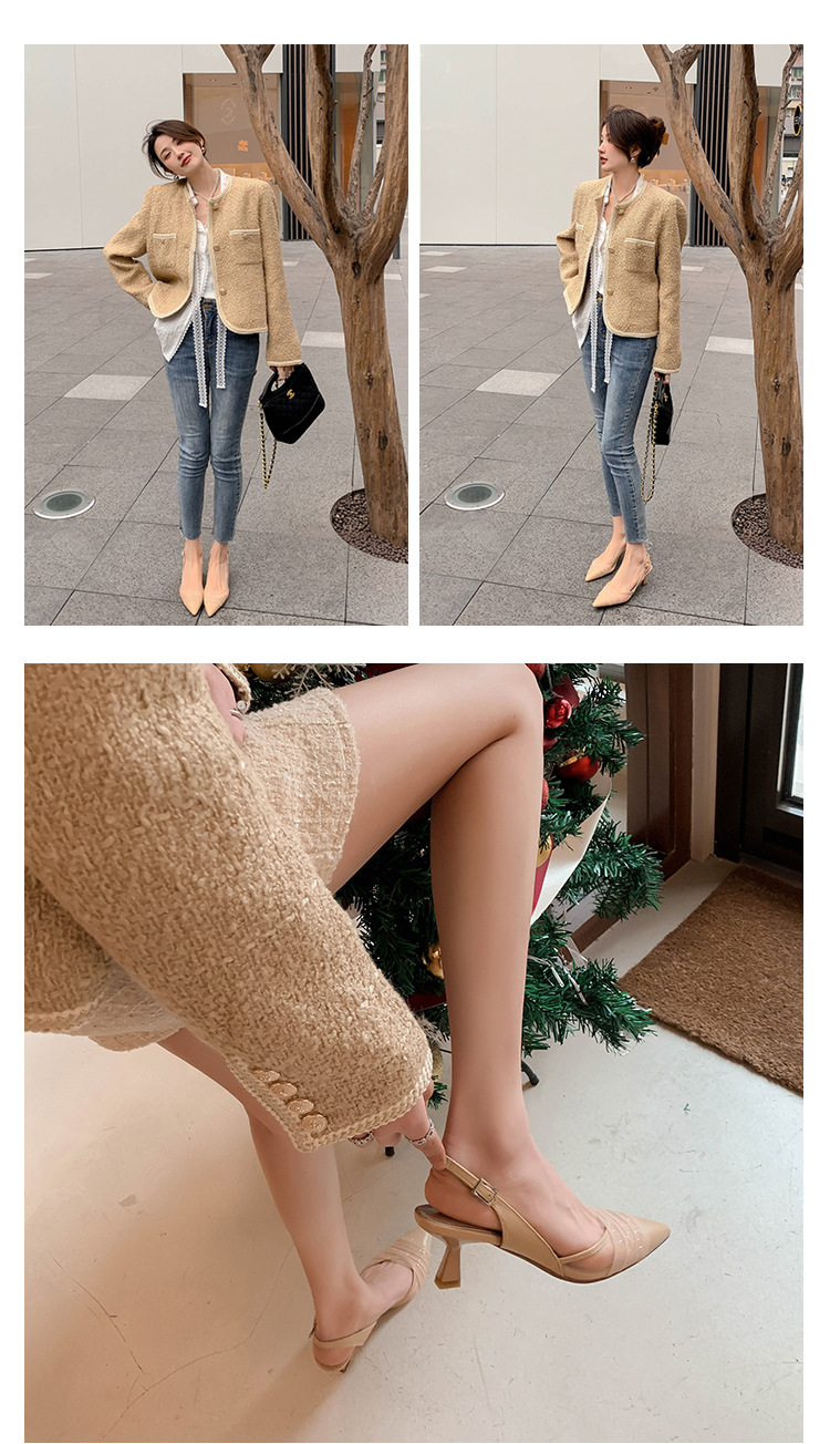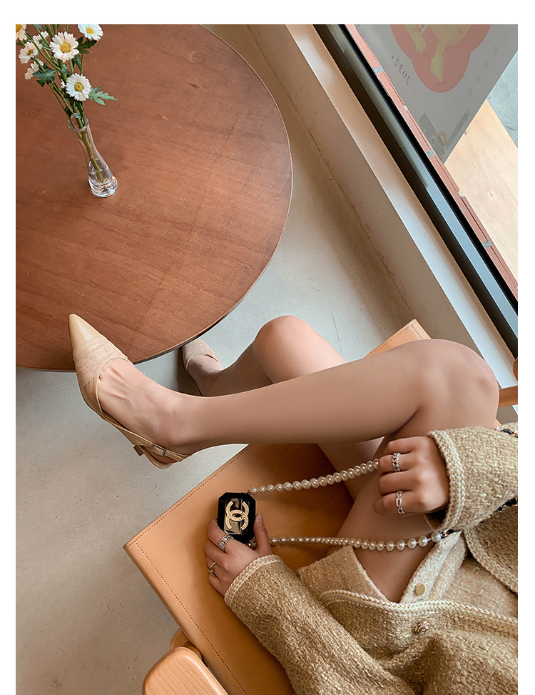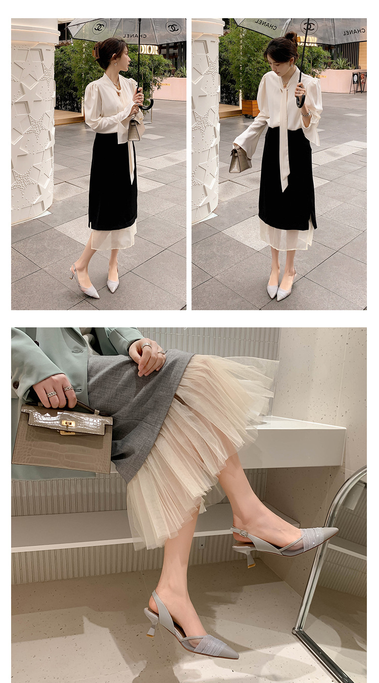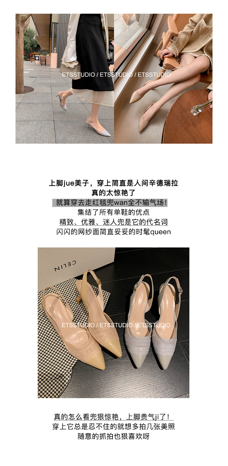 정품 가죽 새끼 고양이 뒤꿈치 뾰족한 발가락 반 닫힌 발가락 등 빈 샌들 프랑스 우아한 메쉬 미드 힐 저녁 바람 부드러운 싱글 레이어 신발 여성용스토어 가기