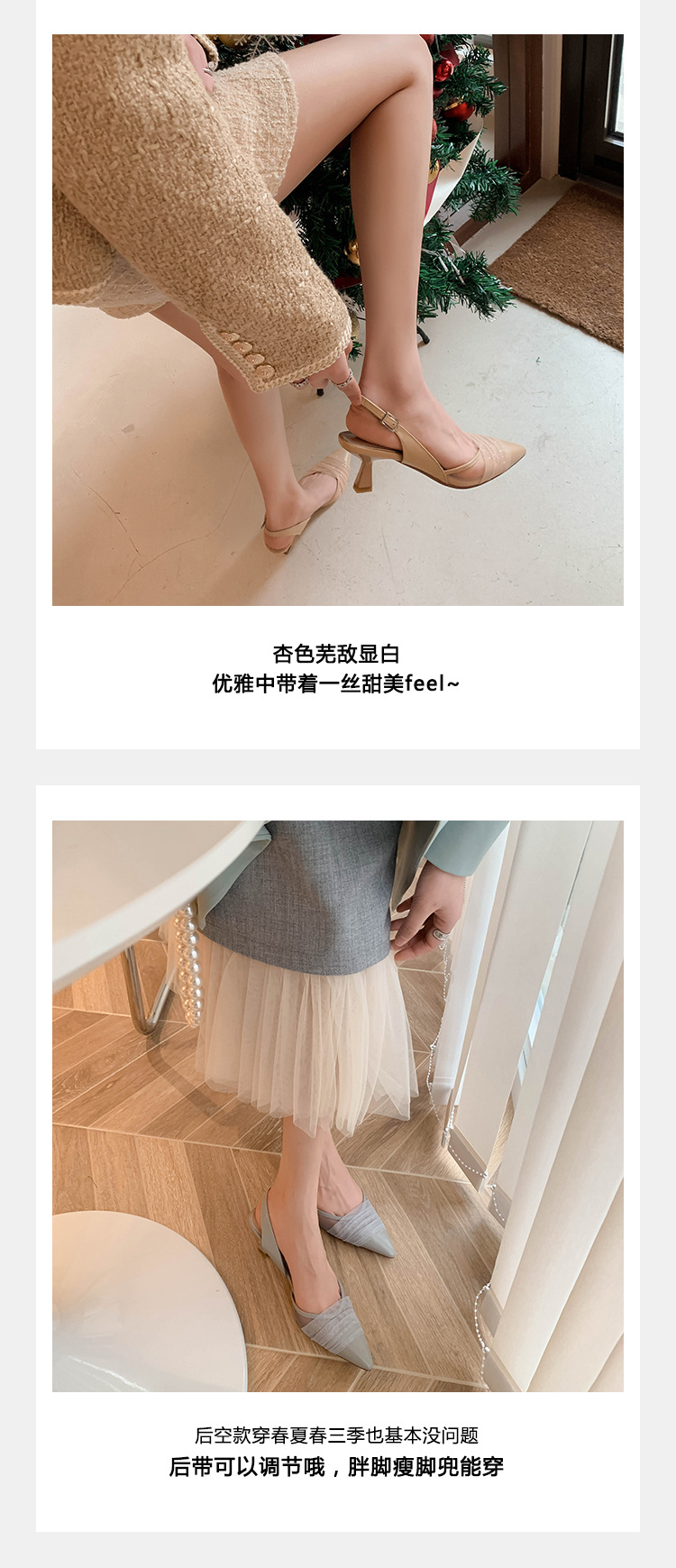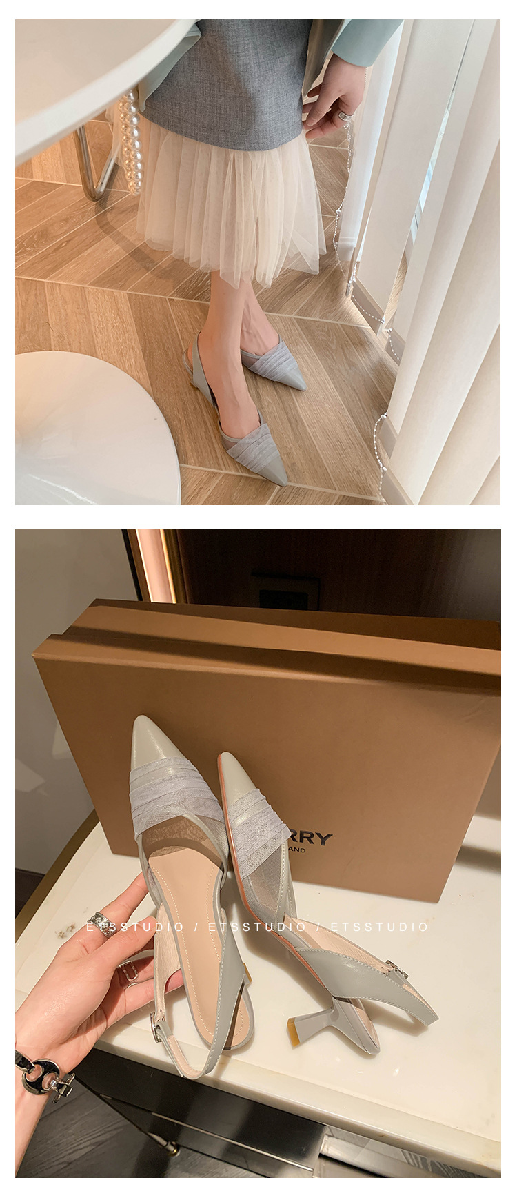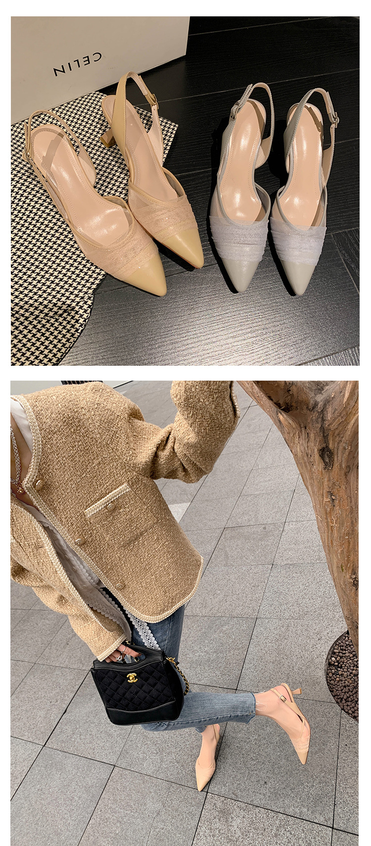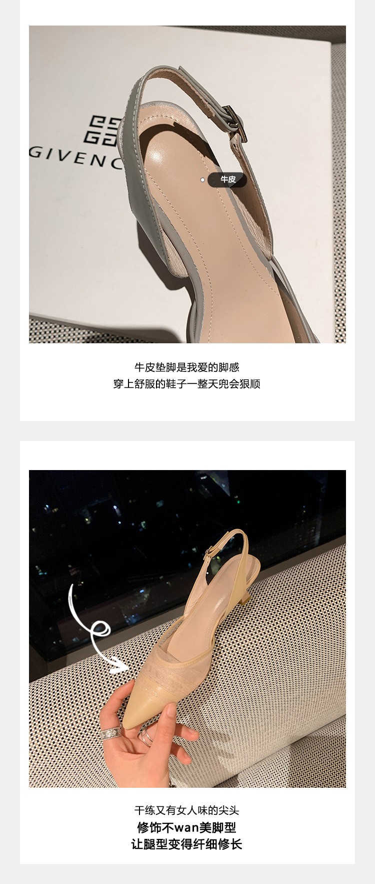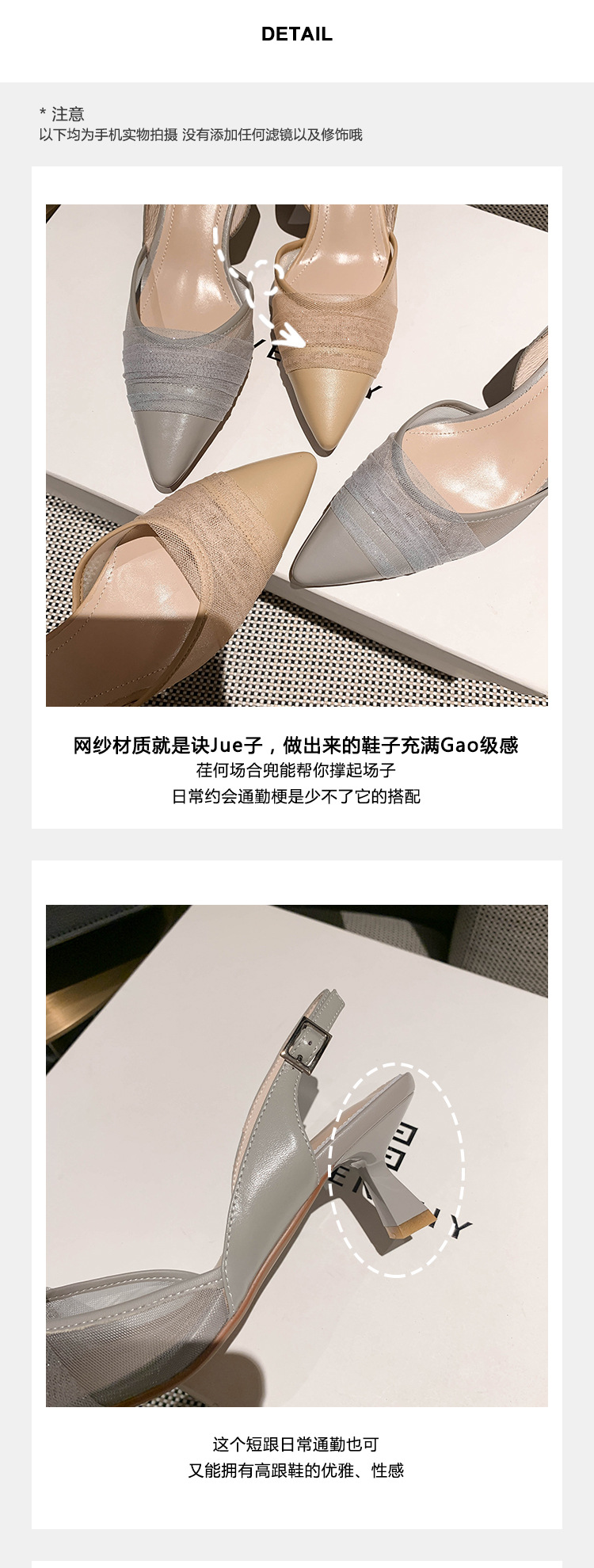 정품 가죽 새끼 고양이 뒤꿈치 뾰족한 발가락 반 닫힌 발가락 등 빈 샌들 프랑스 우아한 메쉬 미드 힐 저녁 바람 부드러운 싱글 레이어 신발 여성용스토어 가기