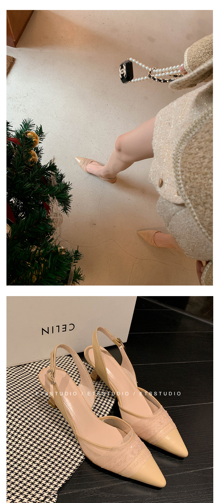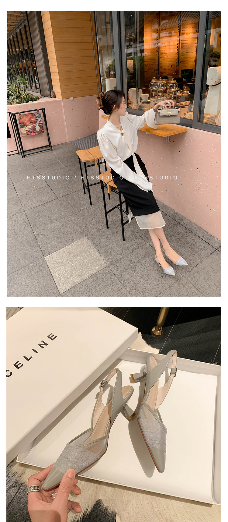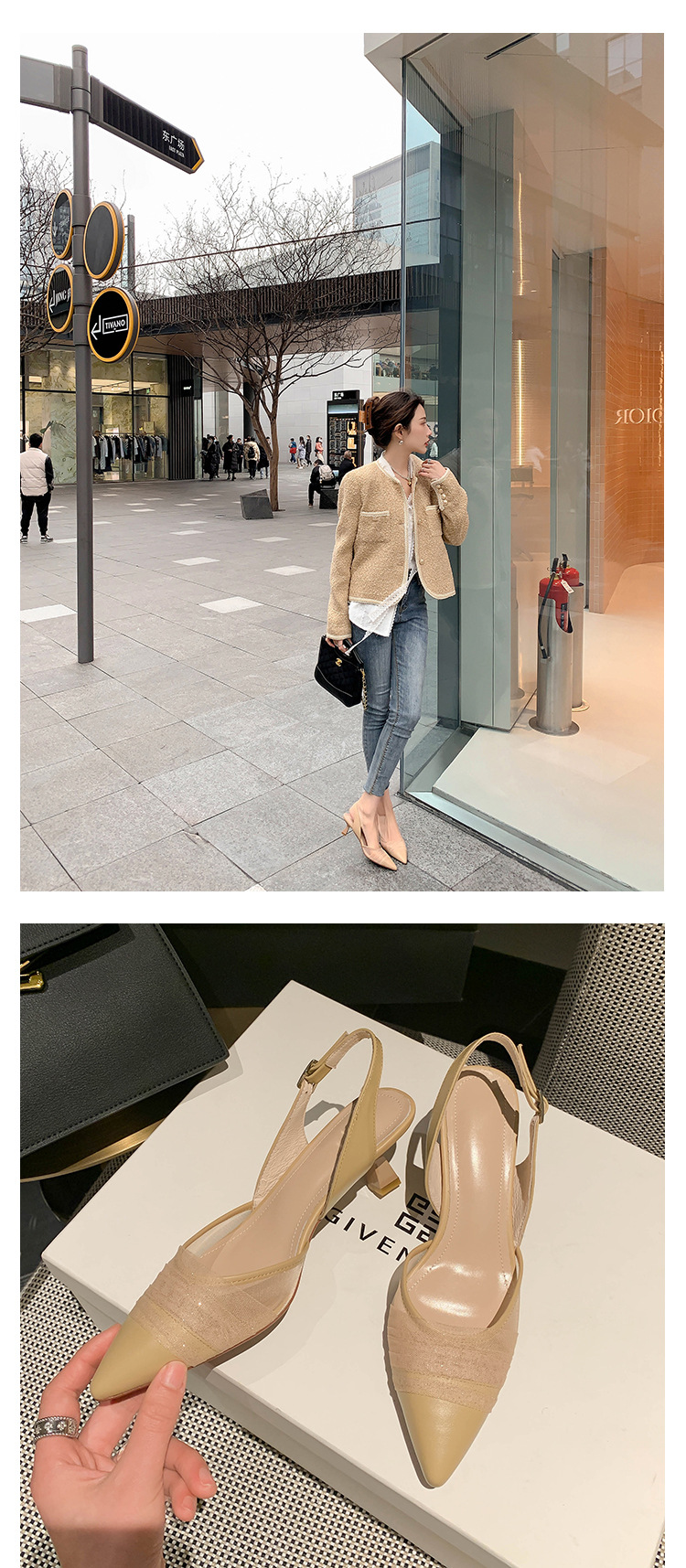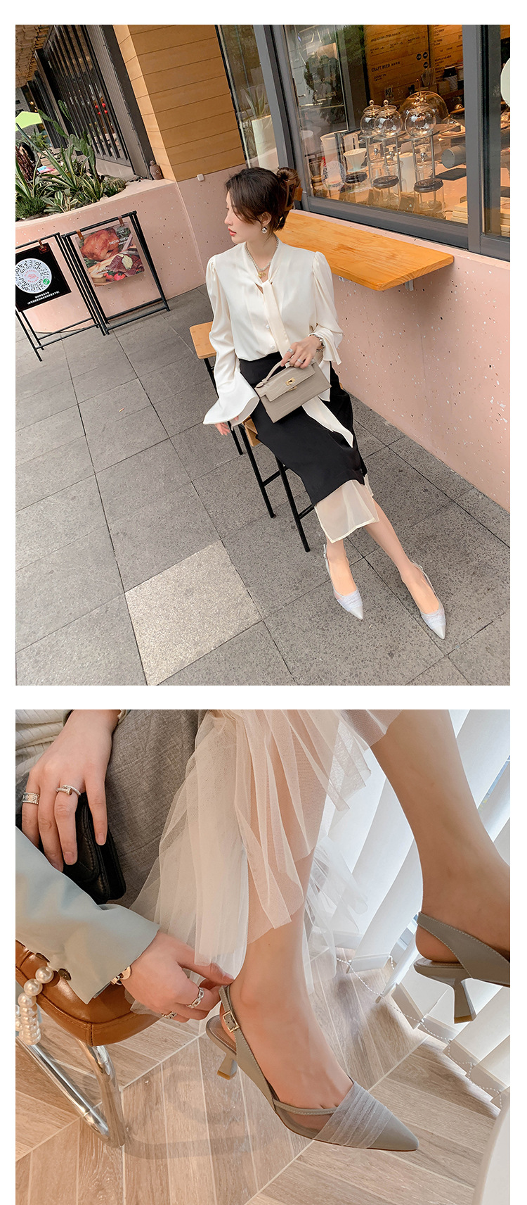 정품 가죽 새끼 고양이 뒤꿈치 뾰족한 발가락 반 닫힌 발가락 등 빈 샌들 프랑스 우아한 메쉬 미드 힐 저녁 바람 부드러운 싱글 레이어 신발 여성용스토어 가기