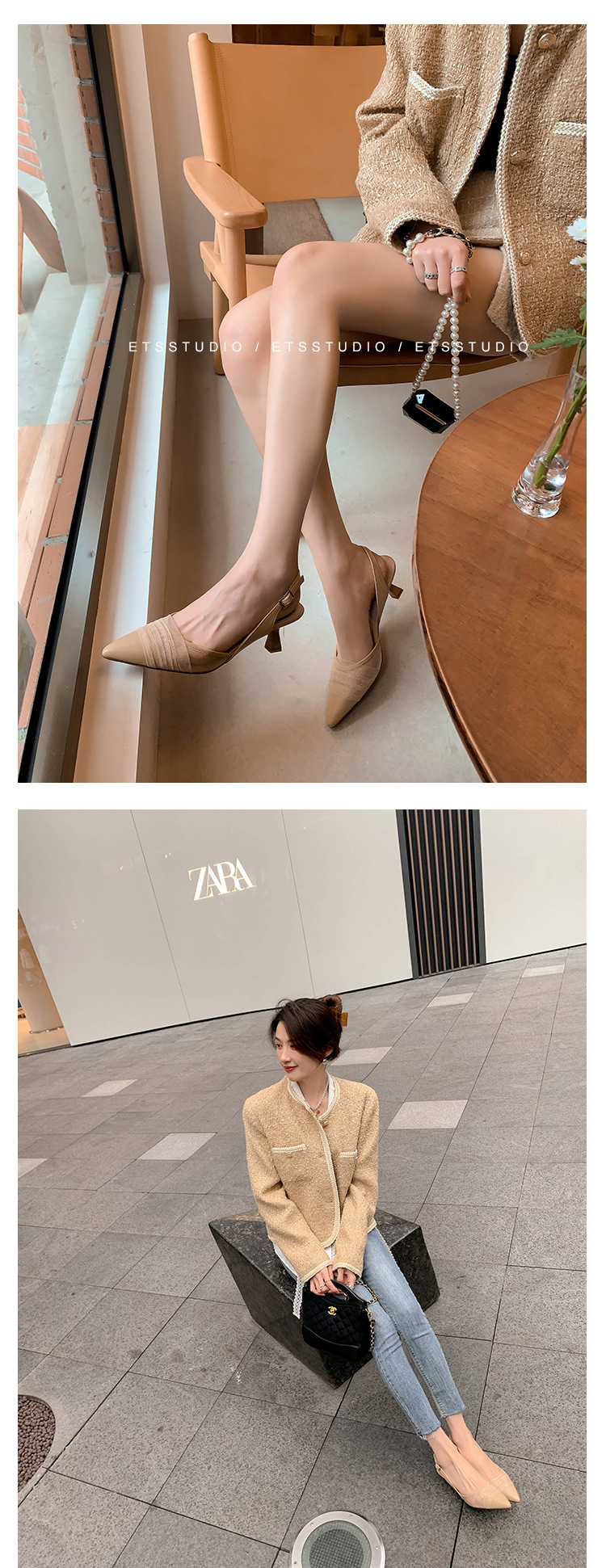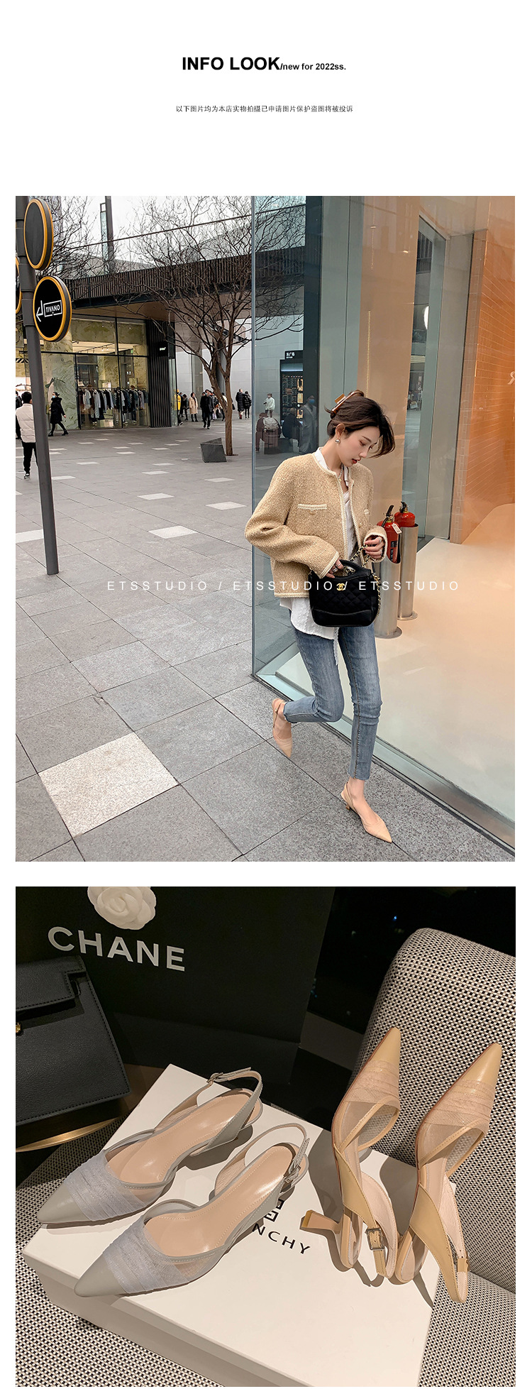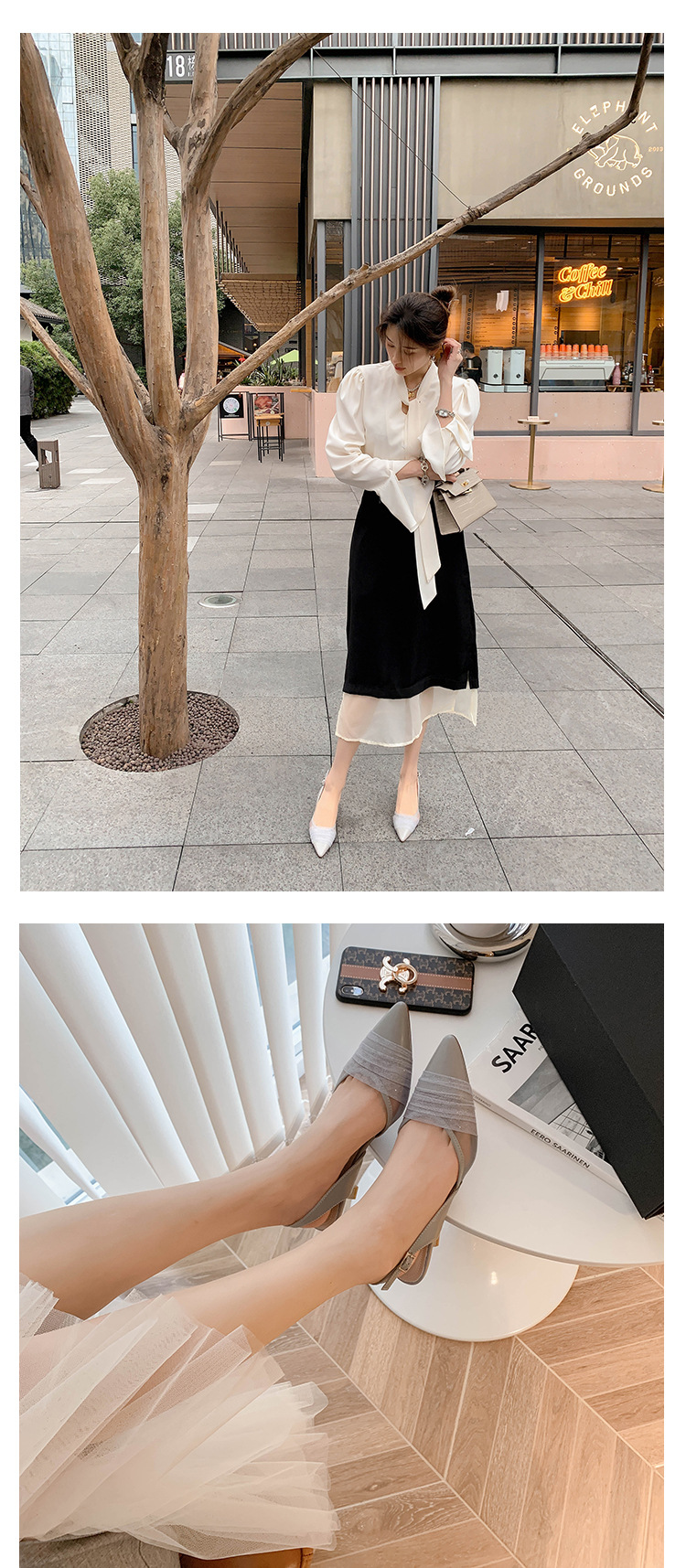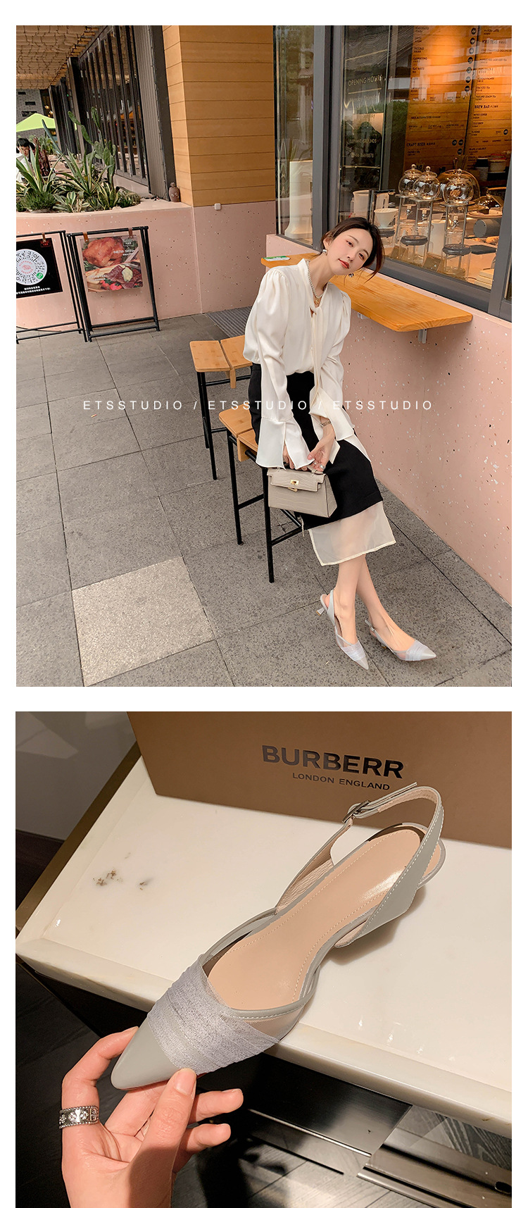 정품 가죽 새끼 고양이 뒤꿈치 뾰족한 발가락 반 닫힌 발가락 등 빈 샌들 프랑스 우아한 메쉬 미드 힐 저녁 바람 부드러운 싱글 레이어 신발 여성용스토어 가기