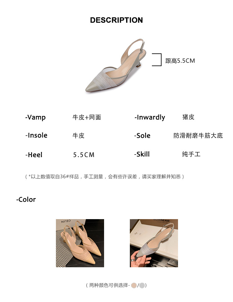 정품 가죽 새끼 고양이 뒤꿈치 뾰족한 발가락 반 닫힌 발가락 등 빈 샌들 프랑스 우아한 메쉬 미드 힐 저녁 바람 부드러운 싱글 레이어 신발 여성용