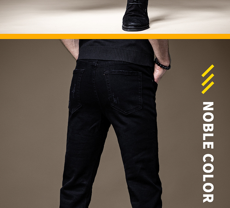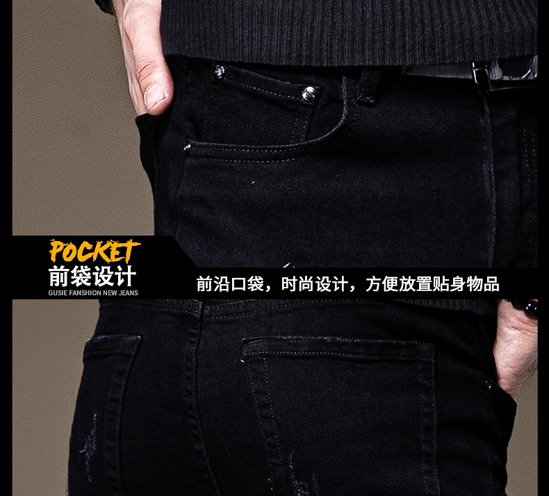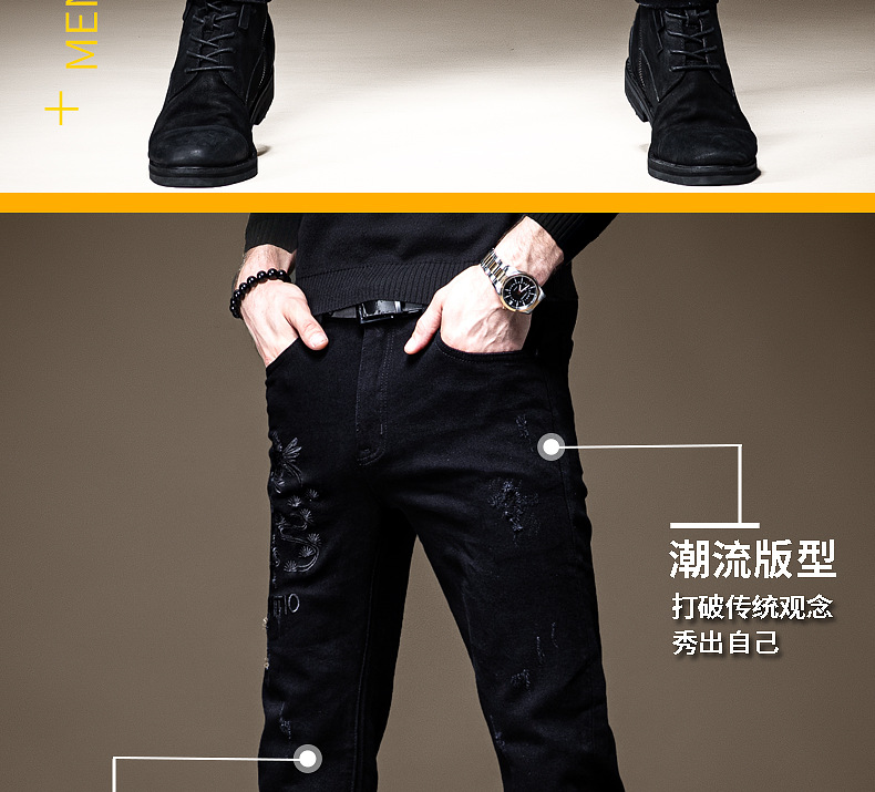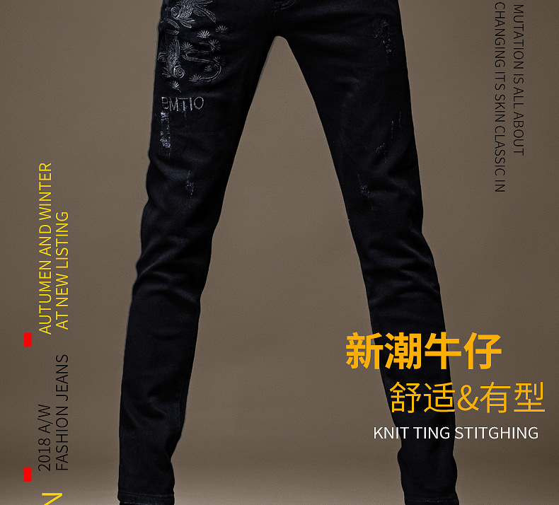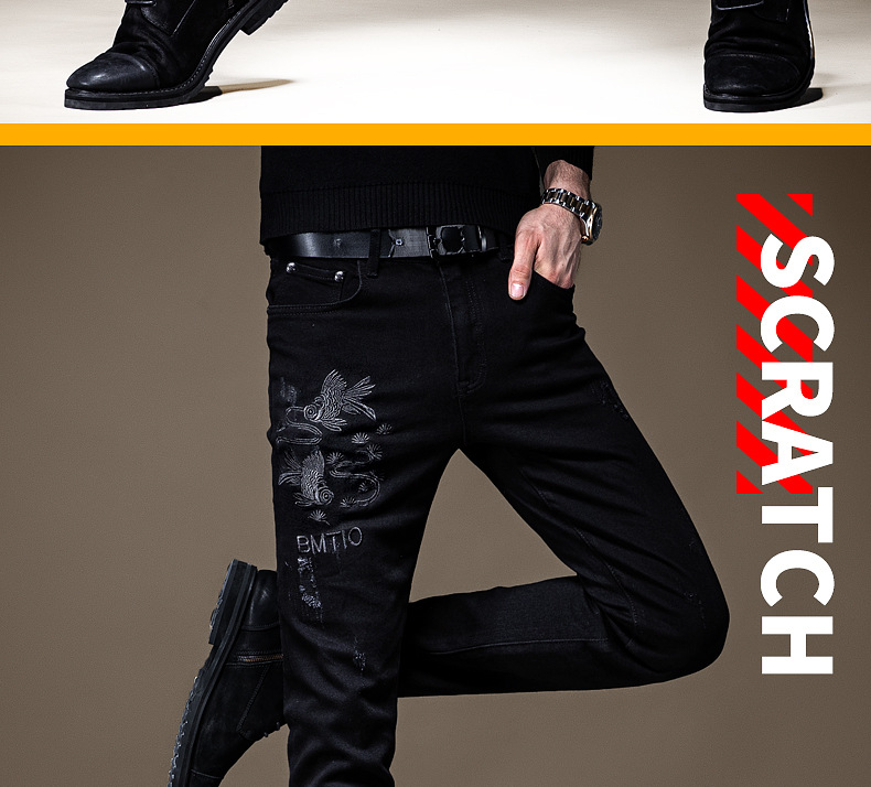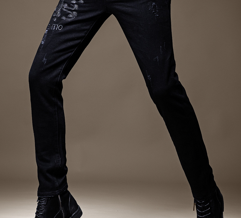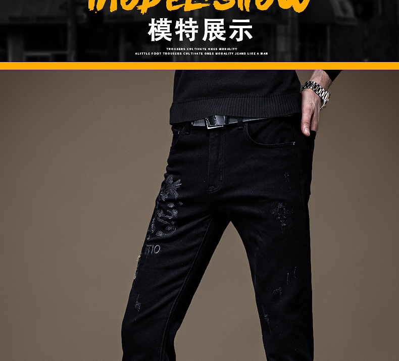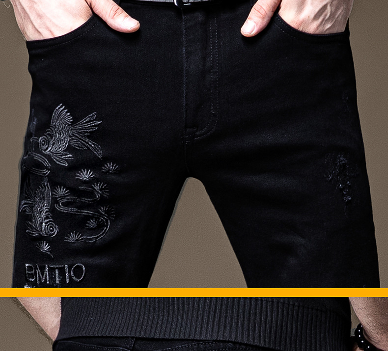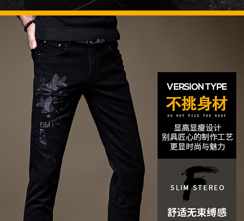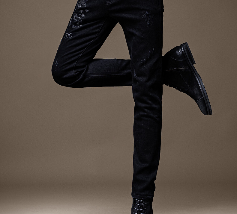 봄 여름 남성용 하이 엔드 유럽 스테이션 퓨어 블랙 자수 청바지 남성용 캐주얼 자수 긴 바지 드롭 배송