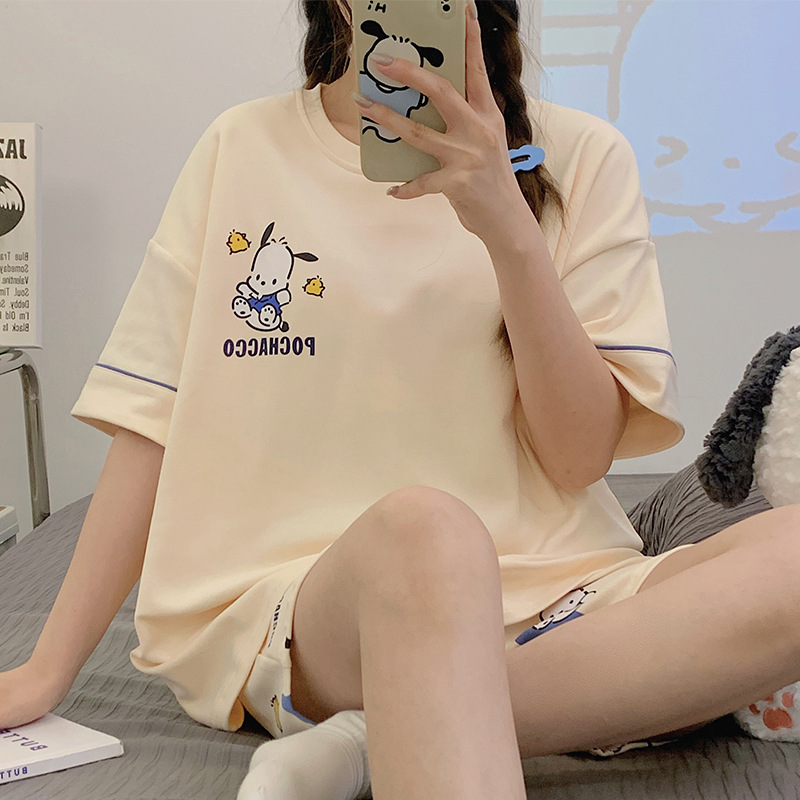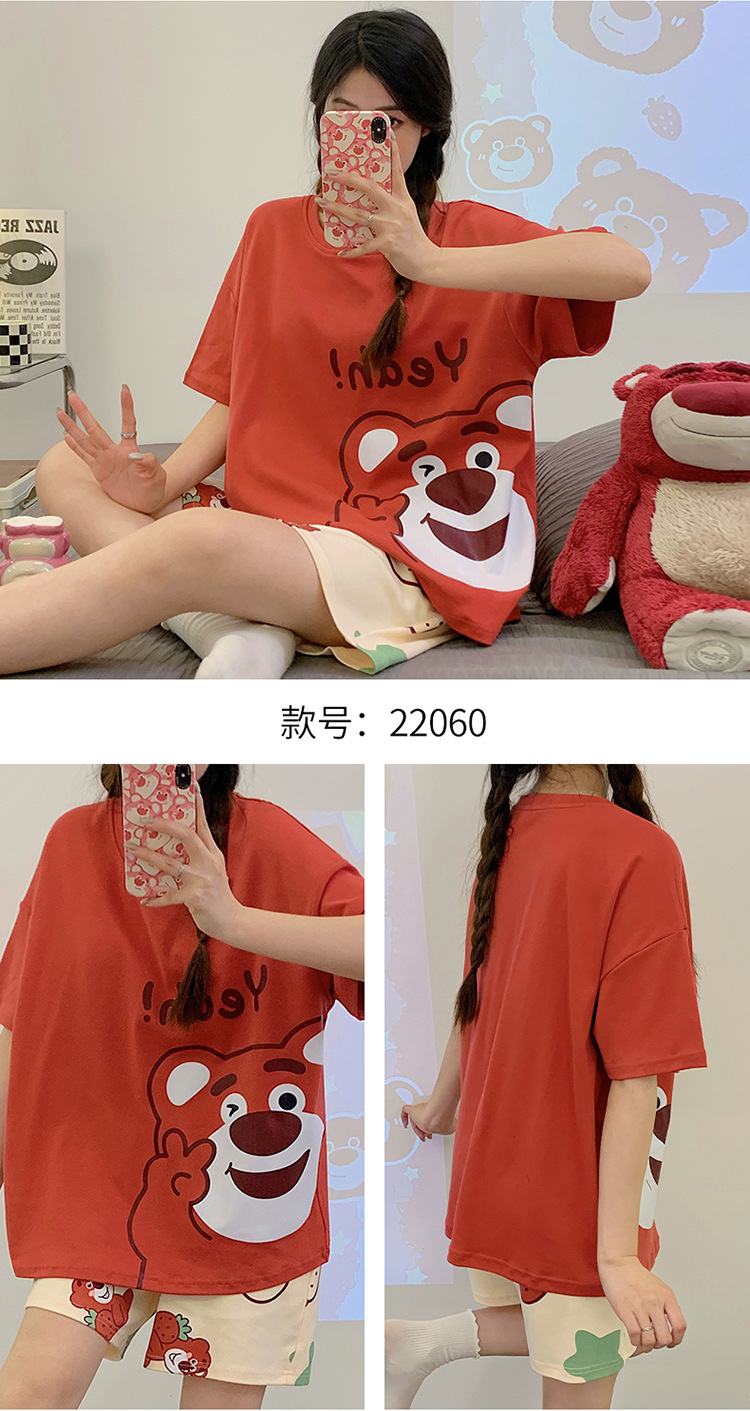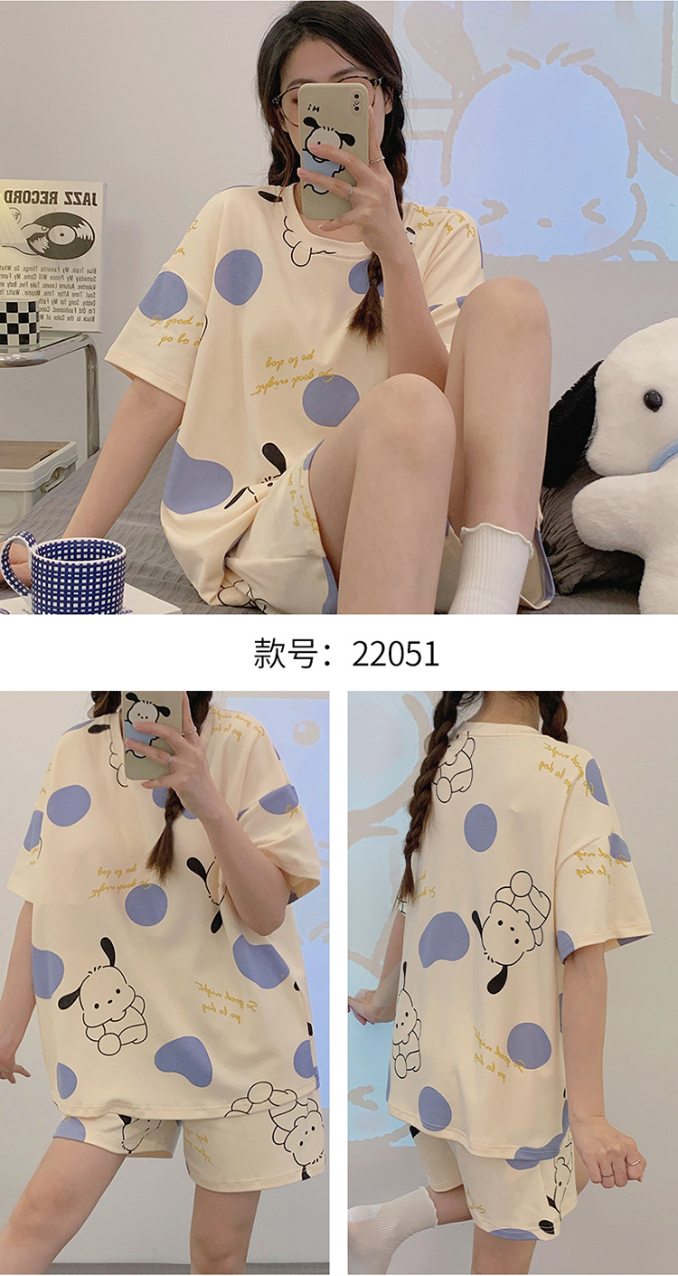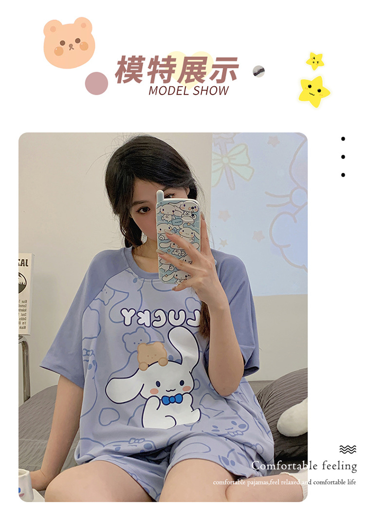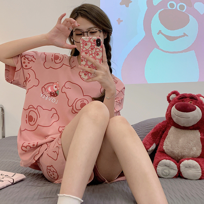 2024 새로운 여름 잠옷 여성 반팔 반바지 둥근 목 풀오버 귀여운 만화 세트 홈 웨어는 외부에서 착용 할 수 있습니다.스토어 가기