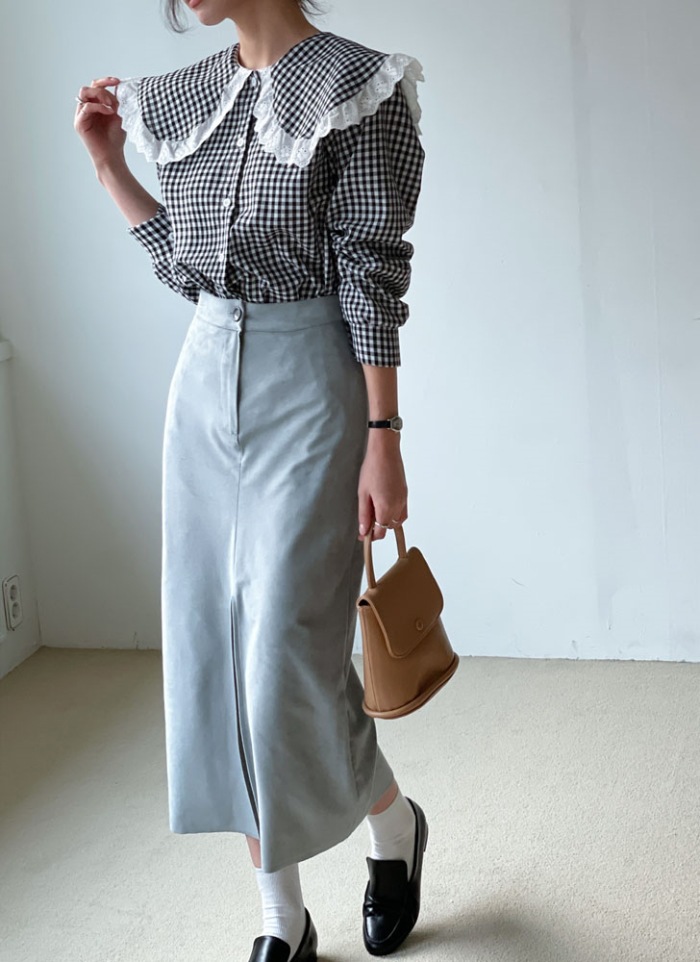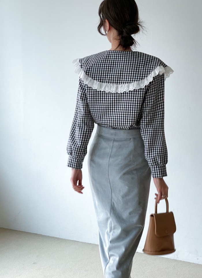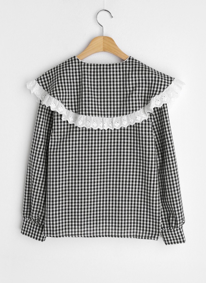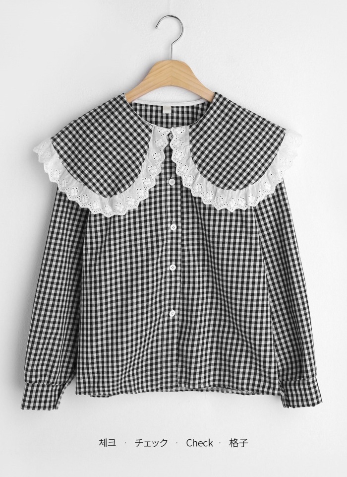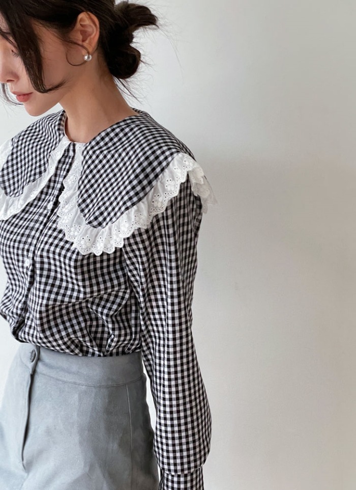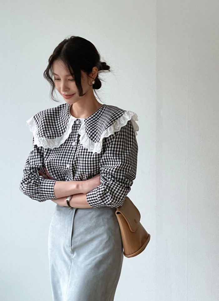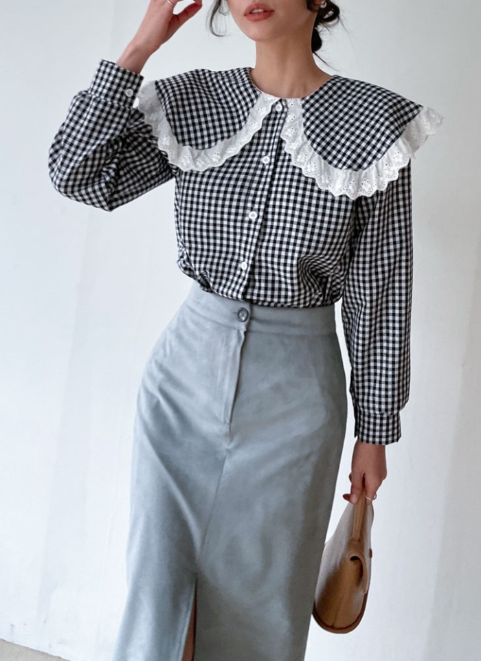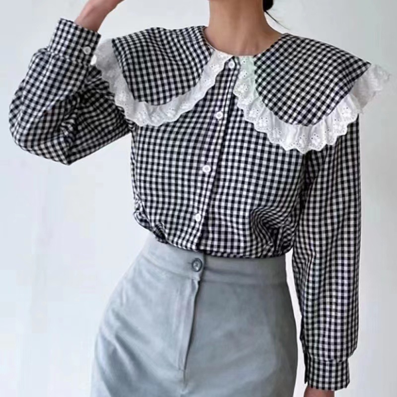 한국 세련된 옷깃 레이스 바느질 느슨한 대비 격자 무늬 셔츠