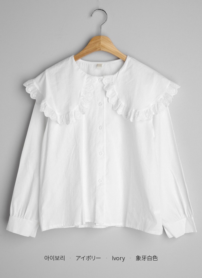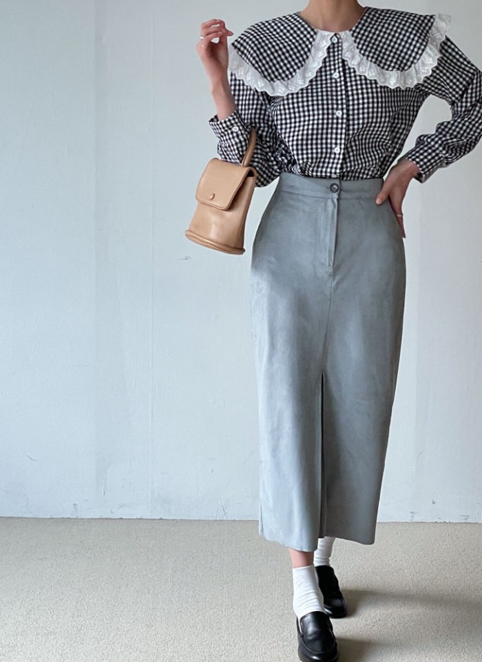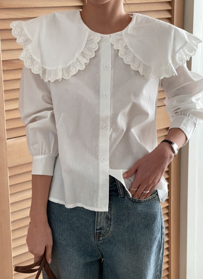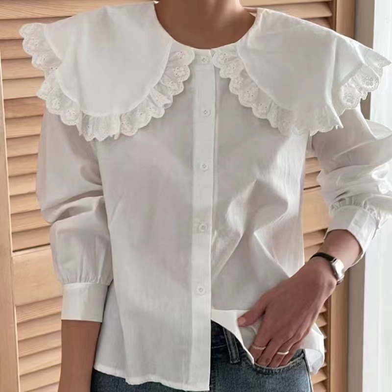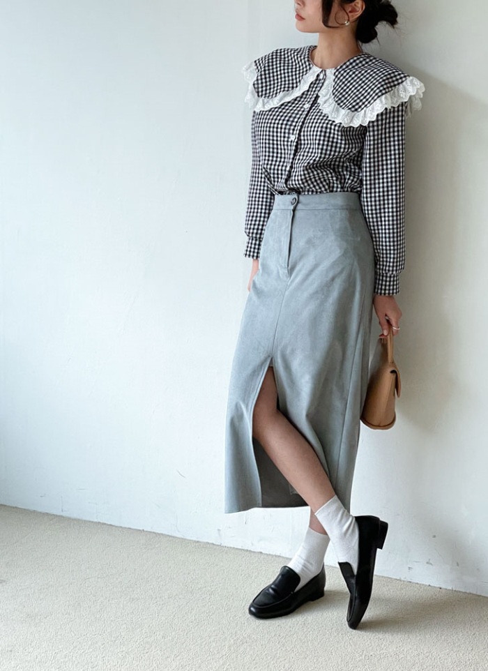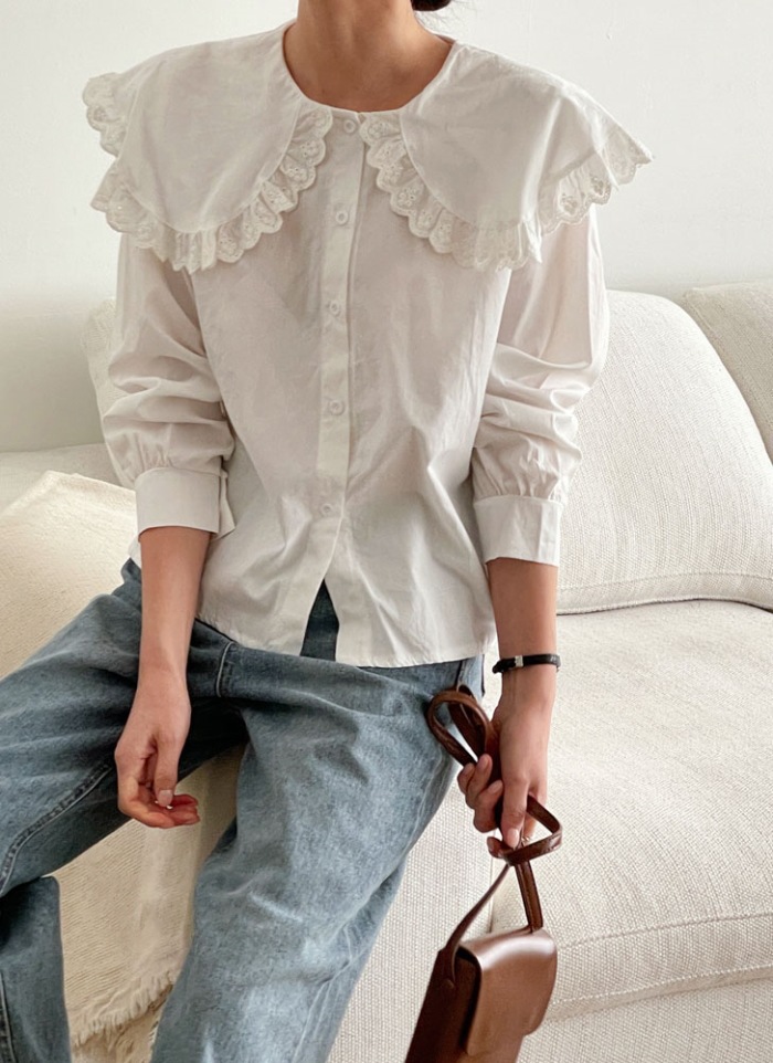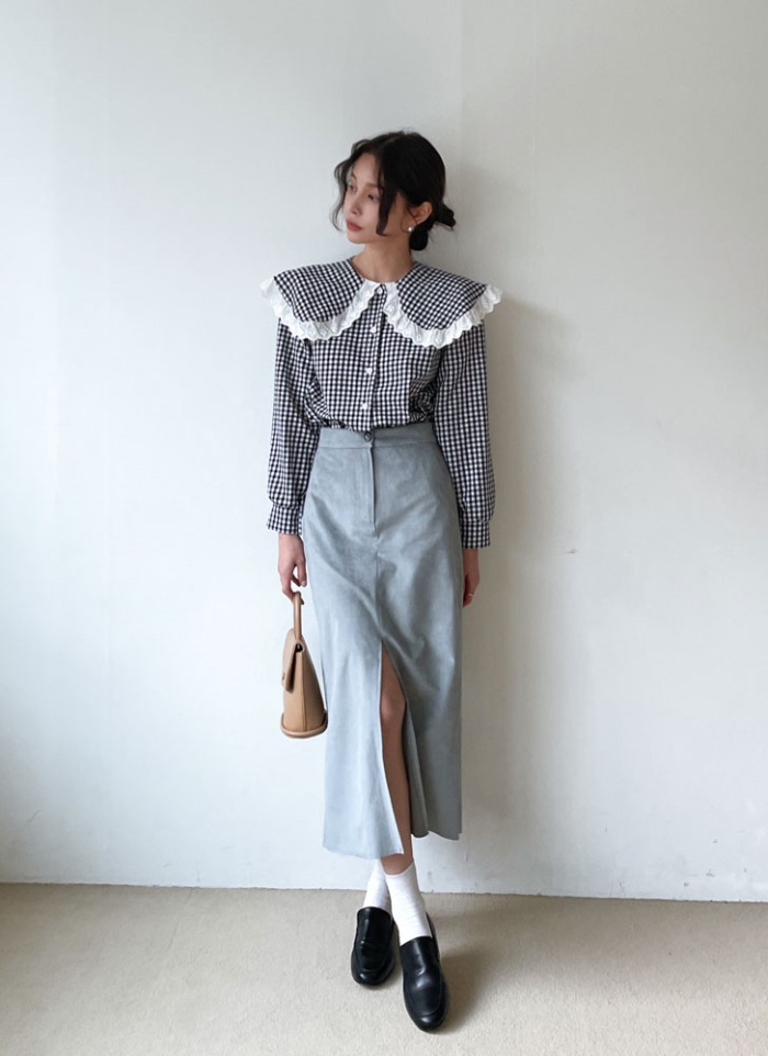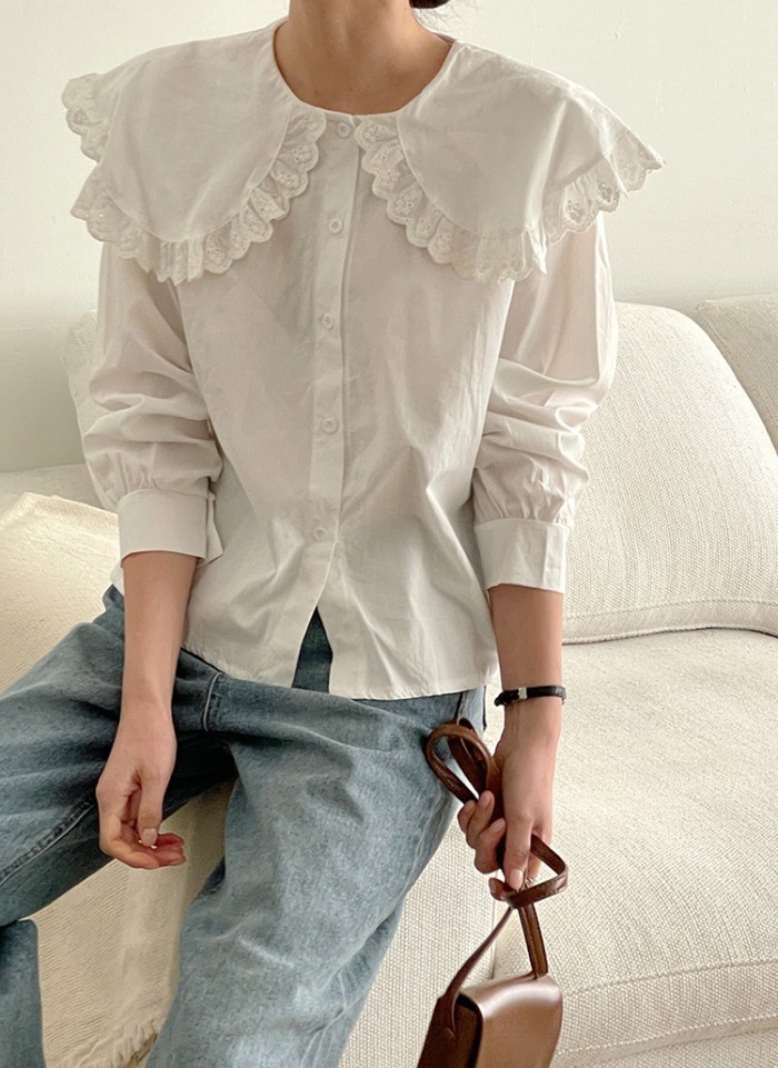 한국 세련된 옷깃 레이스 바느질 느슨한 대비 격자 무늬 셔츠