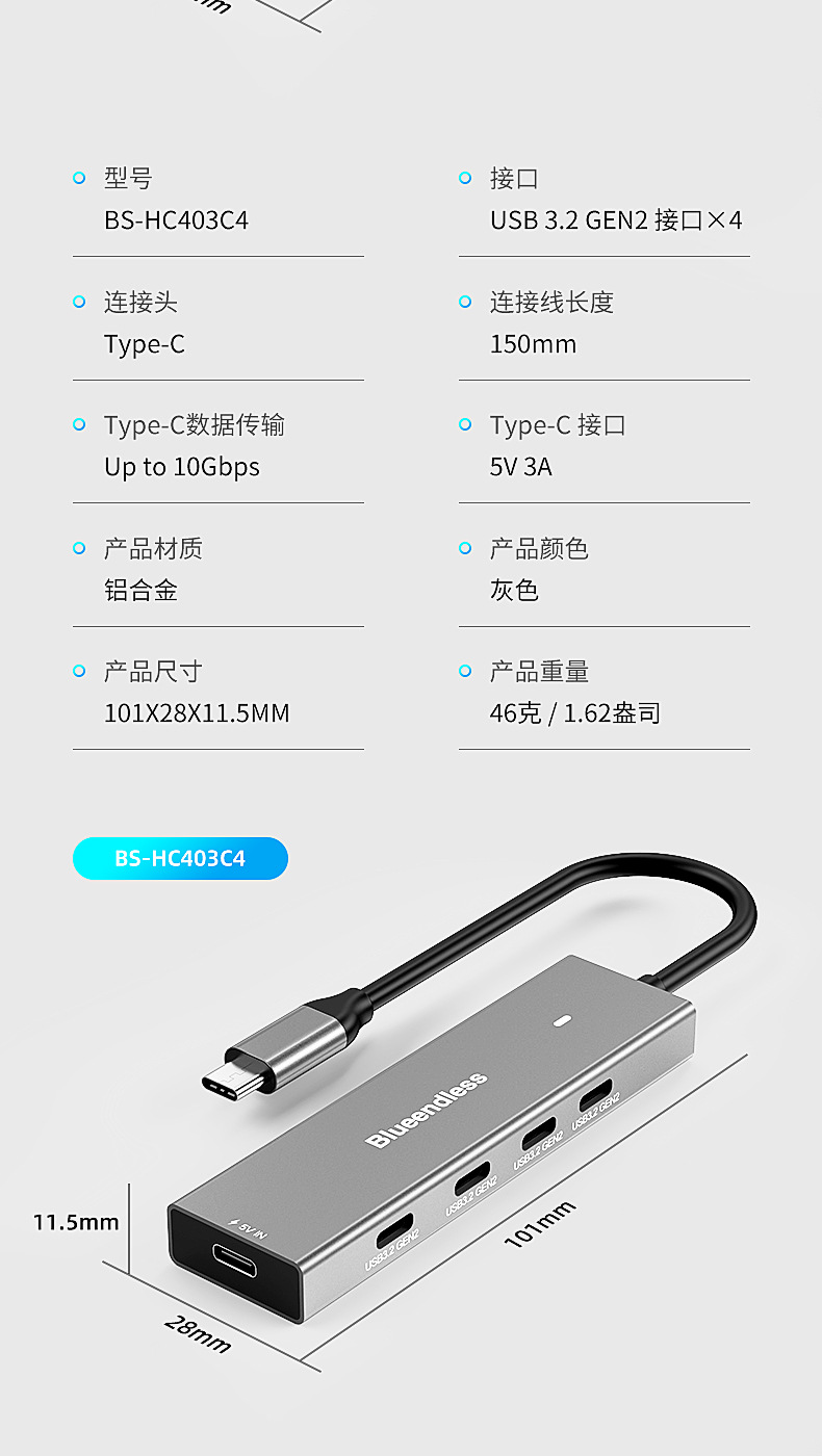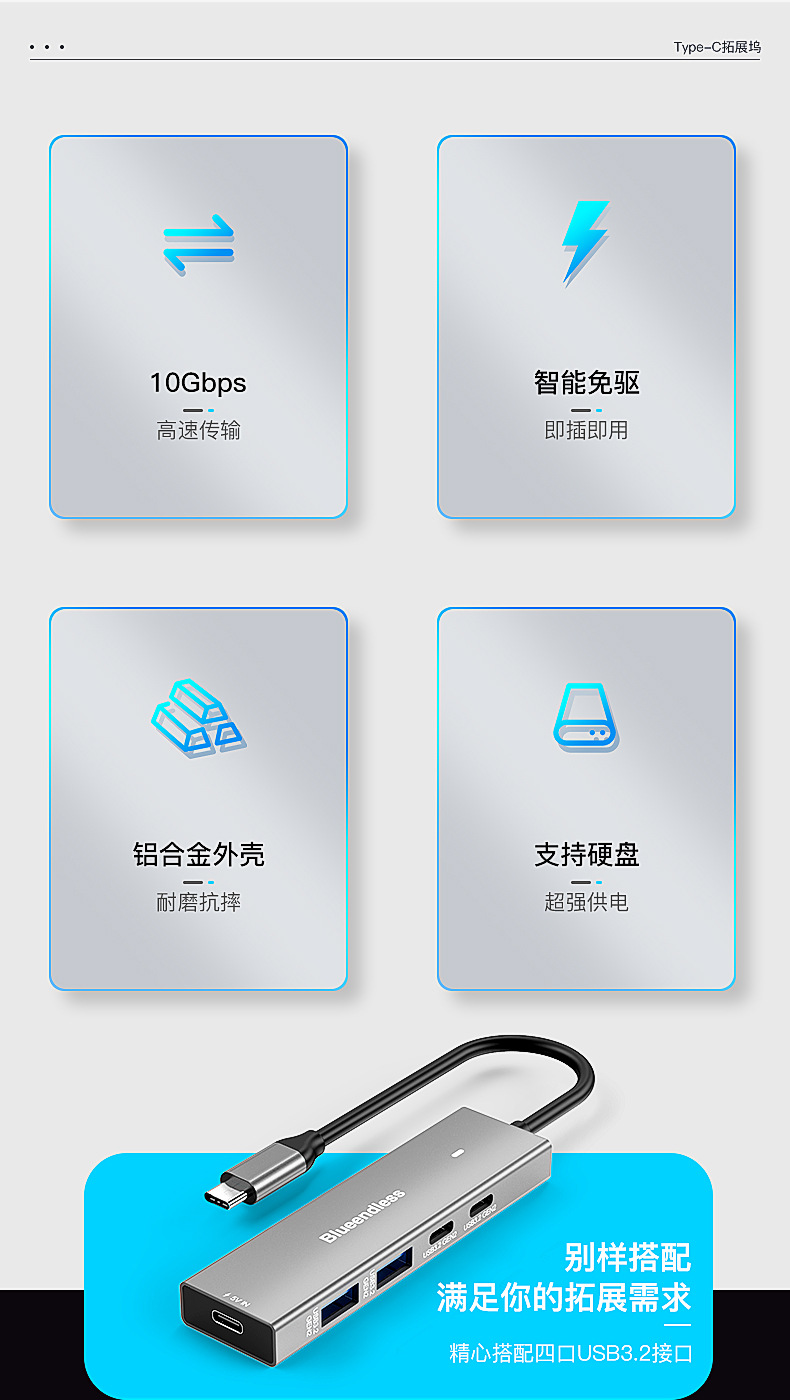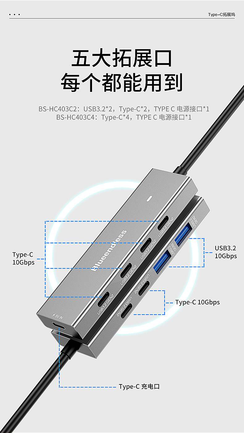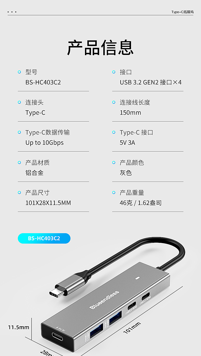 타입-C 허브 2A+2C USB3.2 Gen2 분배기 10Gbps 노트북 휴대폰 확장 도크 허브스토어 가기