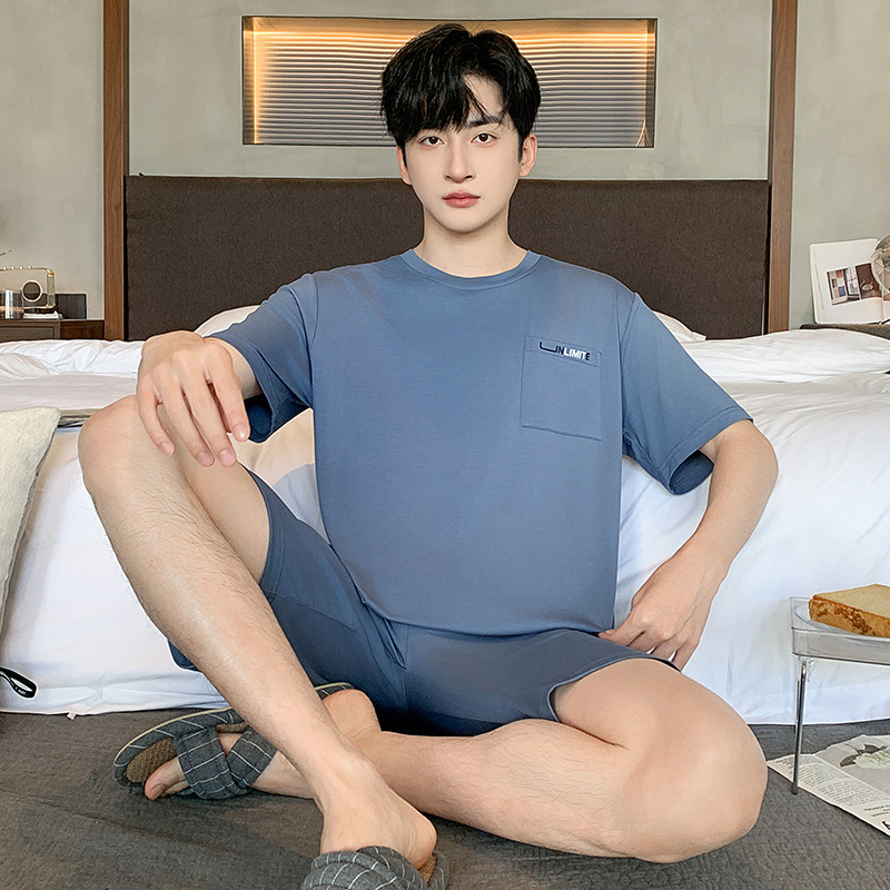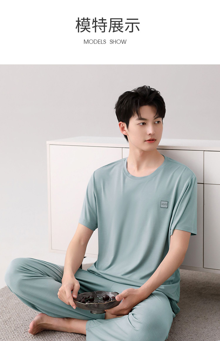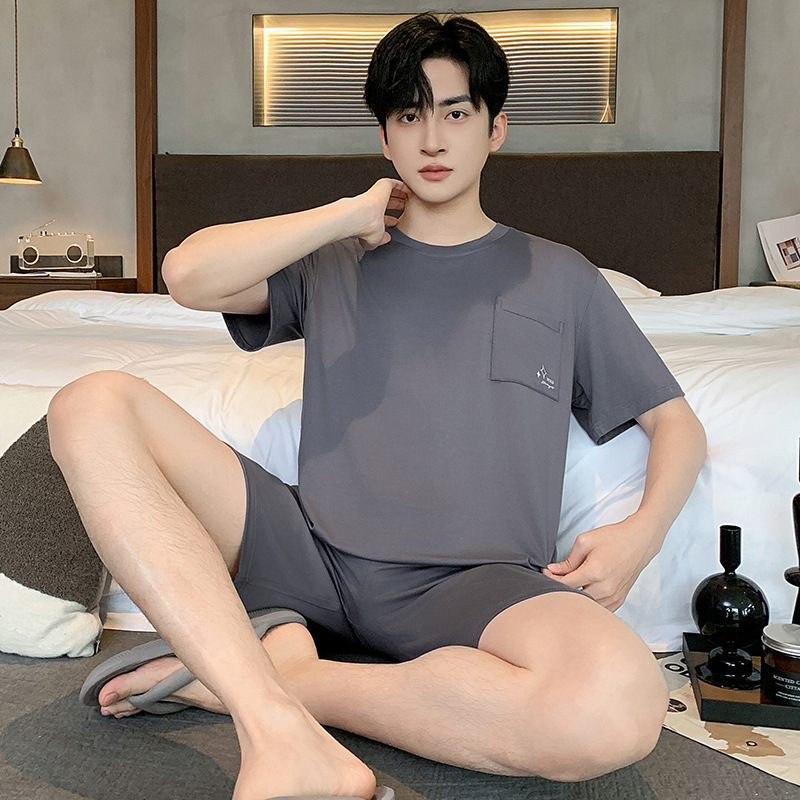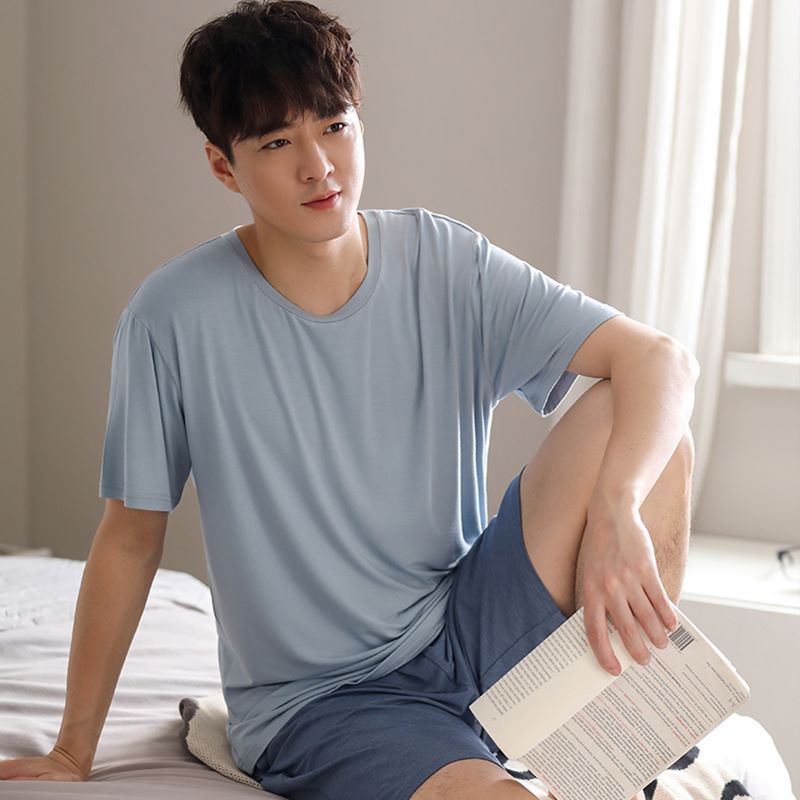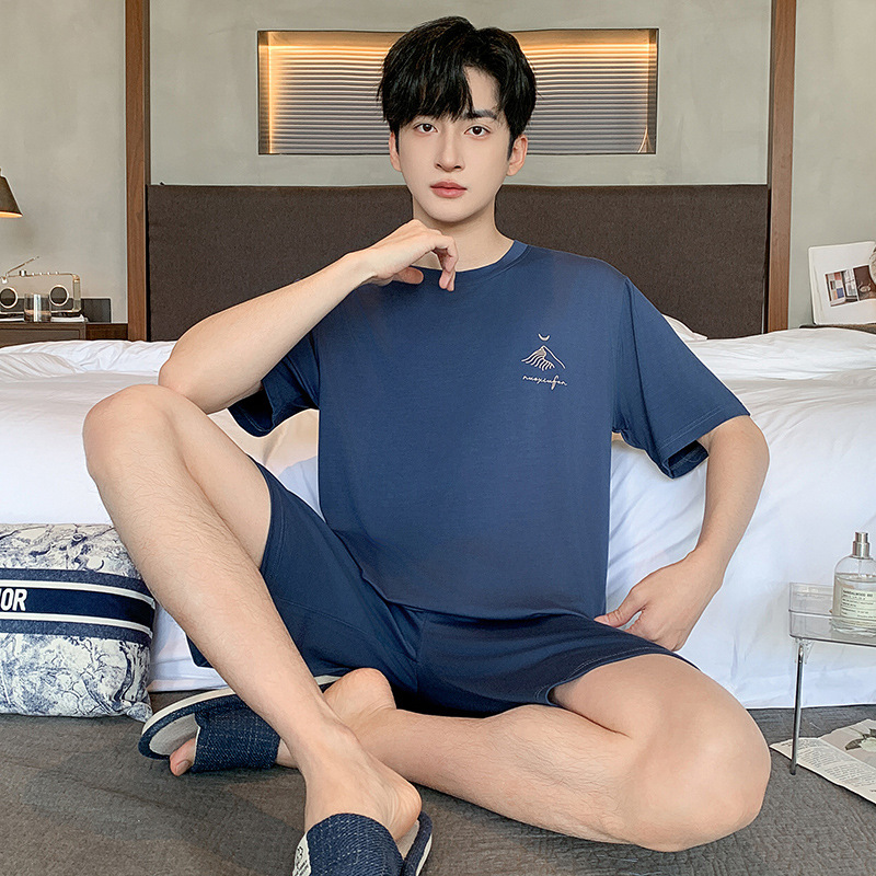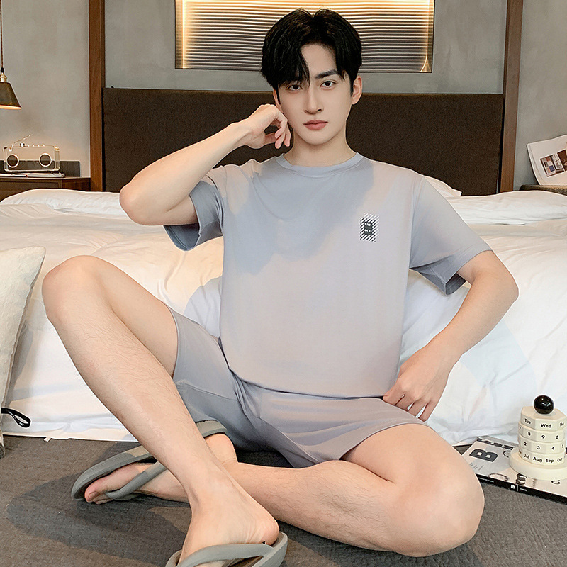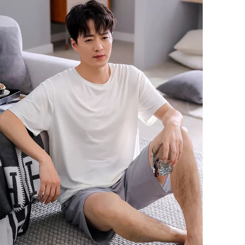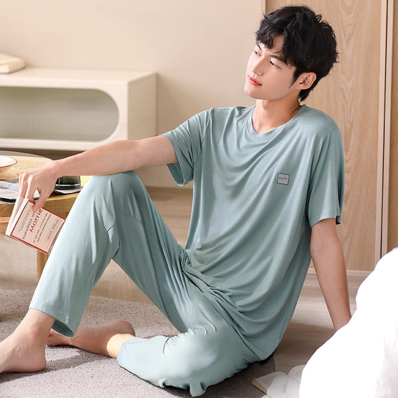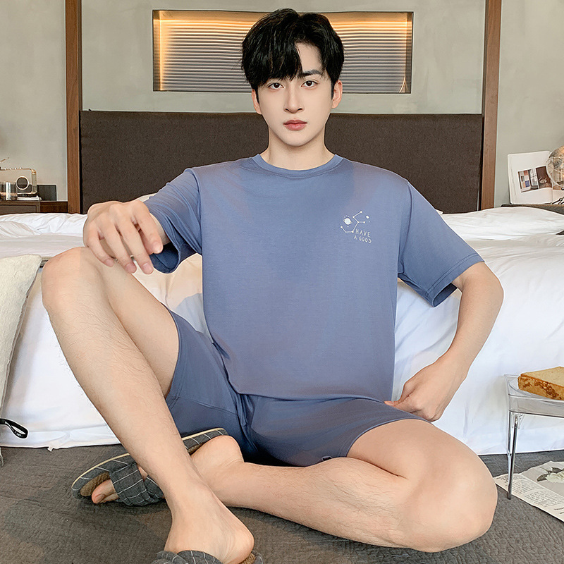 모달 파자마 남자 여름 얇은 반팔 바지 아이스 실크 홈 착용 여름 느슨한 플러스 사이즈 세트스토어 가기