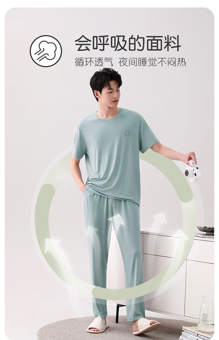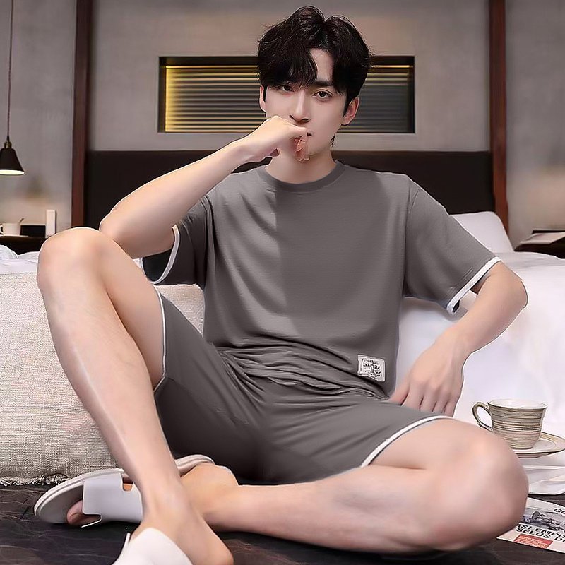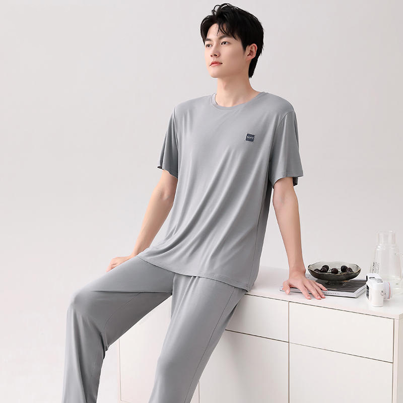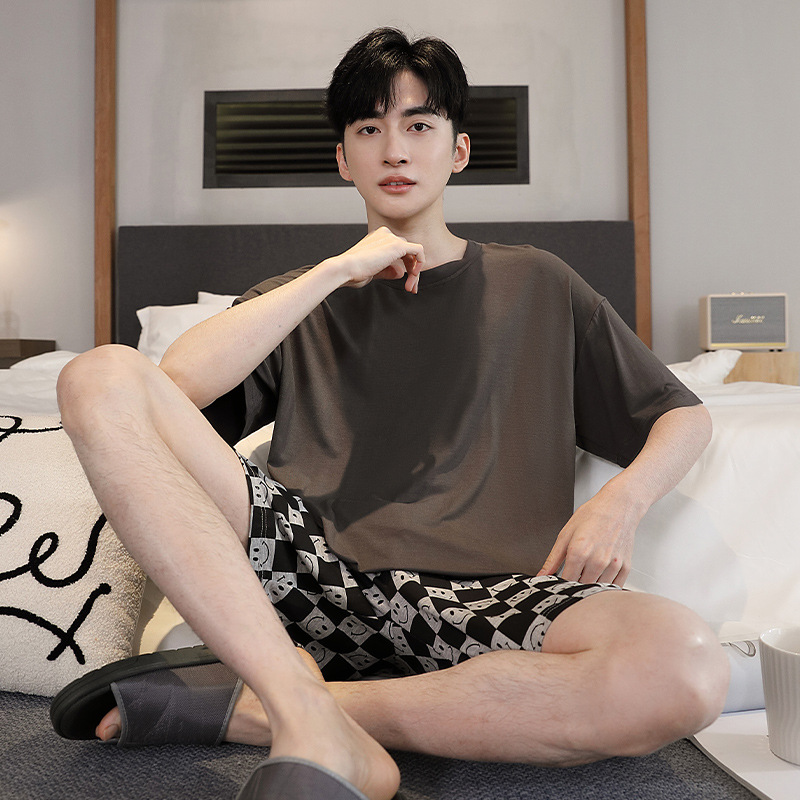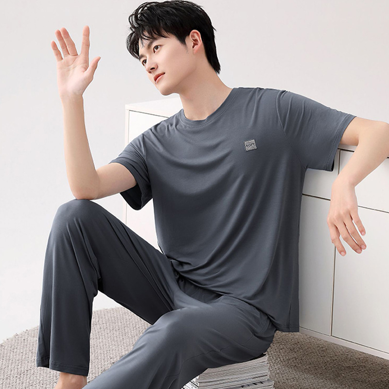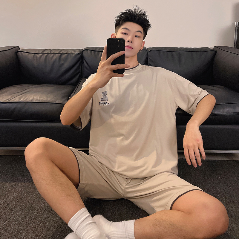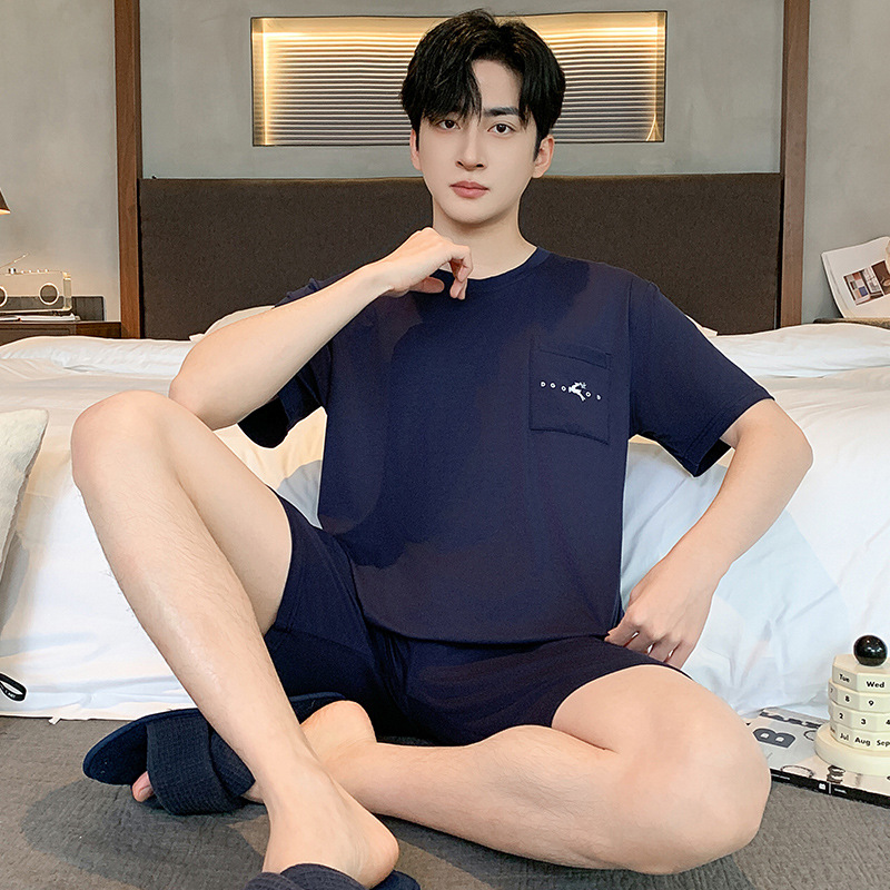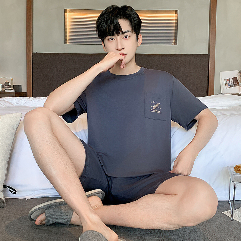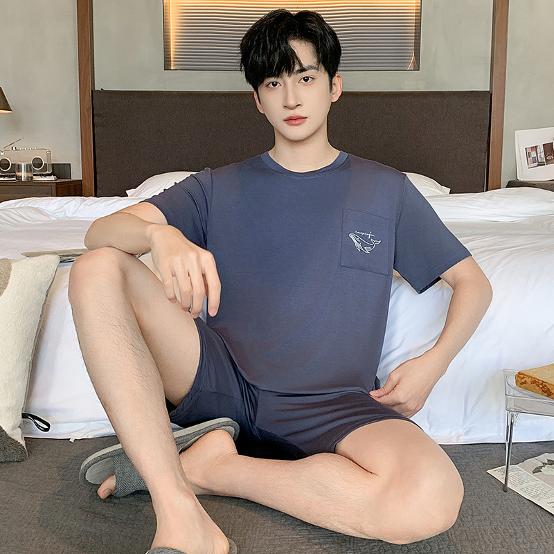 모달 파자마 남자 여름 얇은 반팔 바지 아이스 실크 홈 착용 여름 느슨한 플러스 사이즈 세트스토어 가기
