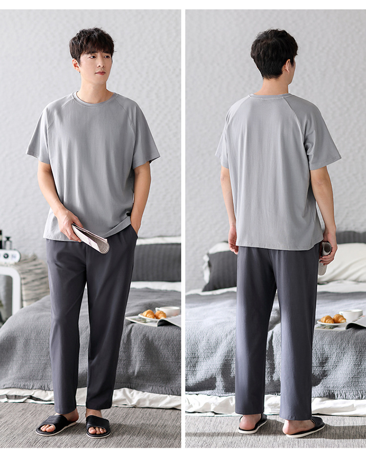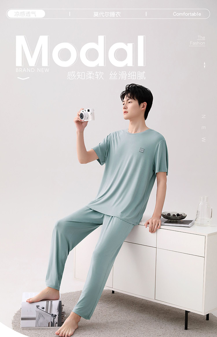 모달 파자마 남자 여름 얇은 반팔 바지 아이스 실크 홈 착용 여름 느슨한 플러스 사이즈 세트