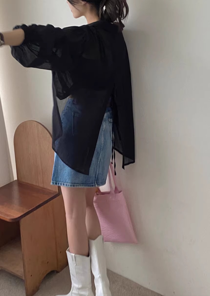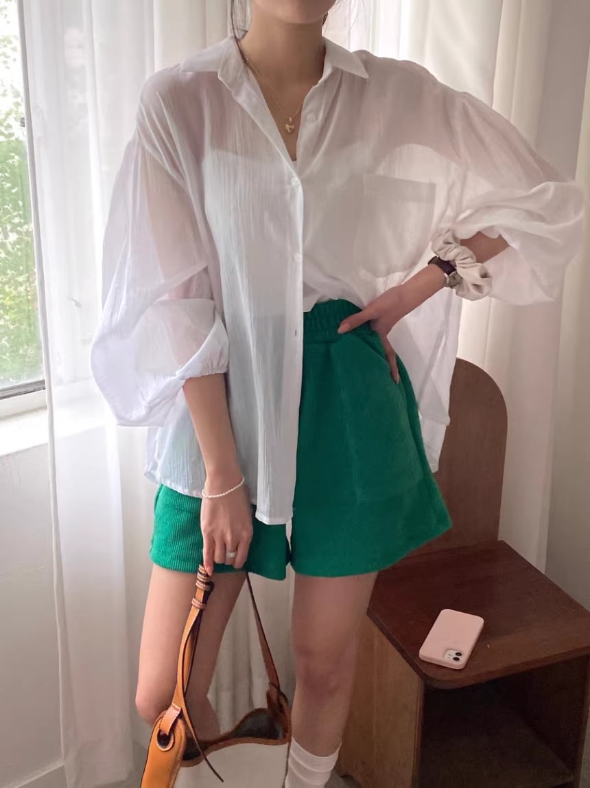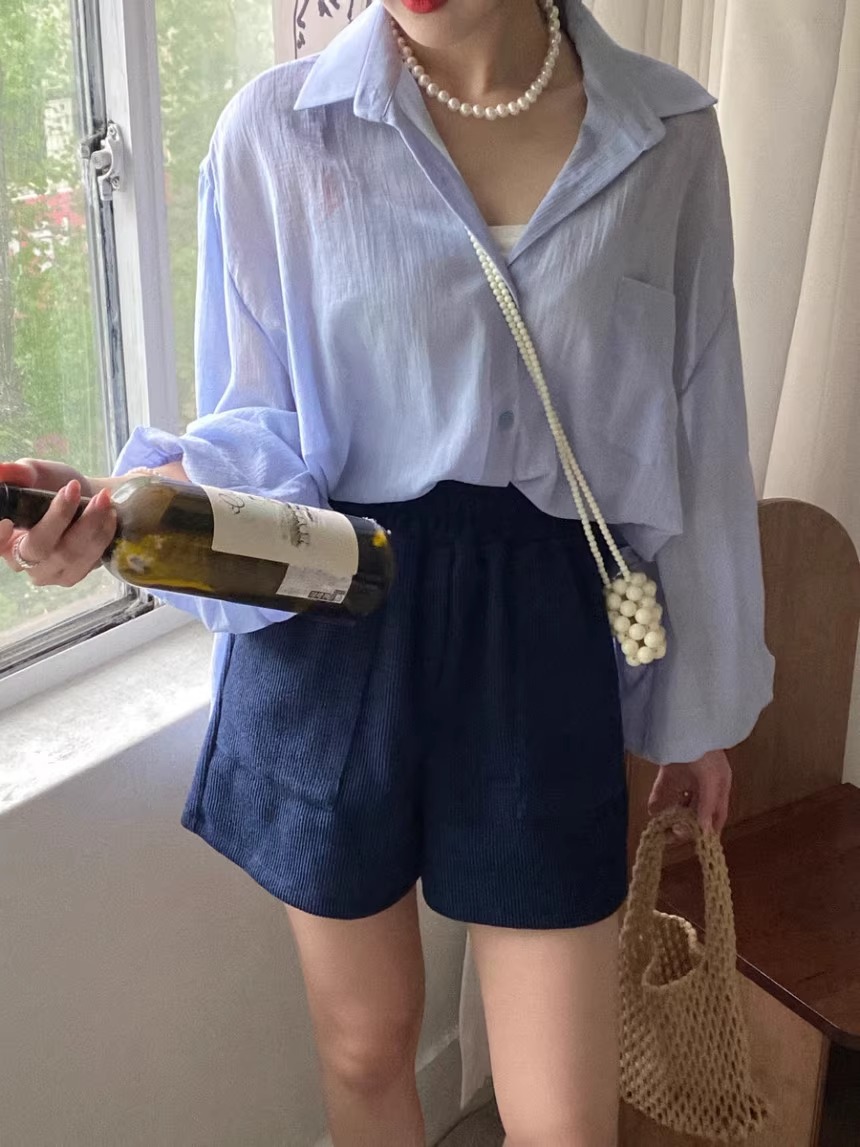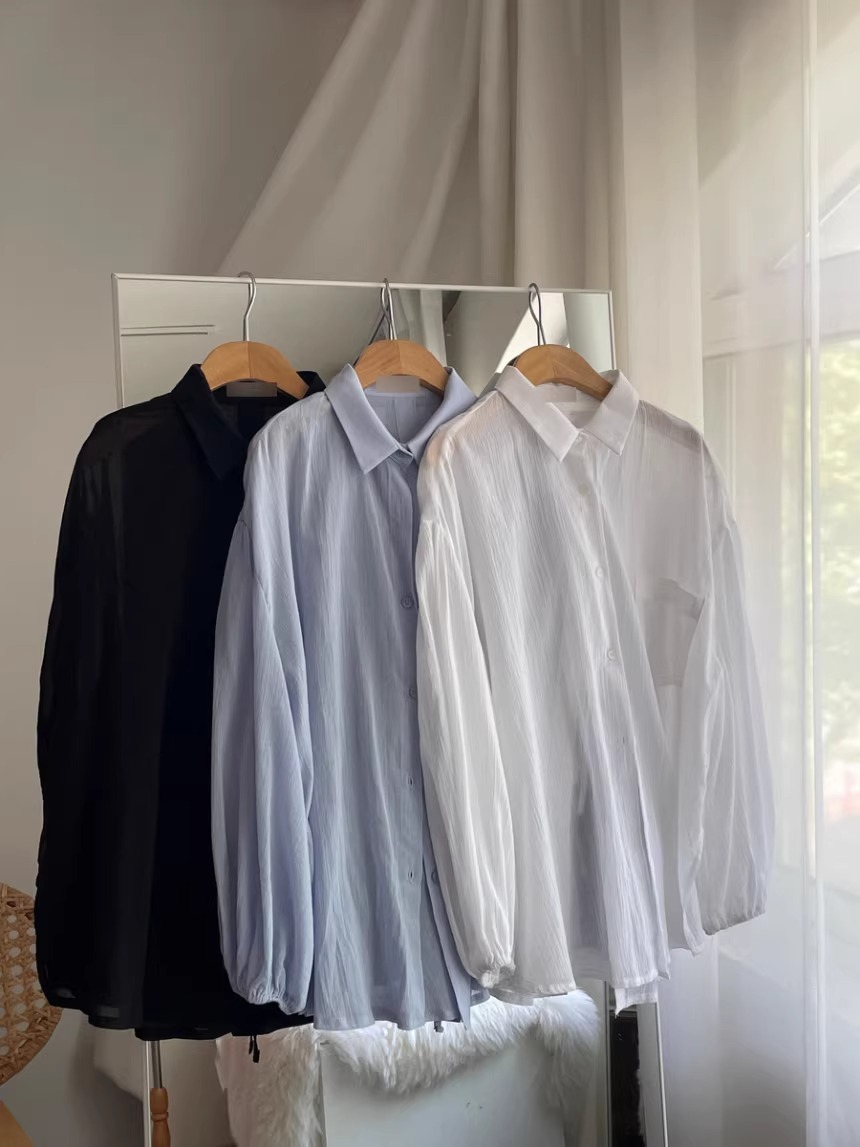 한국 세련된 봄 프랑스 기질 옷깃 시계 다시 분할 디자인 느낌 마이크로 투명 얇은 자외선 차단제 셔츠스토어 가기