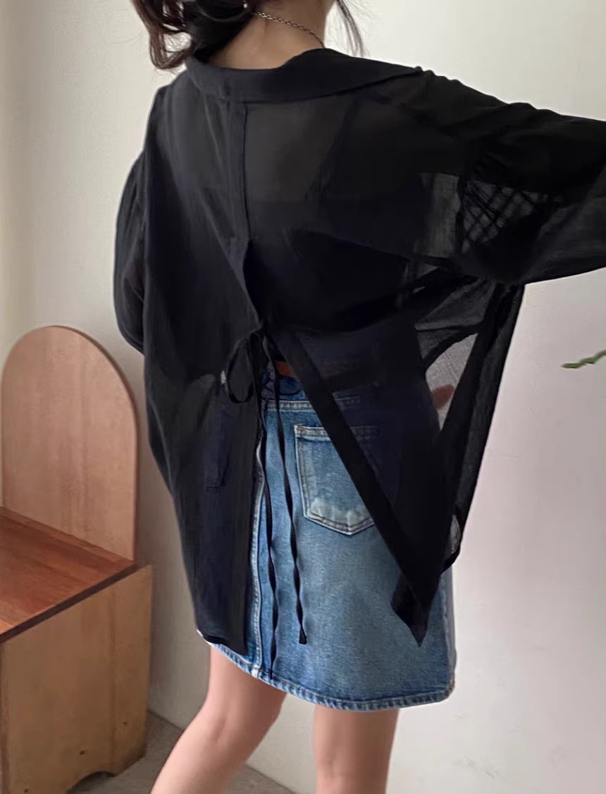 한국 세련된 봄 프랑스 기질 옷깃 시계 다시 분할 디자인 느낌 마이크로 투명 얇은 자외선 차단제 셔츠