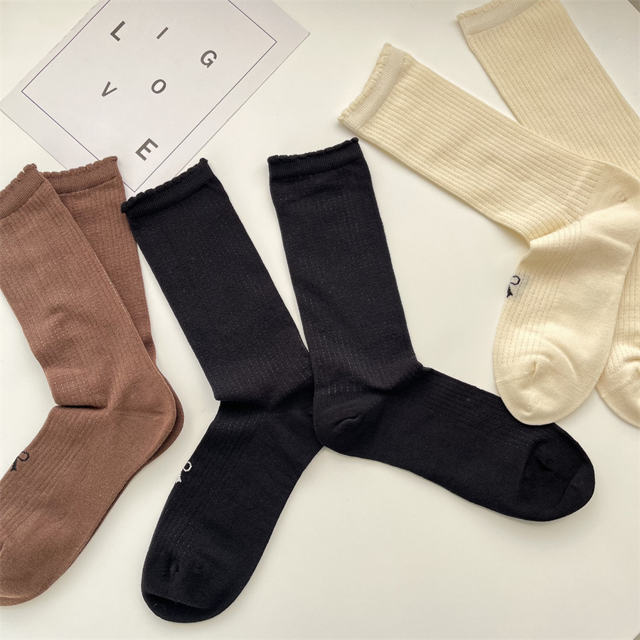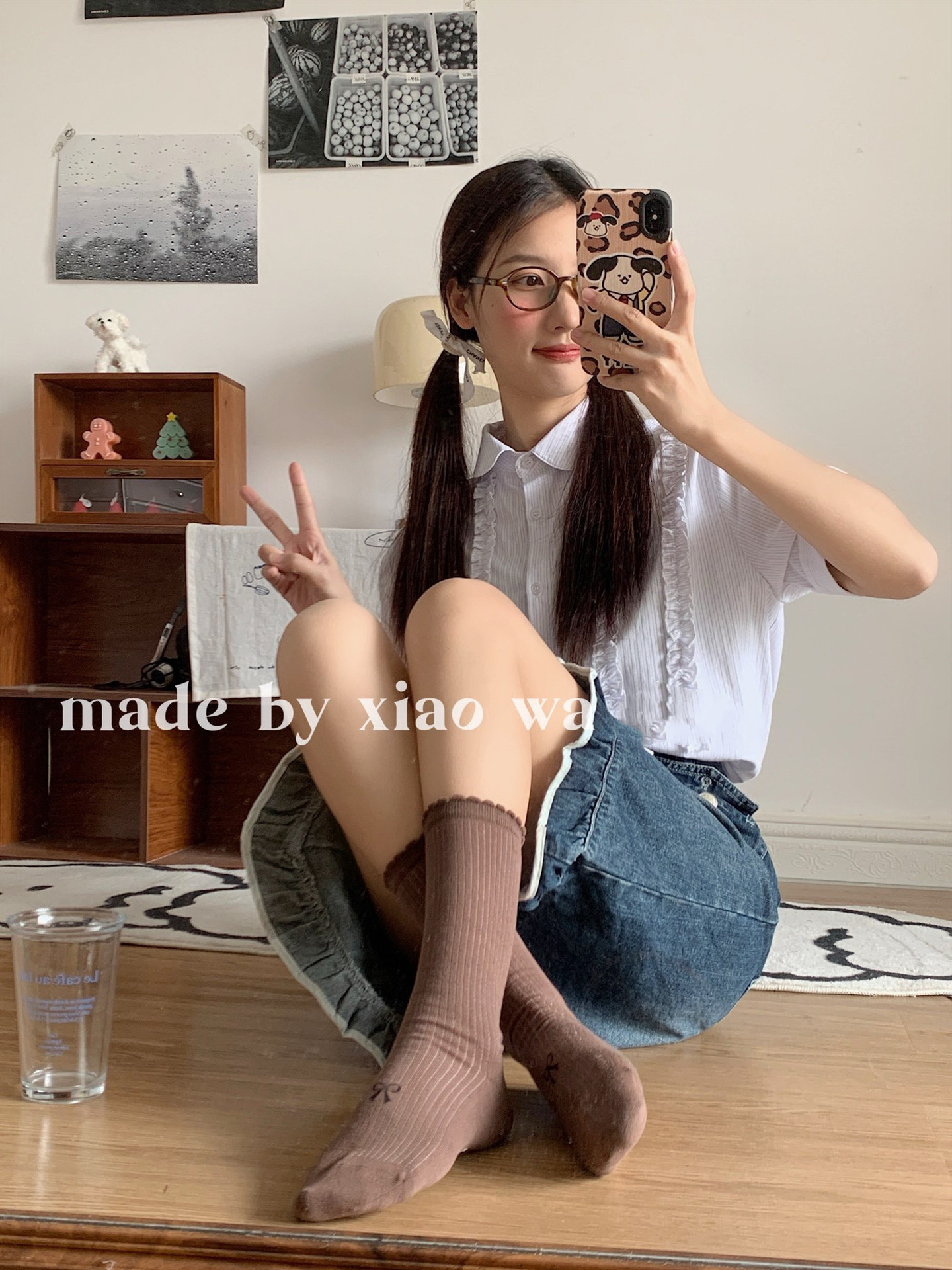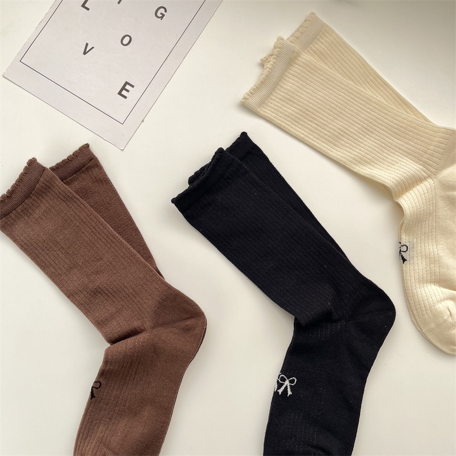 한국 스타일 귀여운 instep 활 양말 여성 일본식 나무 귀 메쉬 중간 종아리 길이 양말 코튼 단색 파일 양말