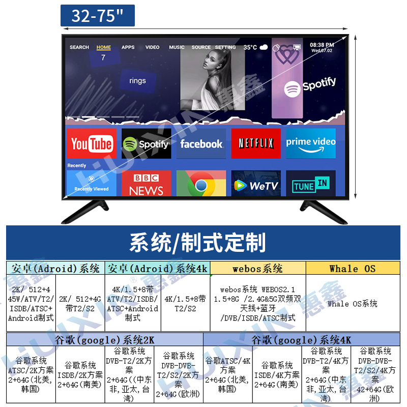 Hui Xin 지능형 네트워크 TV 고화질 초박형 LCD 디스플레이 32/55/ 65inch 가정용 호텔 TV