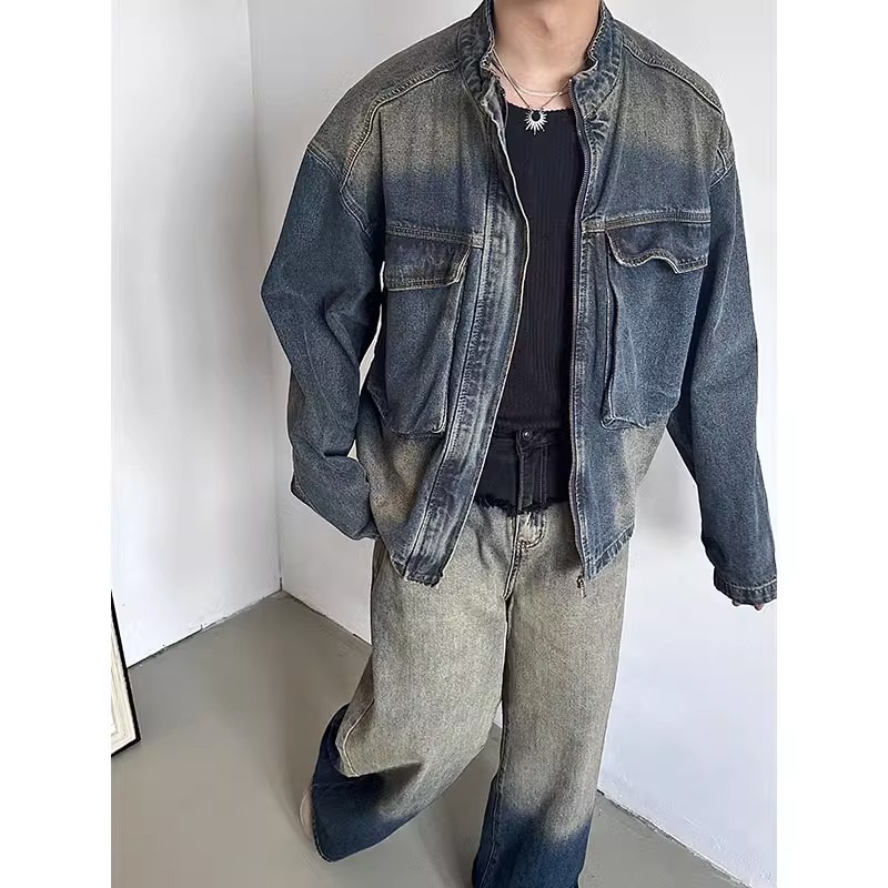봄과 가을 복고풍 느슨한 대형 포켓 스탠드 칼라 데님 코트 남성용 고급 캐주얼 지퍼 작업복 재킷 탑스토어 가기