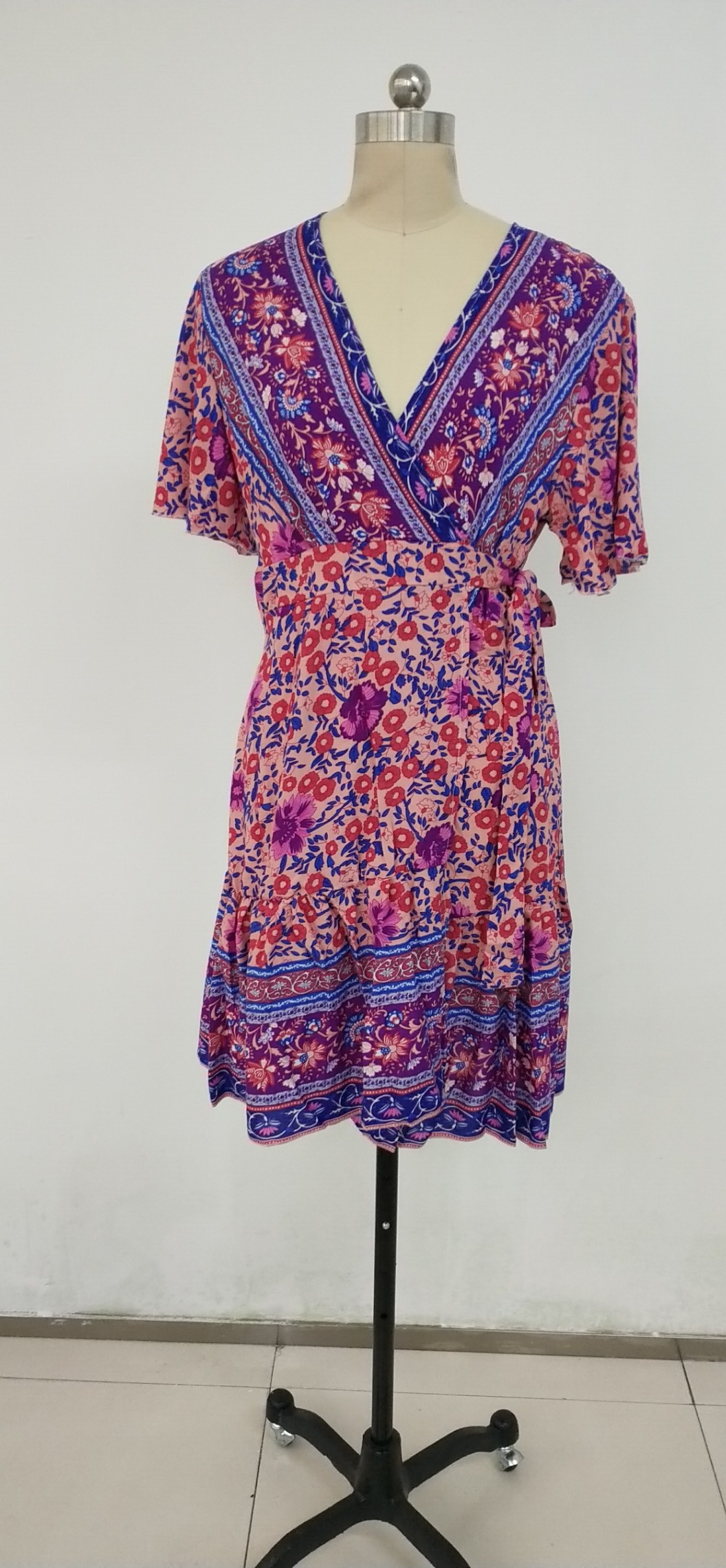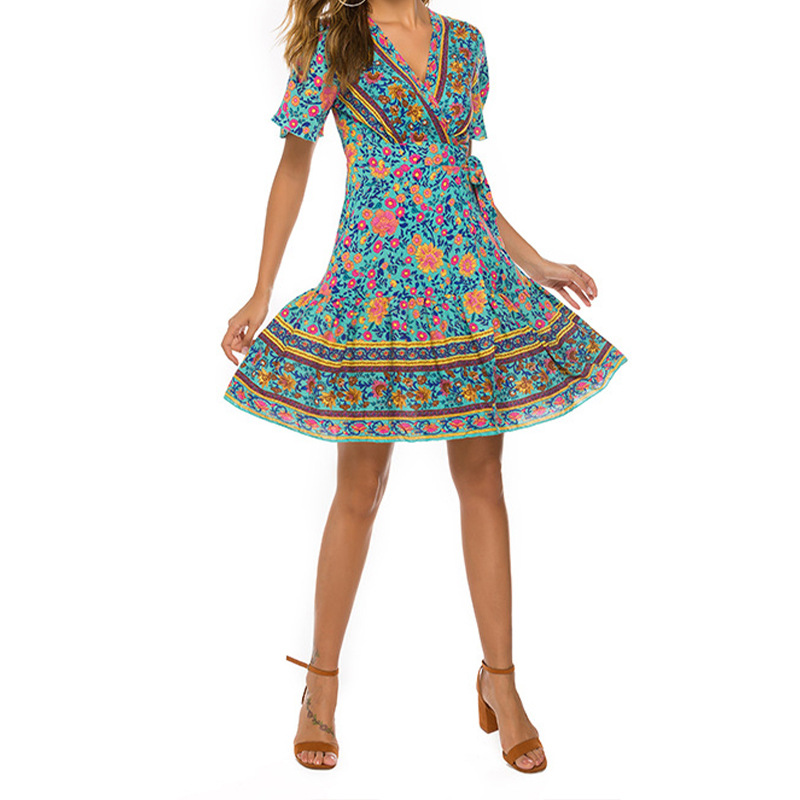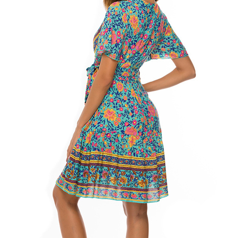 여름 새로운 여성 보헤미안 해변 휴가 스타일 짧은 소매 깊은 V 큰 스윙 주름 인쇄 원피스 국경