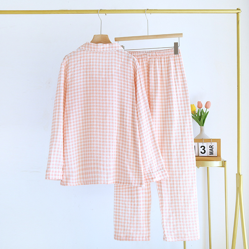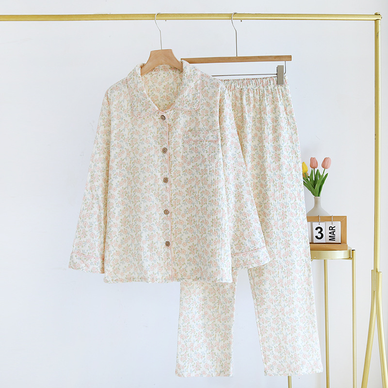 봄 및 가을 얇은 긴 소매 꽃 옷깃 여름 달콤한 가정복 잠옷 세트 면화 여성을위한 버블 코튼 원사 잠옷