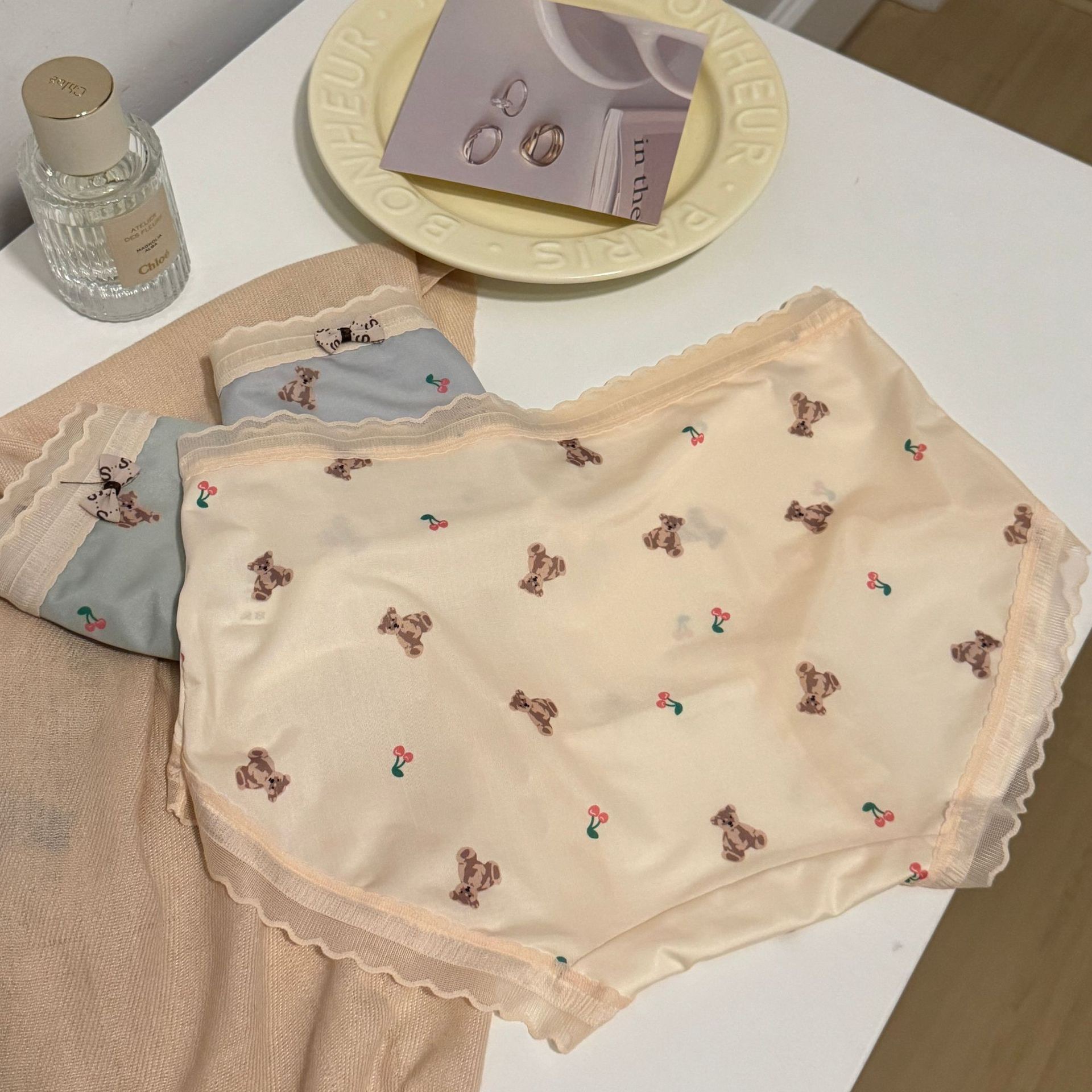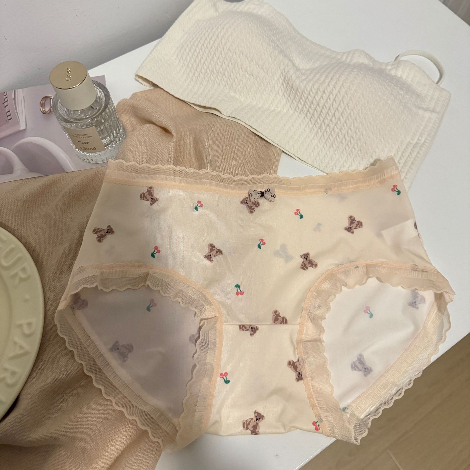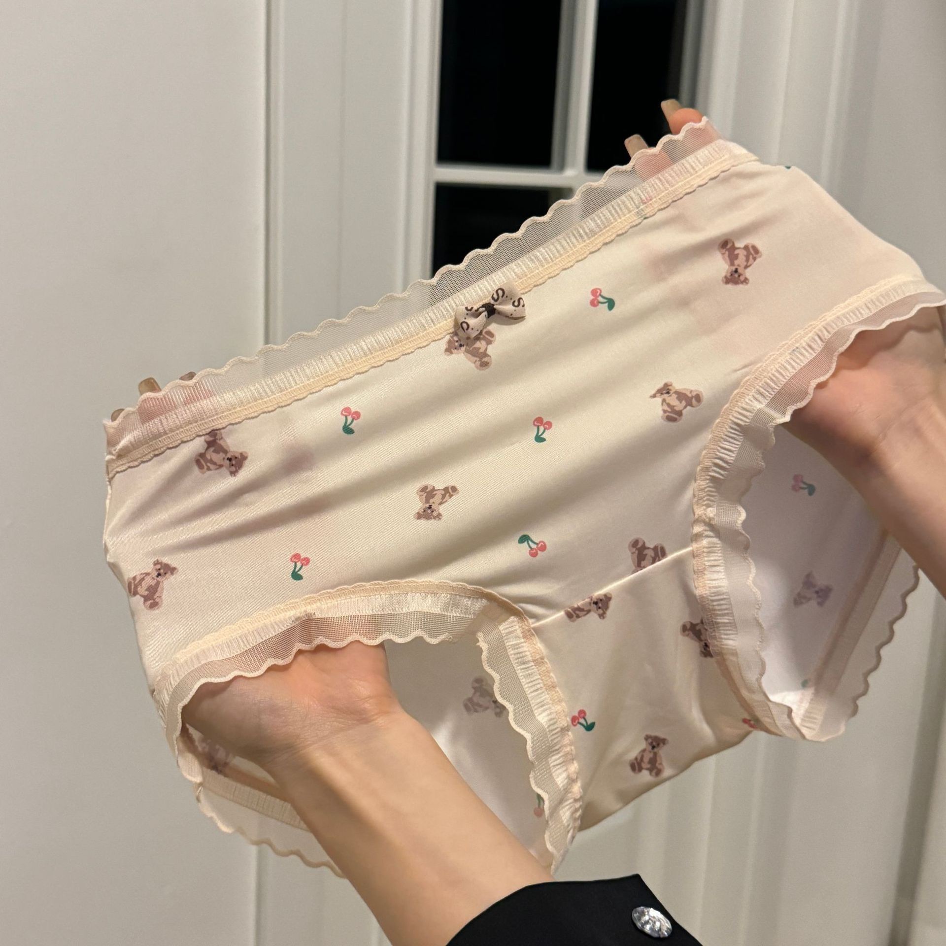 울트라 얇은 누드 아이스 실크 속옷 여성의 중간 허리 달콤한 곰 인쇄 소녀의 통기성 항균면 가랑이 브리프