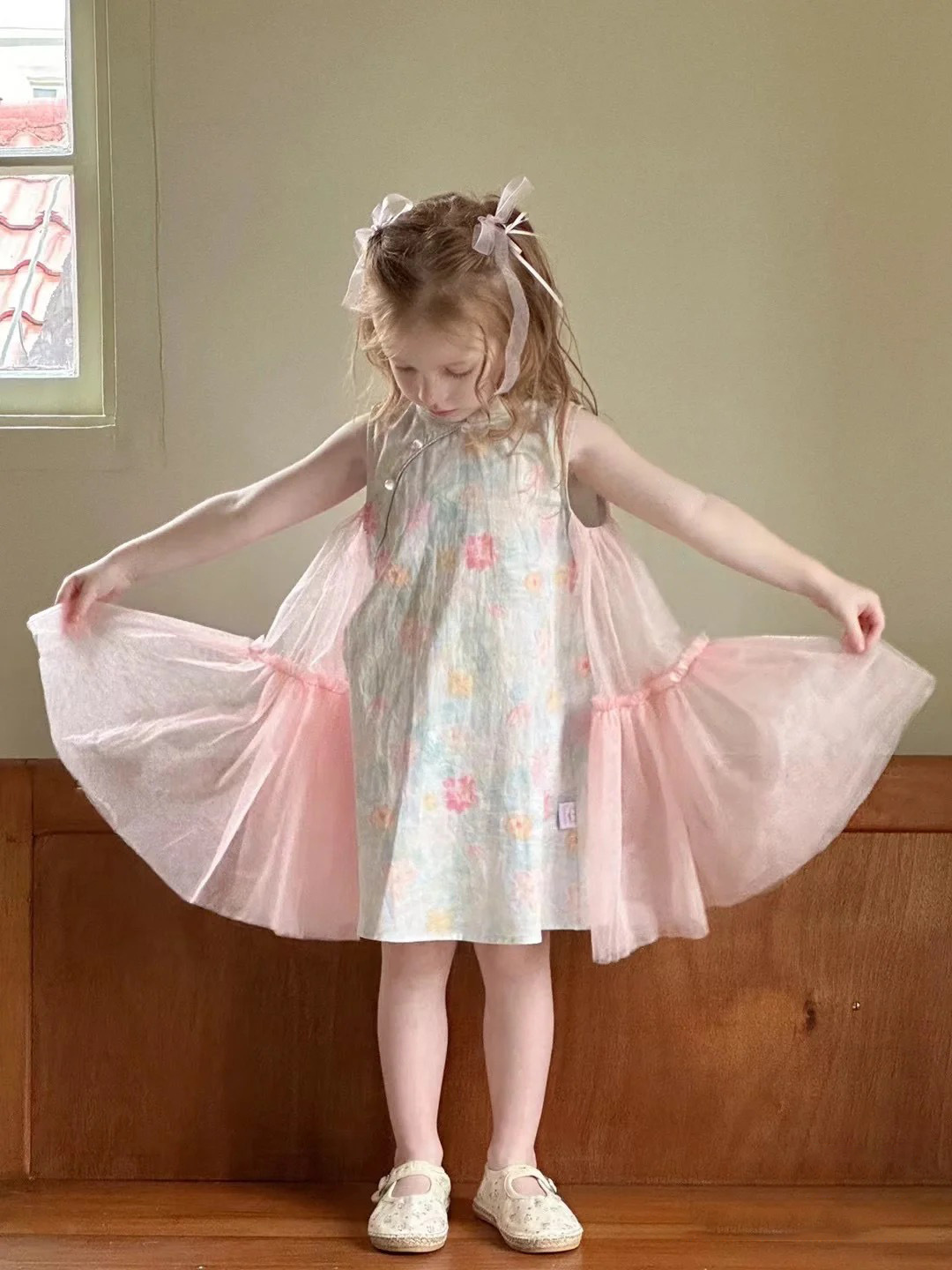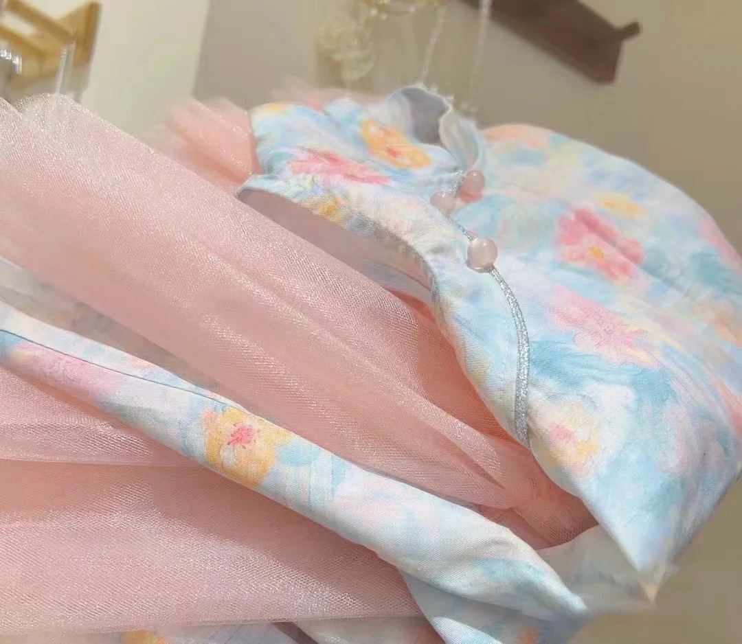 소녀 원피스 2024 여름 새 소녀 중국 치파오 거즈 원피스 중소 어린이를위한 세련된 조끼 원피스