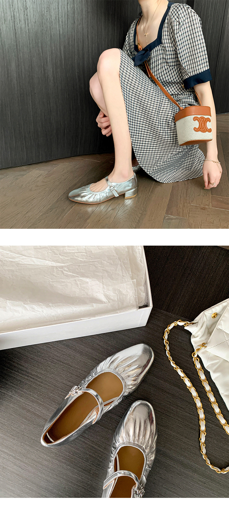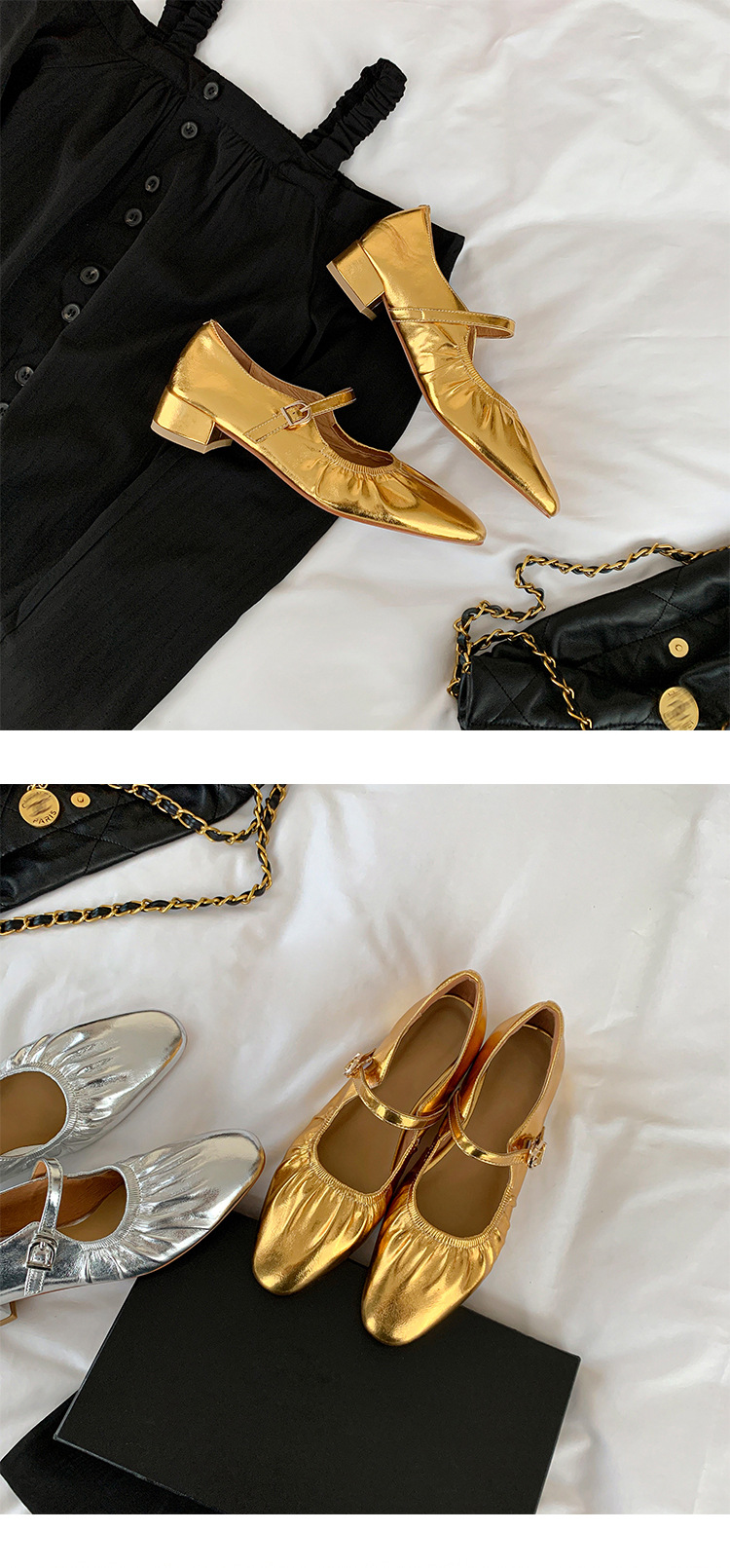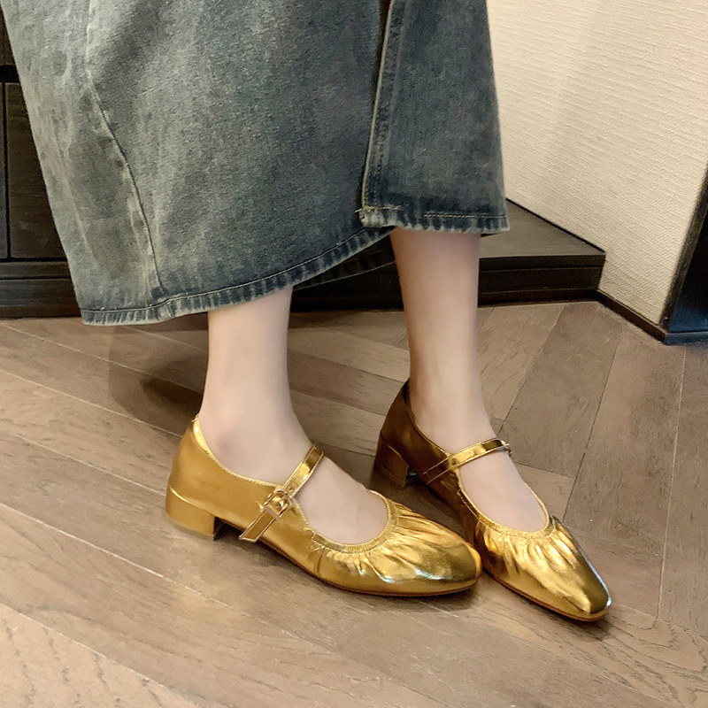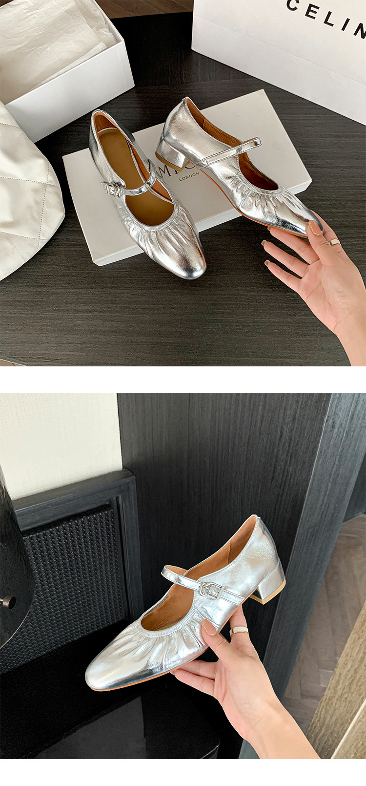 실버 메리 제인 주름 둥근 발가락 청키 뒤꿈치 골든 발레 슈즈 여성 정품 가죽 프랑스 복고풍 힘줄 바닥 2024