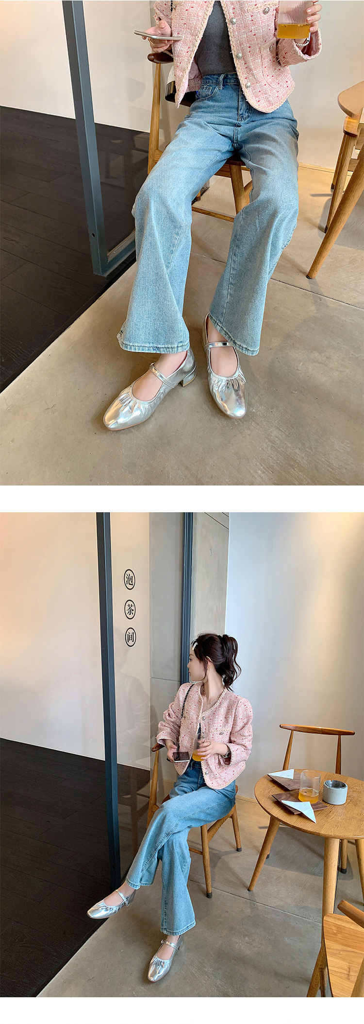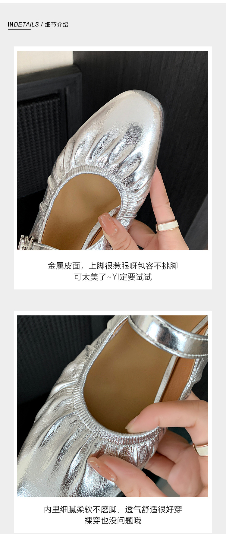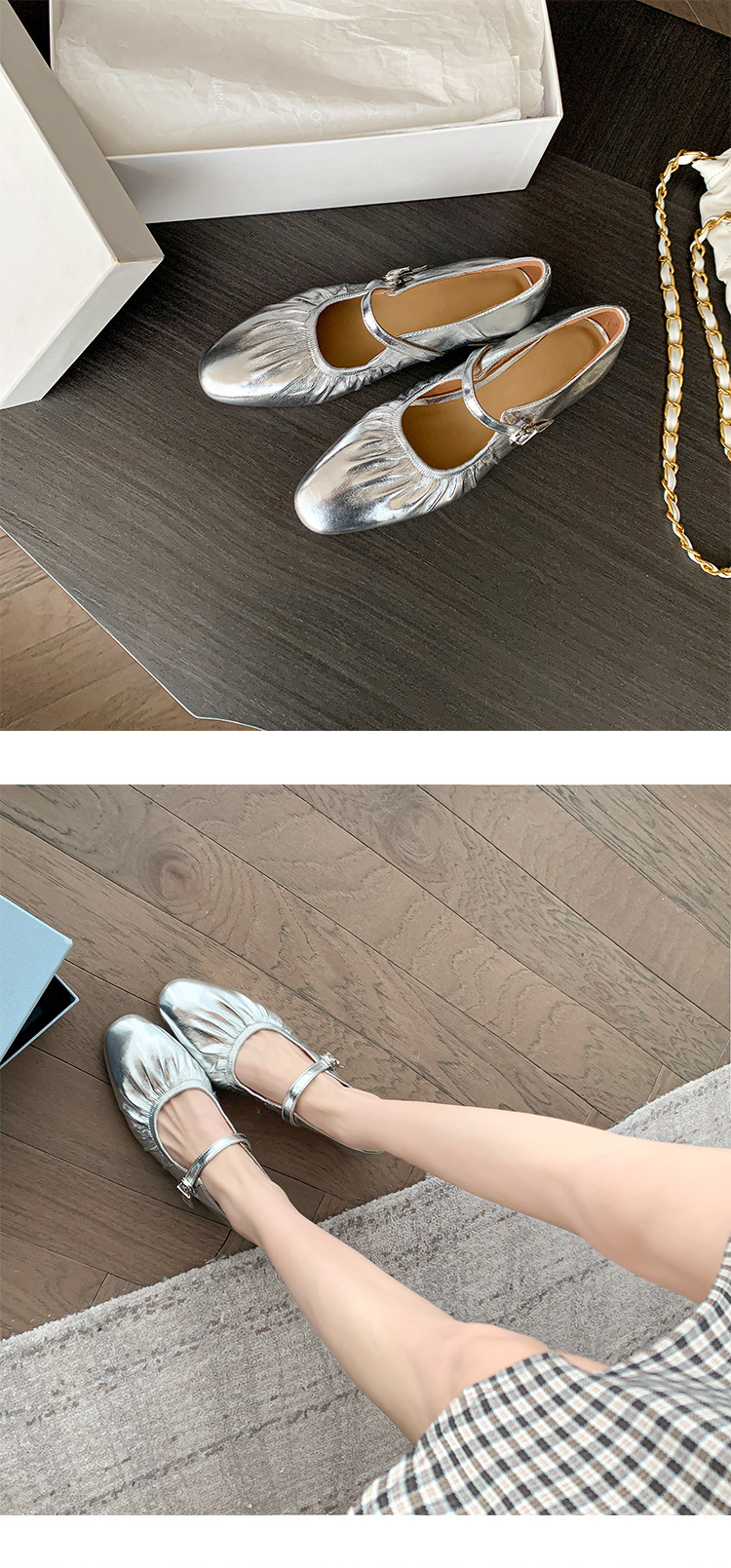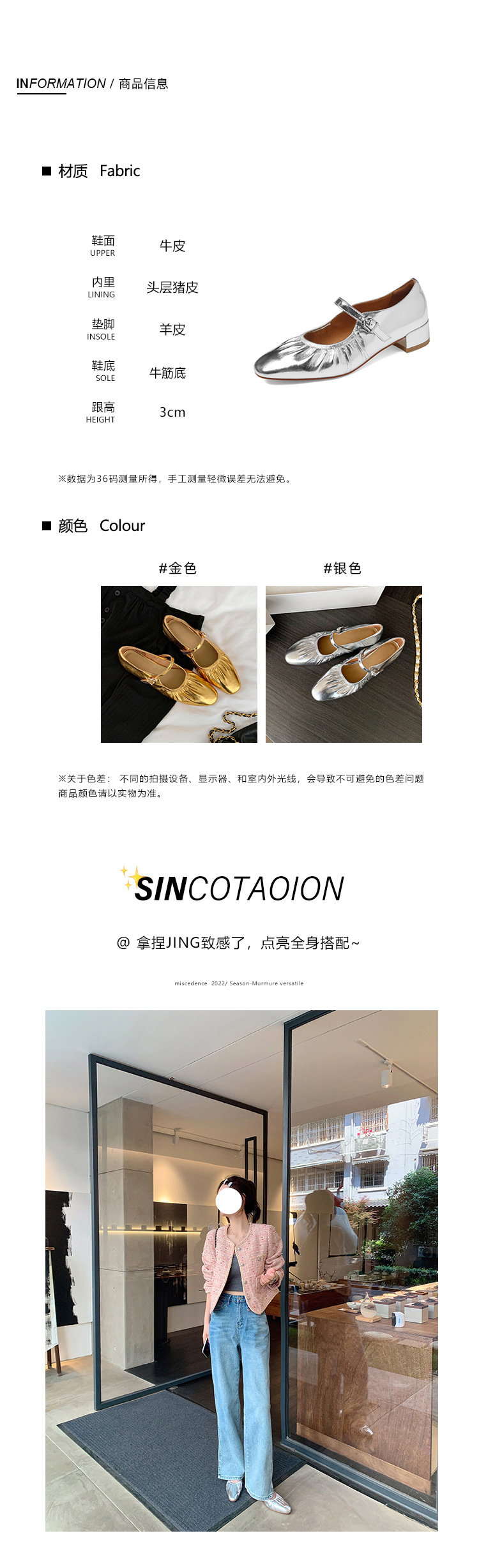 실버 메리 제인 주름 둥근 발가락 청키 뒤꿈치 골든 발레 슈즈 여성 정품 가죽 프랑스 복고풍 힘줄 바닥 2024