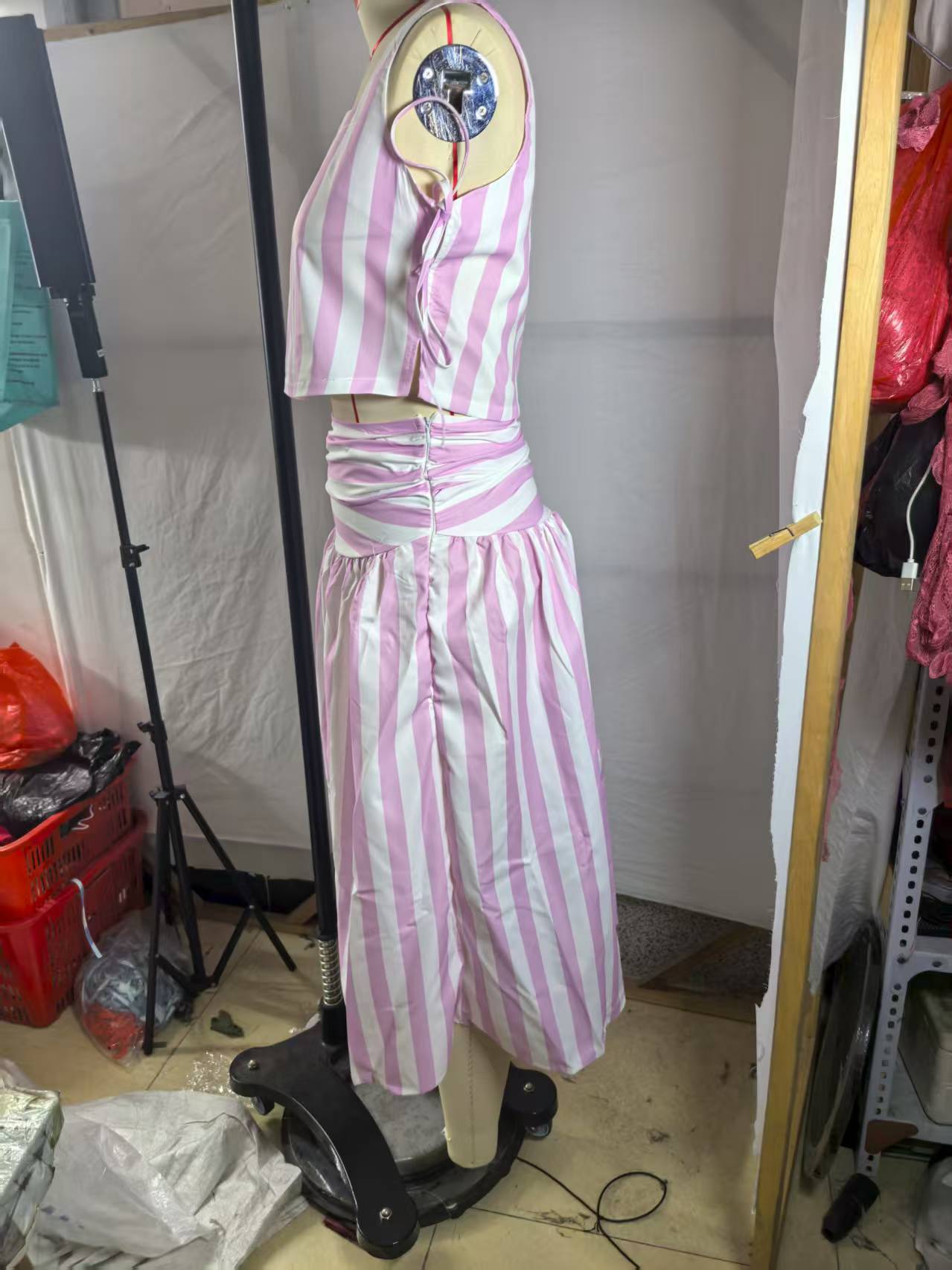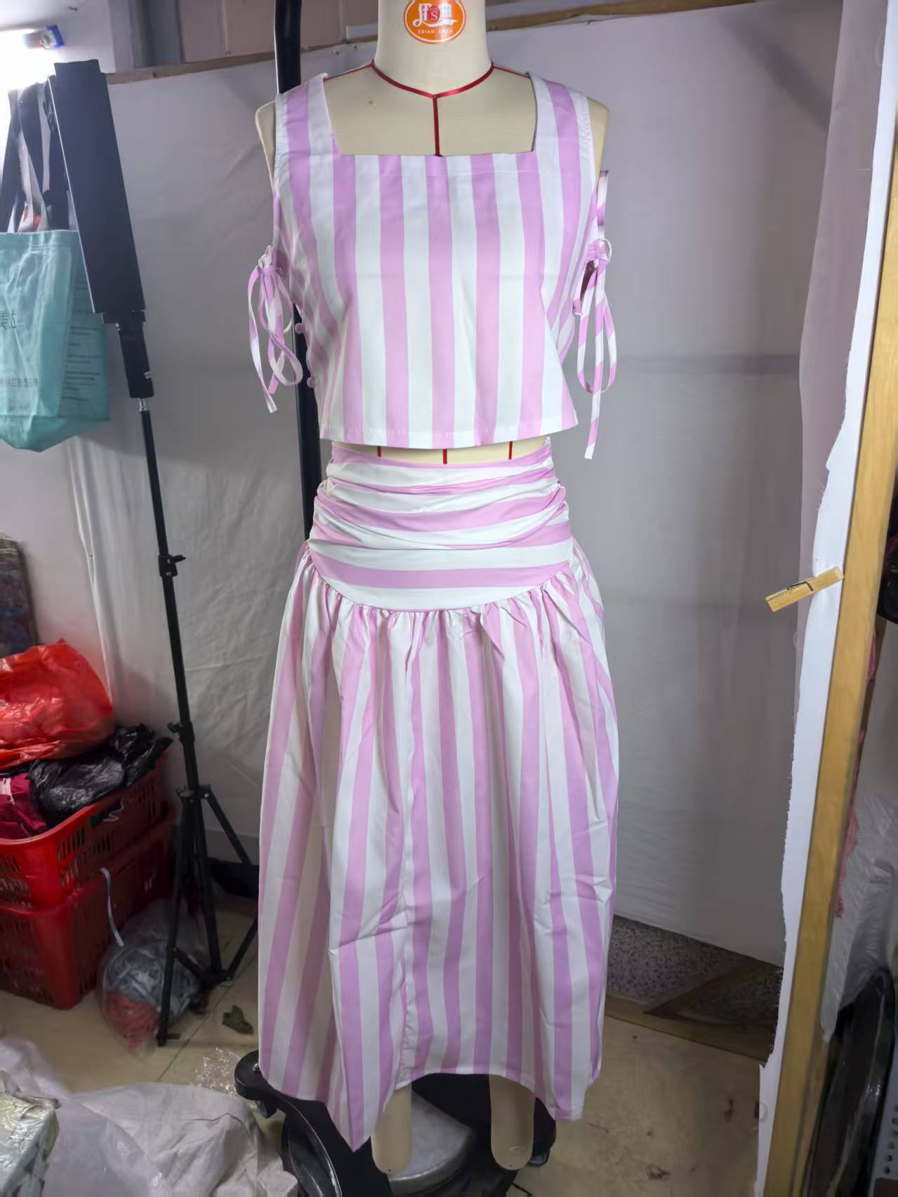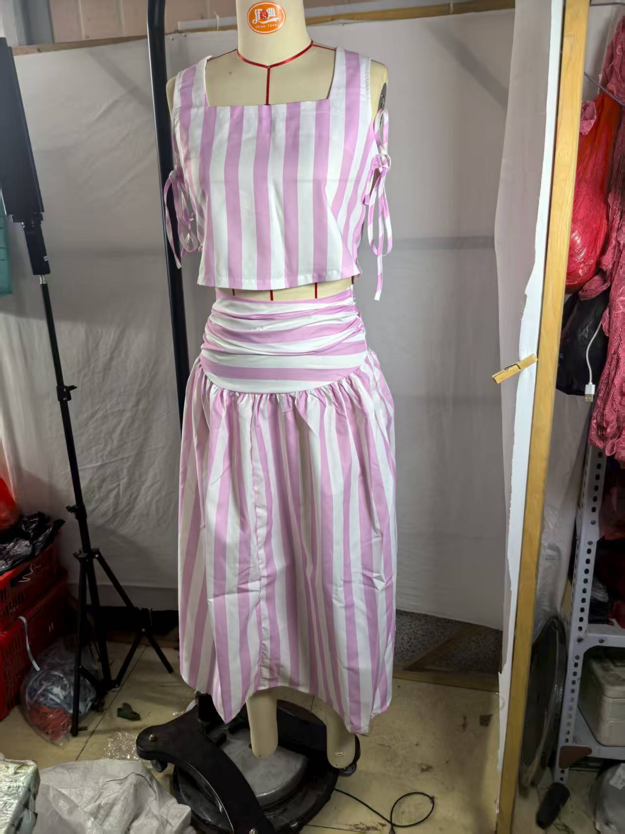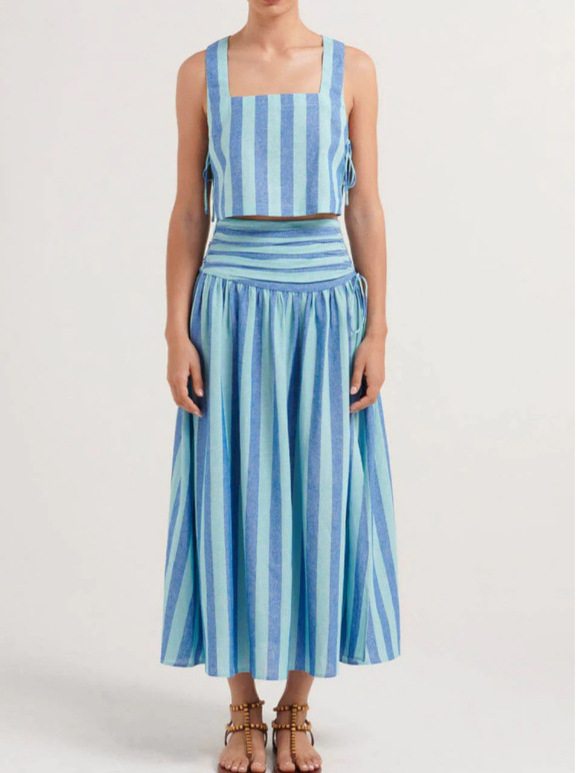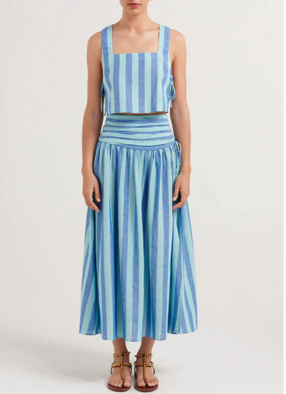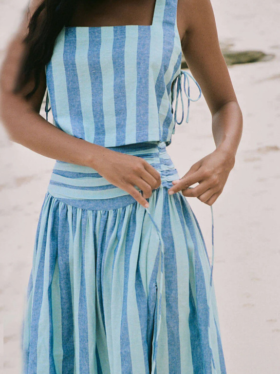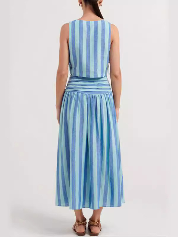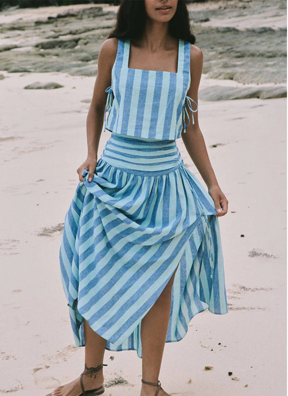 블루 스트라이프 2024 여름 스커트 여성의 우아한 복고풍 기질 슬리밍 A 라인 홀리데이 스타일 스윙 스커트