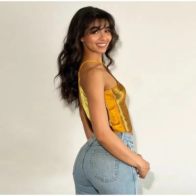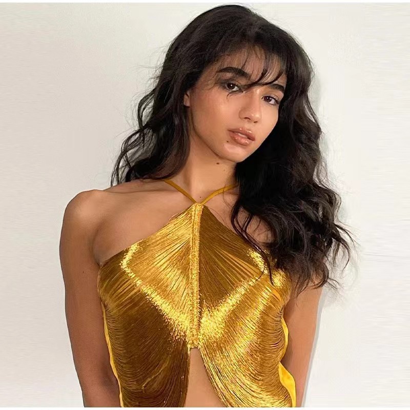 새로운 국경 간 대외 무역 유럽과 미국 스타일의 섹시한 오프 숄더 캐미솔 불규칙한 술 홀터 탑