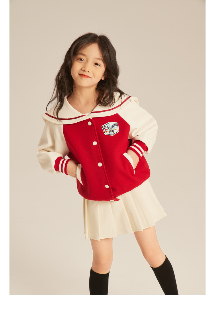 Amybaby Girl's Coat 2024 새로운 어린이 한국 스타일 유행 서양식 컬러 블록 캐주얼 해군 칼라 야구 세트스토어 가기