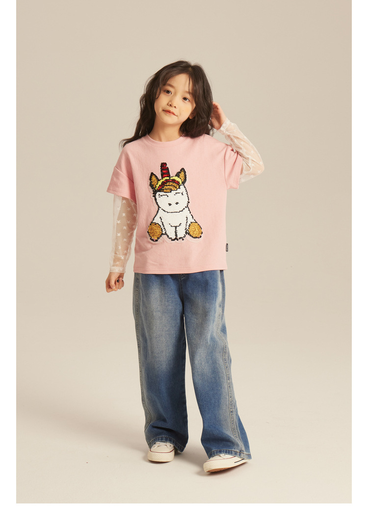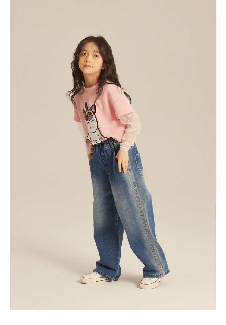 Amybaby Girls 'Jeans 2024 새로운 어린이 간단한 펜던트 넓은 다리 바지 세련된 캐주얼 바지