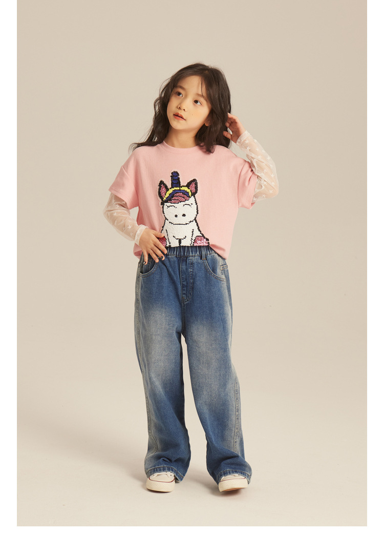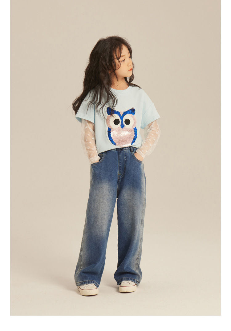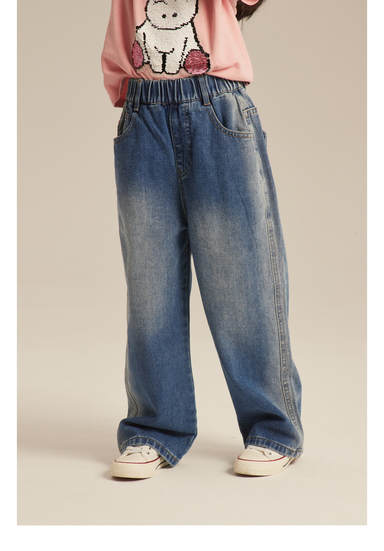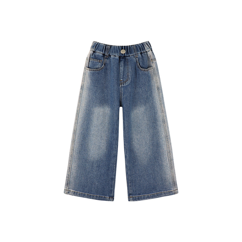 Amybaby Girls 'Jeans 2024 새로운 어린이 간단한 펜던트 넓은 다리 바지 세련된 캐주얼 바지스토어 가기