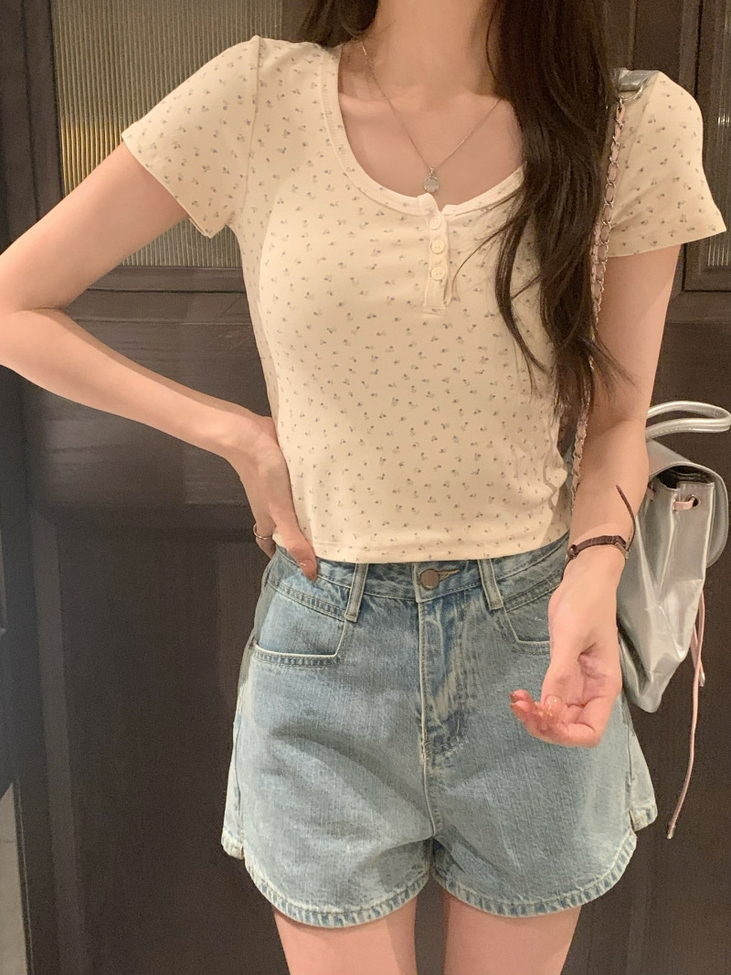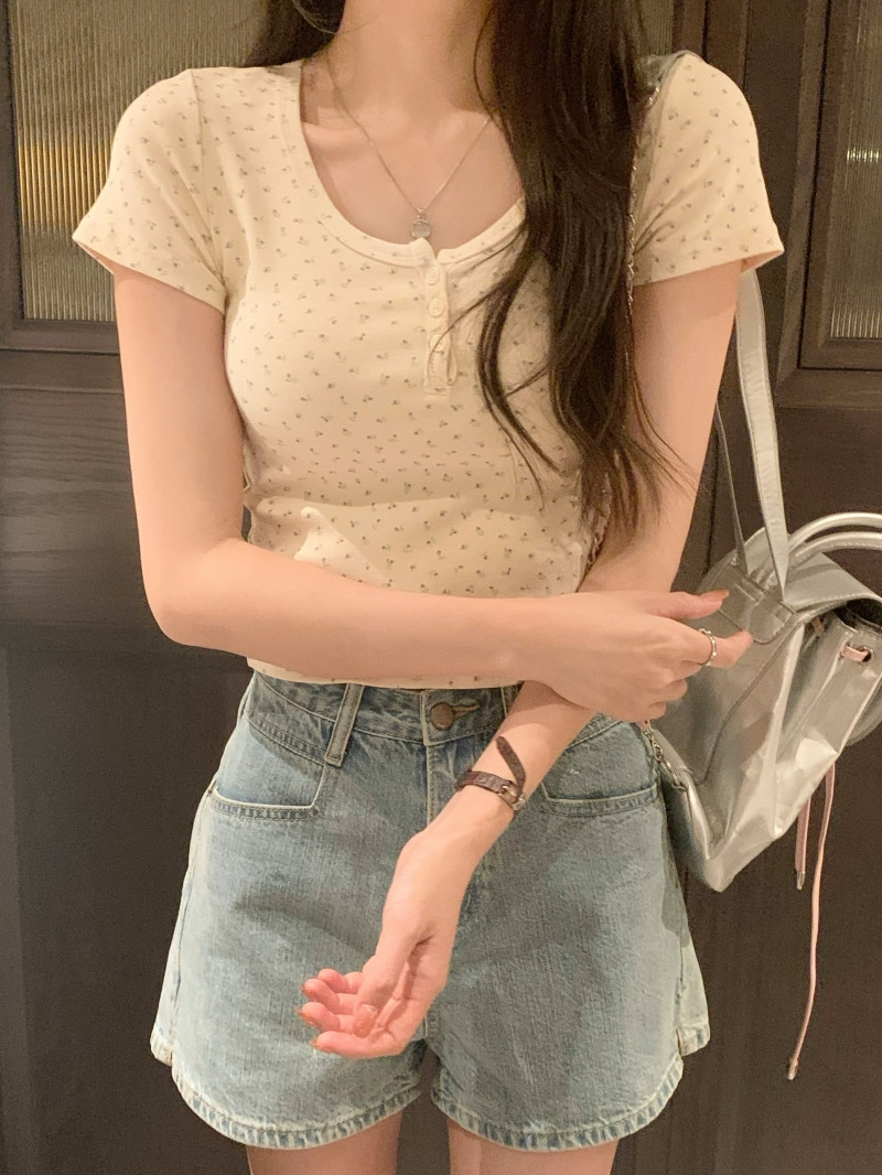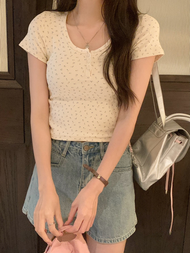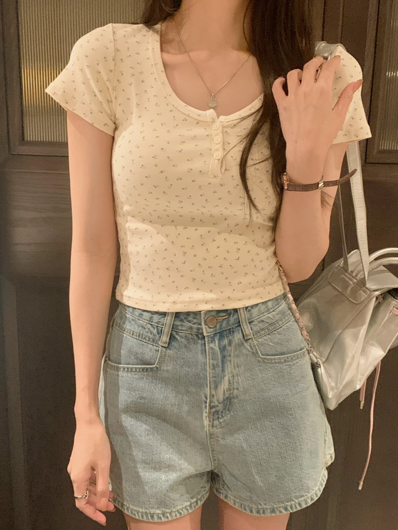 순수 버튼 플로럴 반팔 티셔츠 여성용 슬림 핏 짧은 바닥 셔츠 슬리밍 여름 BM 스타일 라운드 넥 숄더 탑스토어 가기
